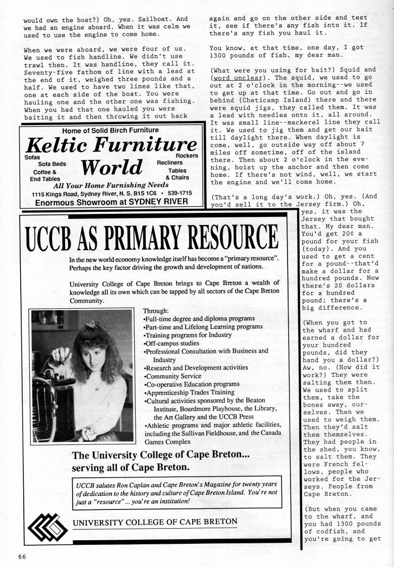 Published by Ronald Caplan on 1992/1/1 (397 reads)would own the boat?) Oh, yes. Sailboat. And we had an engine aboard. When it was calm we used to use the engine to come home. When we were aboard, we were four of us. We used to fish handline. We didn't use trawl then. It was handline, they call it. Seventy-five fathom of line with a lead at the end of it, weighed three pounds and a half. We used to have two lines like that, one at each side of the boat. You were hauling one and the other one was fishing. When you had that one hauled you were baiting it and then throwing it out back Home of Solid Birch Furniture Keltic Furniture Sofas Sofa Beds Coffee & End Tables World Rockers Recliners Tables & Chairs All Your Home Furnishing Needs mSKIngsRoad, Sydney River, N.S. B1S1C6 • 539-1715 Enormous Showroom at SYDNEY RIVER UCCB AS PRIARY RESOURCE In the new world economy knowledge itself has become a "primary resource". Perhaps the key factor driving the growth and development of nations. University College of Cape Breton brings to Cape Breton a wealth of knowledge all its own which can be tapped by all sectors of the Cape Breton Community. Through: • Full-time degree and diploma programs • Part-time and Lifelong Learning programs • Training programs for Industry • Off-campus studies • Professional Consultation with Business and Industry • Research and Development activities • Community Service • Co-operative Education programs • Apprenticeship Trades Training • Cultural activities sponsored by the Beaton Institute, Boardmore Playhouse, the Library, the Art Gallery and the UCCB Press • Athletic programs and major athletic facilities, including the Sullivan Fieldhouse, and the Canada Games Complex The University College of Cape Breton... serving all of Cape Breton. again and go on the other side and test it, see if there's any fish into it. If there's any fish you haul it. You know, at that time, one day, I got 1300 pounds of fish, my dear man. (What were you using for bait?) Squid and (word unclear). The squid, we used to go out at 2 o'clock in the morning--we used to get up at that time. Go out and go in behind (Cheticamp Island) there and there were squid jigs, they called them. It was a lead with needles onto it, all around. It was small line--mackerel line they call it. We used to jig them and get our bait till daylight there. When daylight is come, well, go outside way off about 7 miles off sometime, off of the island there. Then about 2 o'clock in the eve? ning, hoist up the anchor and then come home. If there's not wind, well, we start the engine and we'll come home. (That's a long day's work.) Oh, yes. (And you'd sell it to the Jersey firm.) Oh, yes, it was the Jersey that bought that. My dear man. You'd get 200 a pound for your fish (today). And you used to get a cent for a pound--that'd make a dollar for a hundred pounds. Now there's 20 dollars for a hundred pound: there's a big difference. UCCB salutes Ron Caplan and Cape Breton's Magazine for twenty years of dedication to the history and culture of Cape Breton Island. You're not just a "resource"... you're an institution! UNIVERSITY COLLEGE OF CAPE BRETON (When you got to the wharf and had earned a dollar for your hundred pounds, did they hand you a dollar?) Aw, no. (How did it work?) They were salting them then. We used to split them, take the bones away, our? selves . Then we used to weigh them. Then they'd salt them themselves. They had people in the shed, you know, to salt them. They were French fel? lows , people who worked for the Jer? seys. People from Cape Breton. (But when you came to the wharf, and you had 1300 pounds of codfish, and you're going to get 66
