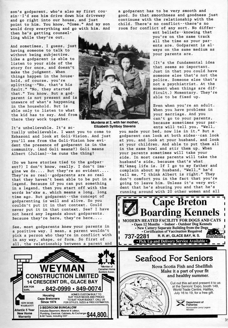 Published by Ronald Caplan on 1992/6/1 (228 reads)son's godparent, who's also my first cou? sin- -I'd see him drive down his driveway and go right into our house, and just point to him. You know, "Come." And my son would drop everything and go with him. And then he's getting counsel? ling while they're out. And sometimes, I guess, just having someone to talk to without being subjective. Like a godparent is able to listen to your side of the story for once, and doesn't make the judgment. When things happen in the house? hold, of course, you're splitting--"No, that's his fault." "No, they started that." You know. But a god? parent is not present and is unaware of what's happening in the household. But is able only to listen to what the kid has to say. And from there they work together. It's unbelievable. It's ac? tually unbelievable. I want you to come to Eskasoni and look at Goli-Vision. And just you'll see from the Goli-Vision how evi? dent the presence of godparent is in the community. (And Goli means?) Goli means Albert (Julian)--he runs the thing! (Do we have stories tied to the godpar? ent?) I don't know, really. I don't ima? gine we do.... But they're so evident.... They're so real--godparents are so real that they haven't been able to be put in a legend. Because if you can put something in a legend, then you start off with the words ke'skw a, which means a long, long time ago. But godparent--the concept of godparenting is well and alive. So you couldn't put it in that context. Could never put it in that context. See? I have not heard any legends about godparents. Because they're here, they're here.... See, most godparents knew your parents in a positive way. I mean, a parent wouldn't pick a person who they're in conflict with in any way, shape, or form. So first of all, the relationship between a parent and Murdena at 2, with her mother, Elizabeth Sylliboy Stevens a godparent has to be very smooth and good. So that smoothness and goodness just continues with the relationship with the child. There's no conflict--there's no room for conflict of any sort. No differ? ent beliefs--knowing that you're on the same track all the time as your par? ents are. Godparent is al? ways on the same medium as your parents are. (It's the fundamental idea that seems so important. Just in that you could have someone else that's not the police. Someone else that's not a psychiatrist. At the moment when things are dif? ficult.) Momentary. They're able to be fixed up. Even when you're an adult. When you have problems in your marriage. And you can't go to your parents, because sometimes your par? ents will tell you, "Well, you made your bed, now lie in it." But a godparent can look at both sides--can look at you. and look at your husband, and look at your children. And able to put them all in the same bowl and stir them up. When your parents sometimes will take your side. In most cases parents will take the husband's side, because that's what Mi'kmaq life is. If I go to my father and complain about my husband. "Well," he'd tell me, "I think Albert is right." They don't comfort you in the fact that you're going to leave him. Unless it's very evi? dent that he's abusing you and that he's running around with 20 other women and all Cape Breton Boarding Kennels MODERN HEATED FACILITY FOR DOGS AND CATS • Open 12 Months • Indoor - Outdoor Dog Kennels • New Cattery Separate Building from the Dogs 'g'y, • Certification of Vaccination Required JpBRl 737-2281 R.R.#1, GLACE BAY, N.S. g' • Pick Up and Delivery Service Available • J WEYMAN CONSTRUCTION LIMITED 14 CRESCENT DR., GLACE BAY SSl"" • ? 842-0999 ?? 849-0074 'Member of Canadian Home Builders Assoc. 4 Housing Cape Bretoners Since 1974 HOMES CUSTOM BUILT TO SUIT YOUR NEEDS AND PRICED TO SUIT YOUR BUDGET. CALL US FOR STYLES, SIZES & FREE ESTIMATES. Atlantic 5 Year New IHome Warranty 3 BEDROOM BUNGALOW Includes Basement, Material & Labour, Plumbing, Electrical, Cabinets, Air Exchanger & All Taxes, including GST $44,800.