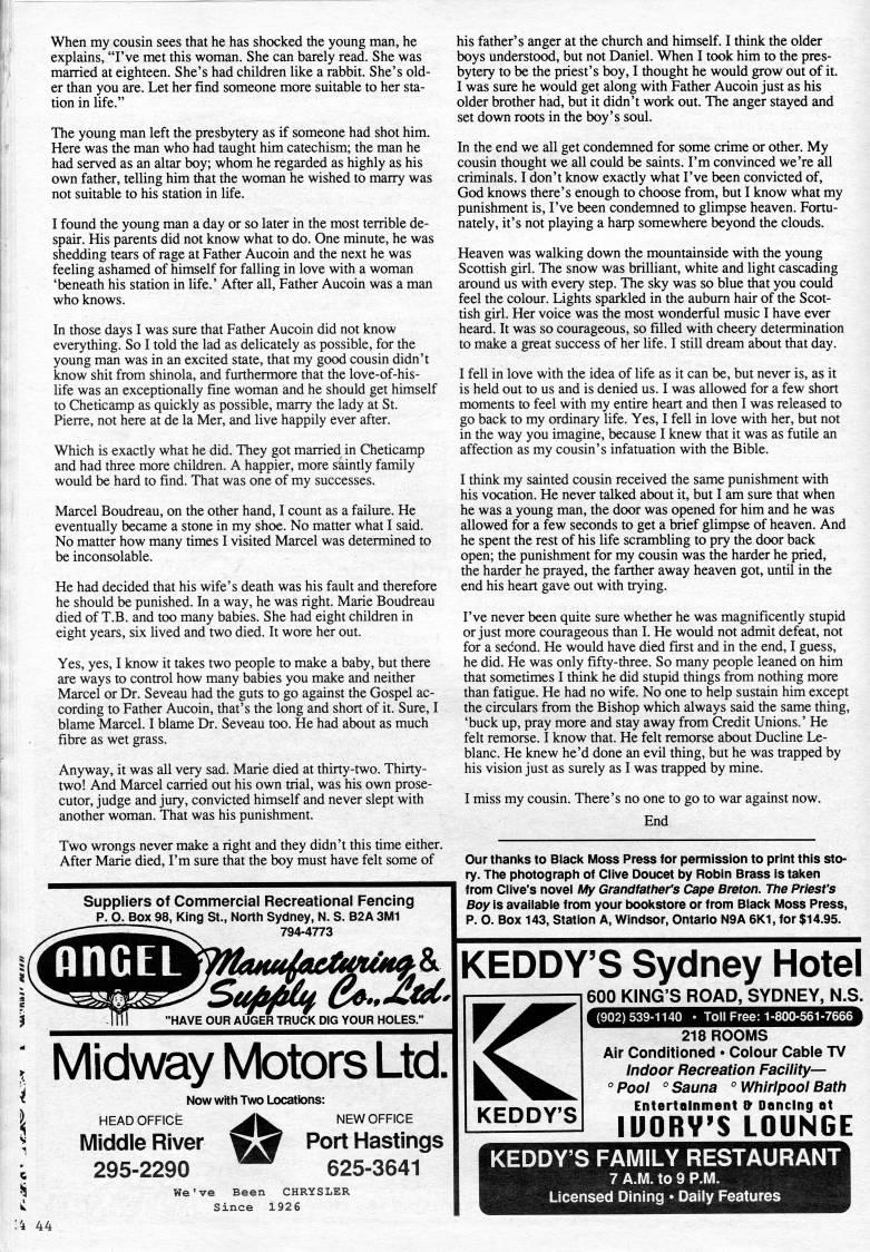 Published by Ronald Caplan on 1992/6/1 (260 reads)When my cousin sees that he has shocked the young man, he explains, "I've met this woman. She can barely read. She was married at eighteen. She's had children like a rabbit. She's old? er than you are. Let her find someone more suitable to her sta? tion in life." The young man left the presbytery as if someone had shot him. Here was the man who had taught him catechism; the man he had served as an altar boy; whom he regarded as highly as his own father, telling him that the woman he wished to marry was not suitable to his station in life. I found the young man a day or so later in the most terrible de? spair. His parents did not know what to do. One minute, he was shedding tears of rage at Father Aucoin and the next he was feeling ashamed of himself for falling in love with a woman 'beneath his station in life.' After all. Father Aucoin was a man who knows. In those days I was sure that Father Aucoin did not know everything. So I told the lad as delicately as possible, for the young man was in an excited state, that my good cousin didn't know shit from shinola, and furthermore that the love-of-his- life was an exceptionally fine woman and he should get himself to Cheticamp as quickly as possible, marry the lady at St. Pierre, not here at de la Mer, and live happily ever after. Which is exactiy what he did. They got married in Cheticamp and had three more children. A happier, more saintly family would be hard to find. That was one of my successes. Marcel Boudreau, on the other hand, I count as a failure. He eventually became a stone in my shoe. No matter what I said. No matter how many times I visited Marcel was determined to be inconsolable. He had decided that his wife's death was his fault and therefore he should be punished. In a way, he was right. Marie Boudreau died of T.B. and too many babies. She had eight children in eight years, six lived and two died. It wore her out. Yes, yes, I know it takes two people to make a baby, but there are ways to control how many babies you make and neither Marcel or Dr. Seveau had the guts to go against the Gospel ac? cording to Father Aucoin, that's the long and short of it. Sure, I blame Marcel. I blame Dr. Seveau too. He had about as much fibre as wet grass. Anyway, it was all very sad. Marie died at thirty-two. Thirty- two! And Marcel carried out his own trial, was his own prose? cutor, judge and jury, convicted himself and never slept with another woman. That was his punishment. Two wrongs never make a right and they didn't this time either. After Marie died, I'm sure that the boy must have felt some of Suppliers of Commercial Recreational Fencing p. O. BOX98, King St., North Sydney, N. S. B2A3M1 794-4773 his father's anger at the church and himself I think the older boys understood, but not Daniel. When I took him to the pres? bytery to be the priest's boy, I thought he would grow out of it. I was sure he would get along with Father Aucoin just as his older brother had, but it didn't work out. The anger stayed and set down roots in the boy's soul. In the end we all get condemned for some crime or other. My cousin thought we all could be saints. I'm convinced we're all criminals. I don't know exactly what I've been convicted of, God knows there's enough to choose from, but I know what my punishment is, I've been condemned to glimpse heaven. Fortu? nately, it's not playing a harp somewhere beyond the clouds. Heaven was walking down the mountainside with the young Scottish girl. The snow was brilliant, white and light cascading around us with every step. The sky was so blue that you could feel the colour. Lights sparkled in the auburn hair of the Scot? tish girl. Her voice was the most wonderful music I have ever heard. It was so courageous, so filled with cheery determination to make a great success of her life. I still dream about that day. I fell in love with the idea of life as it can be, but never is, as it is held out to us and is denied us. I was allowed for a few short moments to feel with my entire heart and then I was released to go back to my ordinary life. Yes, I fell in love with her, but not in the way you imagine, because I knew that it was as futile an affection as my cousin's infatuation with the Bible. I think my sainted cousin received the same punishment with his vocation. He never talked about it, but I am sure that when he was a young man, the door was opened for him and he was allowed for a few seconds to get a brief glimpse of heaven. And he spent the rest of his life scrambling to pry the door back open; the punishment for my cousin was the harder he pried, the harder he prayed, the farther away heaven got, until in the end his heart gave out with trying. I've never been quite sure whether he was magnificentiy stupid or just more courageous than I. He would not admit defeat, not for a second. He would have died first and in the end, I guess, he did. He was only fifty-three. So many people leaned on him that sometimes I think he did stupid things from nothing more than fatigue. He had no wife. No one to help sustain him except the circulars from the Bishop which always said the same thing, 'buck up, pray more and stay away from Credit Unions.' He felt remorse. I know that. He felt remorse about Ducline Le? blanc. He knew he'd done an evil thing, but he was trapped by his vision just as surely as I was trapped by mine. I miss my cousin. There's no one to go to war against now. End Our thanks to Black Moss Press for permission to print this sto? ry. The photograph of Clive Doucet by Robin Brass is taken from Olive's novel My Grandfather's Cape Breton. The Priest's Boy is available from your bookstore or from Black Moss Press, P. O. Box 143, Station A, Windsor, Ontario N9A 6K1, for $14.95. HAVE OUR AUGER TRUCK DIG YOUR HOLES." Midway Motors Ltd. iHh Tw) Loc ' Now with Tw) Locattons: I HEAD OFFICE '' NEW OFFICE ' Middle River wSf Port Hastings c 295-2290 "' 625-3641 '.'i 44 We
