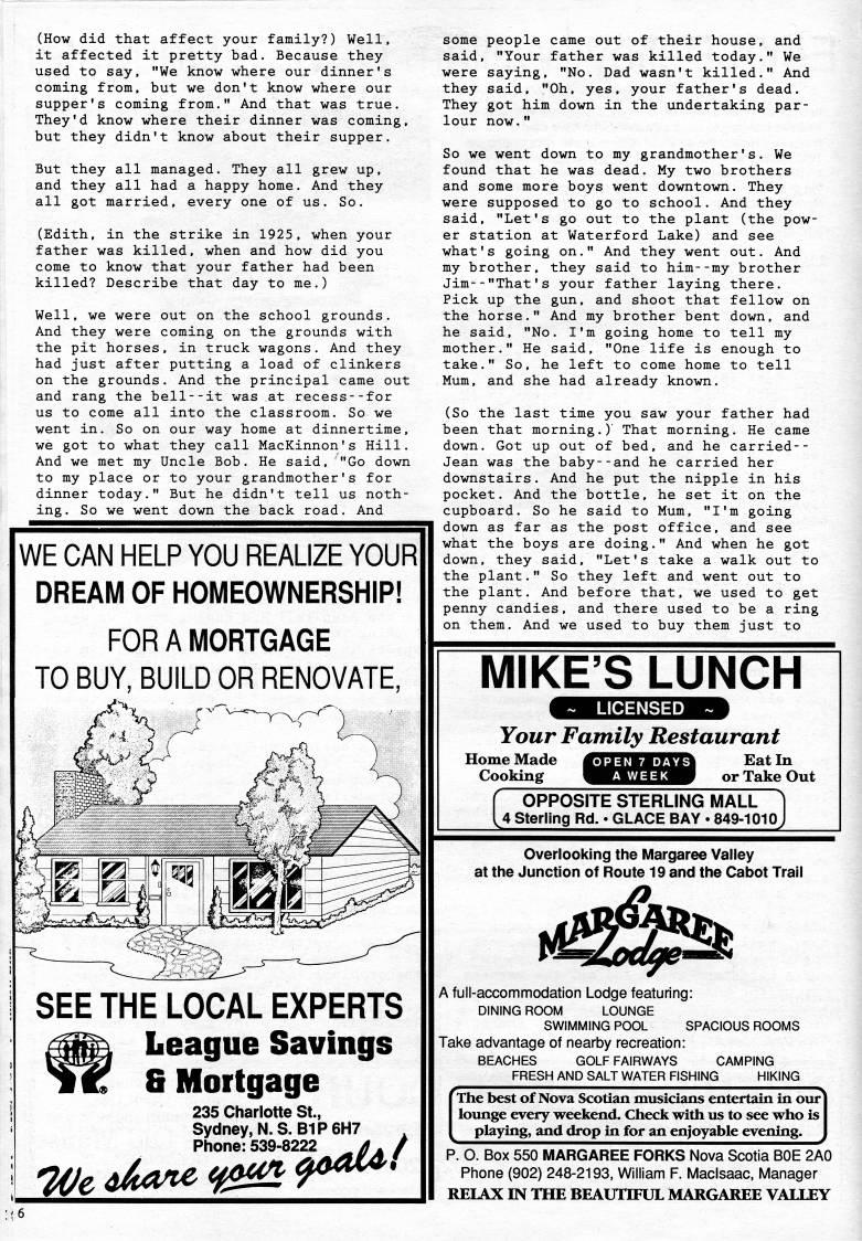 Published by Ronald Caplan on 1992/6/1 (392 reads)(How did that affect your family?) Well, it affected it pretty bad. Because they used to say, "We know where our dinner's coming from, but we don't know where our supper's coming from." And that was true. They'd know where their dinner was coming, but they didn't know about their supper. But they all managed. They all grew up, and they all had a happy home. And they all got married, every one of us. So. (Edith, in the strike in 1925, when your father was killed, when and how did you come to know that your father had been killed? Describe that day to me.) Well, we were out on the school grounds. And they were coming on the grounds with the pit horses, in truck wagons. And they had just after putting a load of clinkers on the grounds. And the principal came out and rang the bell--it was at recess--for us to come all into the classroom. So we went in. So on our way home at dinnertime, we got to what they call MacKinnon's Hill. And we met my Uncle Bob. He said, "Go down to my place or to your grandmother's for dinner today." But he didn't tell us noth? ing. So we went down the back road. And WE CAN HELP YOU REALIZE YOUR DREAM OF HOIUIEOWNERSHIP! FORAII/JORTGAGE TO BUY, BUILD OR RENOVATE, SEE THE LOCAL EXPERTS League Savings 8 Mortgage 235 Charlotte St., Sydney, N.S. BIP6H7 Phone:539.8222 -/. / some people came out of their house, and said, "Your father was killed today." We were saying, "No. Dad wasn't killed." And they said, "Oh, yes, your father's dead. They got him down in the undertaking par? lour now." So we went down to my grandmother's. We found that he was dead. My two brothers and some more boys went downtown. They were supposed to go to school. And they said, "Let's go out to the plant (the pow? er station at Waterford Lake) and see what's going on." And they went out. And my brother, they said to him--my brother Jim--"That's your father laying there. Pick up the gun, and shoot that fellow on the horse." And my brother bent down, and he said, "No. I'm going home to tell my mother." He said, "One life is enough to take." So, he left to come home to tell Mum, and she had already known. (So the last time you saw your father had been that morning.)' That morning. He came down. Got up out of bed, and he carried-- Jean was the baby--and he carried her downstairs. And he put the nipple in his pocket. And the bottle, he set it on the cupboard. So he said to Mum, "I'm going down as far as the post office, and see what the boys are doing." And when he got down, they said, "Let's take a walk out to the plant." So they left and went out to the plant. And before that, we used to get penny candies, and there used to be a ring on them. And we used to buy them just to MIKE'S LUNCH ' LICENSED ' Your Family Restaurant Home Made 'SSDDEE& ''' '' Cooking mOQI'glP or Take Out [ OPPOSITE STERLING MALL '4 Sterling Rd.? GLACE BAY ??849-1010 Overlooking the Margaree Valley at the Junction of Route 19 and the Cabot Trail A full-accommodation Lodge featuring: DINING ROOM LOUNGE SWIMMING POOL SPACIOUS ROOMS Take advantage of nearby recreation: BEACHES GOLF FAIRWAYS CAMPING FRESH AND SALT WATER FISHING HIKING The best of Nova Scotian musicians entertain in our loiuige every weekend. Check with us to see who is playing, and drop in for an enjoyable evening. P. O. Box 550 MARGAREE FORKS Nova Scotia BOE 2A0 Phone (902) 248-2193, William F. Maclsaac, Manager RELAX IN THE BEAUTIFUL MARGAREE VALLEY