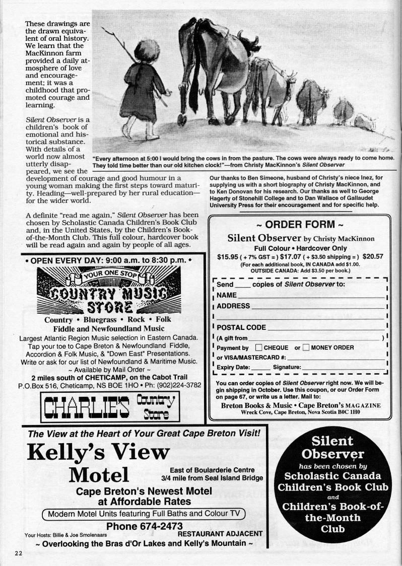 These drawings are the drawn equiva? lent of oral history. We leam that the MacKinnon farm provided a daily at? mosphere of love and encourage? ment; it was a childhood that pro? moted courage and learning. Silent Observer is a children's book of emotional and his? torical substance. With details of a world now almost utterly disap? peared, we see the development of courage and good humour in a young woman making the first steps toward maturi? ty. Heading • 'well-prepared by her rural education • for the wider world. A definite "read me again," Silent Observer has been chosen by Scholastic Canada Children's Book Club and, in the United States, by the Children's Book- of-the-Month Club. This full colour, hardcover book will be read again and again by people of all ages. , ,'i • ' "Every afternoon at 5:001 would bring the They told time better than our old kitchen cows in from the pasture. The cows were always ready to come home, clock!" • from Christy MacKinnon's Silent Observer Our thanks to Ben Simeone, husband of Christy's niece Inez, for supplying us with a short biography of Christy MacKinnon, and to Ken Donovan for his research. Our thanks as well to George Hagerty of Stonehili College and to Dan Wallace of Gallaudet University Press for their encouragement and for specific help. • OPEN EVERY DAY: 9:00 a.m. to 8:30 p.m. 'M?T?SlV JflJJSjJ Country • Bluegrass • Rock • Folk Fiddle and Newfoundland Music Largest Atlantic Region Music selection in Eastern Canada. Tap your toe to Cape Breton & Newfoundland Fiddle, Accordion & Folk Music, & "Down East" Presentations. Write or ask for our list of Newfoundland & Maritime Music. ~ Available by Mail Order ~ 2 miles south of CHETICAMP, on the Cabot Trail P.O.Box 516, Cheticamp, NS BOE 1H0 • Ph: (902)224-3782 CTJART Tpr' Osuntry - ORDER FORM ~ Silent Observer by Christy MacKinnon Full Colour • Hardcover Only $15.95 (+ 7% GST =) $17.07 (+ $3.50 shipping =) $20.57 (For each additional book, IN CANADA add $1.00. OUTSIDE CANADA: Add $3.50 per book.) Send copies of Silent Observer to: |NAME 1 1 ADDRESS 1 1 POSTAL CODE ' • (A gift from ) • ' Payment by D CHEQUE or Q MONEY ORDER ' ' or VISA/MASTERCARD #: ' Expiry Date: Signature: . 1 You can order copies of Silent Observer right now. We will be? gin shipping in October. Use this coupon, or our Order Form on page 67, or write us a letter. Mail to: Breton Books & Music • Cape Breton's magazine Wreck Cove, Cape Breton, Nova Scotia BOC IHO The View at the Heart of Your Great Cape Breton Visit! Kelly's View Motel East of Boularderie Centre 3/4 mile from Seal Island Bridge Cape Breton's Newest Motel at Affordable Rates (J/iodern Motel Units featuring Full Baths and Colour TnT) Phone 674-2473 Your Hosts: Billie & Joe Smolenaars RESTAURANT ADJACENT ~ Overlooking the Bras d'Or Lakes and Kelly's Mountain ~ Silent Observer has been chosen by Scholastic Canada Children's Book Club and Children's Book-of- the-Month Club