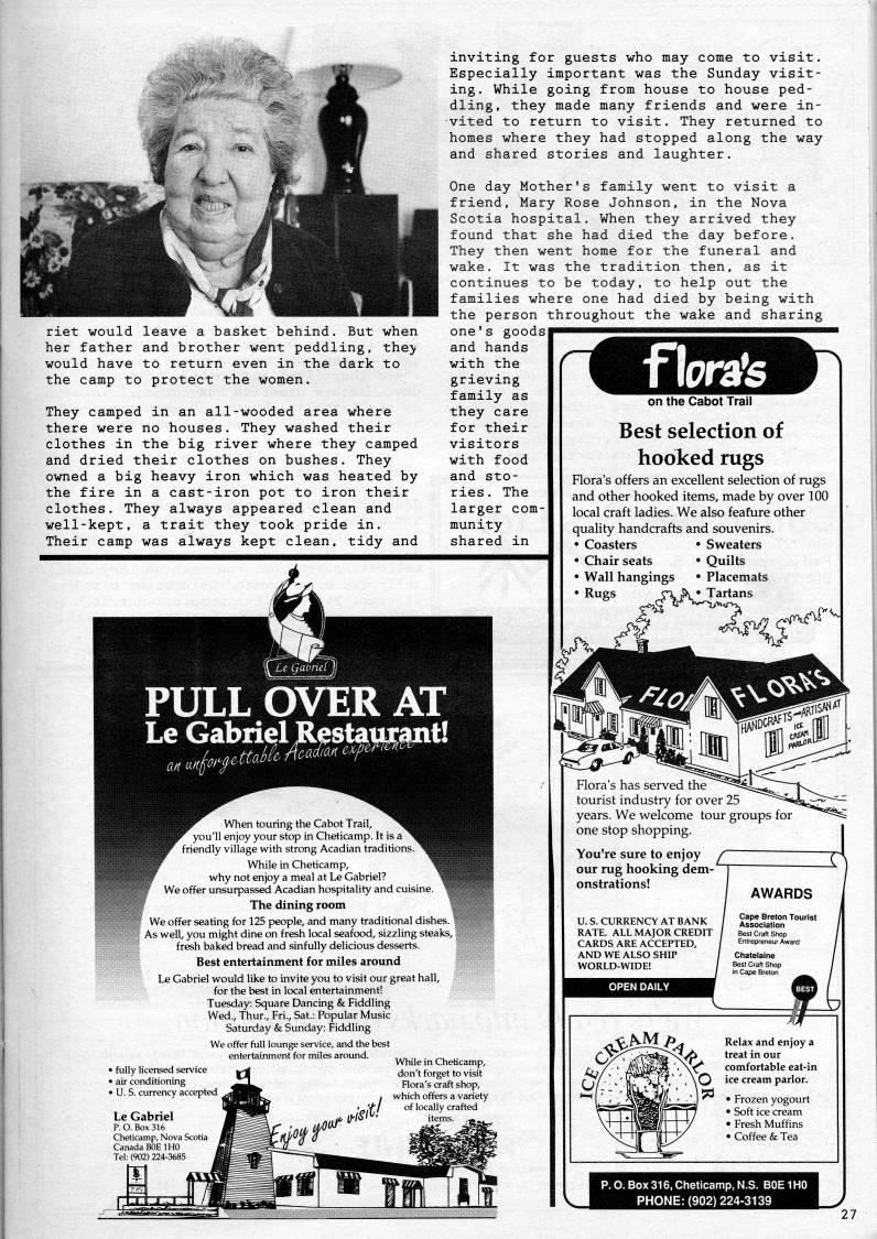 riet would leave a basket behind. But when her father and brother went peddling, they would have to return even in the dark to the camp to protect the women. They camped in an all-wooded area where there were no houses. They washed their clothes in the big river where they camped and dried their clothes on bushes. They owned a big heavy iron which was heated by the fire in a cast-iron pot to iron their clothes. They always appeared clean and well-kept, a trait they took pride in. Their camp was always kept clean, tidy and inviting for guests who may come to visit. Especially important was the Sunday visit? ing. While going from house to house ped? dling, they made many friends and were in? vited to return to visit. They returned to homes where they had stopped along the way and shared stories and laughter. One day Mother's family went to visit a friend, Mary Rose Johnson, in the Nova Scotia hospital. When they arrived they found that she had died the day before. They then went home for the funeral and wake. It was the tradition then, as it continues to be today, to help out the families where one had died by being with the person throughout the wake and sharing one's goods and hands with the grieving family as they care for their visitors with food and sto? ries . The larger com? munity shared in on the Cabot Trail Best selection of hooked rugs Flora's offers an excellent selection of rugs and other hooked items, made by over 100 local craft ladies. We also feafure other quality handcrafts and souvenirs. • Coasters • Sweaters • Chair seats • Quilts • Wall hangings • Placemats • Rugs S.'' Tartans When touring the Cabot Trail, '' you'll enjoy your stop in Cheticamp. It is a ' friendly village with strong Acadian traditions. ' While in Cheticamp, why not enjoy a meal at Le Gabriel? We offer unsurpassed Acadian hospitality and cuisine. The dining room We offer seating for 125 people, and many traditional dishes. ' As well, you might dine on fresh local seafood, sizzling steaks, fresh baked bread and sinfully delicious desserts. Best entertainment for miles around Le Gabriel would like to iiwite you to visit our great hall, for the best in local entertainment! Tuesday: Square Dancing & Fiddling Wed., Thur., Fri., Sat.: Popular Music Saturday & Sunday: Fiddling • fully licensed service • air conditioning • U. S. currency accepted Le Gabriel p. O. Box 316 Cheticamp, Nova Scotia Canada BOE IHO Tel: (902) 224-3685 While in Cheticamp, don't forget to visit Hera's craft shop, which offers a variety of locally crafted items. Flora's has served t tourist industry for over 25 years. We welcome tour groups for one stop shopping. You're sure to enjoy /' our rug hooking dem? onstrations!