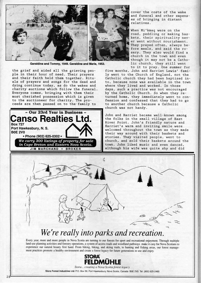 Geraldine and Tommy, 1949. Geraldine and Marie, 1953. the grief and aided all the grieving peo? ple in their hour of need. Their prayers and their faith held them together. Ritu? als of prayers and songs for the dead and dying continue today, as do the wakes and charity auctions which follow the funeral. Everyone comes, bringing with them their most cherished possession which is given to the auctioneer for charity. The pro? ceeds are then passed on to the family to ~ Our 23rd Year in Business -' Canso Realties Ltd. Box 727 Port Hawkesbury, N. S. BOE 2V0 • Phone (902) 625-0302 • We carry 300 listings of property for sale in Cape Breton and Eastem Nova Scotia. JIM MARCHAND ?? BROKER (' cover the costs of the wake and funeral and other expens? es of bringing in distant relatives. When Mi'kmaq were on the road, peddling or making bas? kets, their spirituality nev? er went without nourishment. They prayed often, always be? fore meals, and said the ro? sary. They also would find a church in the town and even though it may not be a Catho? lic church, they still went to it to pray. One summer for five months, John and Harriet Lewis' fami? ly went to the Church of England, not the Catholic church they had been baptized in? to, because none was available in the town where they lived and worked. In those days, such a practice was not encouraged by the Catholic Church. So when they re? turned home, they immediately went to con? fession and confessed that they had to go to another church because a Catholic church was not handy. John and Harriet became well-known among the folks in the small village of East River Point. John's friendly nature and Harriet's warm and inviting smile were welcomed throughout the town as they made their way around with their baskets and stories. They visited people, went to church, and sold their baskets around the town. John liked music and even danced, although his wife was quite shy and did We 're really into parks and recreation. Every year, more and more people in Nova Scotia are tuming to our forests for sport and recreational enjoyment. Through multiple land-use planning activities and forestry operations, a system of access roads and woodland pathways make it easy for Nova Scotians to experience our natural beauty first hand. From hiking, biking, and skiing trails, to hunting and fishing areas, our forest manage? ment practices promote a healthy environment and create a forest legacy for future generations to use and enjoy. STORA' .. FELDMUHLE Stora... creating a Nova Scotia forest legacy. Stora Forest Industries Ltd. P.O. Box 59, Port Hawkesbury, Nova Scotia, Canada BOE 2V0 Tel. (902) 625-2460