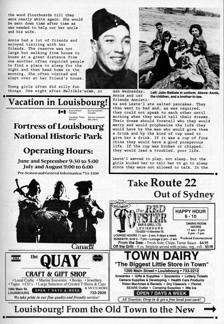 the wood floorboards till they were nearly white again. She would be sent down time after time as was needed to help out her uncle and his wife. Annie had a lot of friends and enjoyed visiting with her friends. The reserve was not large but walking from house to house at a great distance from one another often required people to find a place to sleep for the night and then head home in the morning. She often visited and slept over at her friend's house. Young girls often did silly fun things. One night after Maltikle'wimk Vacation in Louisbourg! I''i Environment Fortress of Louisbourg National Historic Park Operating Hours: June and September 9:30 to 5:00 July and August 9:00 to 6:00 Pre-Season and General Information 733-3100 Ash Wednesday. Left: John Battiste in uniform. Above: Annie, Annie and ner the ciiildren, and a brother-in-law. friends Annieti- na and Leste'l ate salted pancakes. They then went to bed and, as was required, they could not speak to each other until morning when they would tell their dreams. Their dream should foretell who they would marry and would prophesize the life they would have by the man who would give them a drink and by the kind of cup used to give her a drink. If it was a cup of fine china they would have a good prosperous life. If the cup was broken or chipped, they would lead a troubled, poor life. Leste'l wanted to play, not sleep, but the girls kicked her to tell her to go to sleep since they were not allowed to talk. In the Take Route 22 Out of Sydney BAR & GRILL LTD. 'Tn'f.S?'" LOUISBOURG iio? Vnm 733-2333 • 9 Aberdeen St. " nm " 7 om LOUNGE HOURS 11 am - 2 am, 6 days a week ' SUNDAYS: Grill 2 - 7 pm • Lounge 2 pm - 2 am Weekend Entertainment From the Sea: - Fresh Sole, Chips, Tartar Sauce - $4.95 Off the Grili: - 8 oz. Striploin served with potato, veg., roll - $5.95 = 'QUAY CRAFT Si GIFT SHOP • Local Crafts • Marine Souvenirs • Books • Jewellery • Tapes • CD's • Large Selection of Crested T-Shirts & Caps 1360 Main St. g.iJjmi.nilJiMUIJJ'l ''''CHMORE LOUISBOURG ??'liiiwiiir • laai 733-2936 We take pride in our fine quality and friendly service! TOWN DAIRY "The Biggest Littie Store in Town" 1290 Main Street • Louisbourg • 733-2212 Groceries • Gifts & Supplies • Souvenirs • Lottery Tickets Camera Supplies & Developing • Health Care Products Video Machines & Rentals • Dry Cleaners • Florist SEARS Outlet • Camping Supplies • 990 Ice OPEN 7 DAYS A WEEK Q All Tourists: Drop in & get a free local post card! ) Louisbourg! From the Old Town to the New
