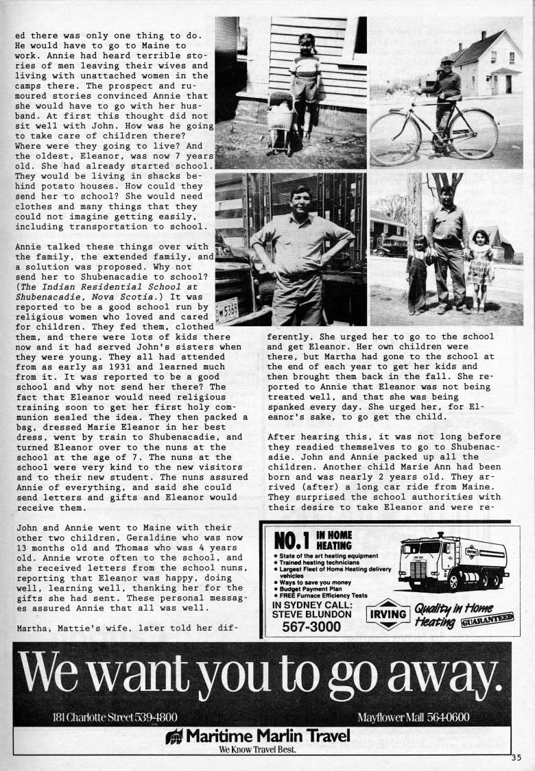 ed there was only one thing to do. He would have to go to Maine to work. Annie had heard terrible sto? ries of men leaving their wives and living with unattached women in the camps there. The prospect and ru? moured stories convinced Annie that she would have to go with her hus? band. At first this thought did not sit well with John. How was he going to take care of children there? Where were they going to live? And the oldest, Eleanor, was now 7 years old. She had already started school. They would be living in shacks be? hind potato houses. How could they send her to school? She would need clothes and many things that they could not imagine getting easily, including transportation to school. Annie talked these things over with the family, the extended family, and a solution was proposed. Why not send her to Shubenacadie to school? (The Indian Residential School at Shubenacadie, Nova Scotia.) It was reported to be a good school run by religious women who loved and cared for children. They fed them, clothed them, and there were lots of kids there now and it had served John's sisters when they were young. They all had attended from as early as 1931 and learned much from it. It was reported to be a good school and why not send her there? The fact that Eleanor would need religious training soon to get her first holy com? munion sealed the idea. They then packed a bag, dressed Marie Eleanor in her best dress, went by train to Shubenacadie, and turned Eleanor over to the nuns at the school at the age of 7. The nuns at the school were very kind to the new visitors and to their new student. The nuns assured Annie of everything, and said she could send letters and gifts and Eleanor would receive them. John and Annie went to Maine with their other two children, Geraldine who was now 13 months old and Thomas who was 4 years old. Annie wrote often to the school, and she received letters from the school nuns, reporting that Elearior was happy, doing well, learning well, thanking her for the gifts she had sent. These personal messag? es assured Annie that all was well. Martha, Mattie's wife, later told her dif? ferently. She urged her to go to the school and get Eleanor. Her own children were there, but Martha had gone to the school at the end of each year to get her kids and then brought them back in the fall. She re? ported to Annie that Eleanor was not being treated well, and that she was being spanked every day. She urged her, for El? eanor's sake, to go get the child. After hearing this, it was not long before they readied themselves to go to Shubenac? adie. John and Annie packed up all the children. Another child Marie Ann had been born and was nearly 2 years old. They ar? rived (after) a long car ride from Maine. They surprised the school authorities with their desire to take Eleanor and were re- IIA 1 INHOIME IIV?I HEATING • State of the art heating equipment • Trained heating technicians • Largest Fleet of Home Heating delivery • Ways to save you money • Budget Payment Plan • FREE Fumace Efficiency Tests IN SYDNEY CALL: STEVE BLUNDON i IRVING 567-3000 ''' We want you to go away. 181 Charlotte Street 5394800 MavflowerMaU 5640600 I Maritime Mariin Travel We Know Travel Best. 35