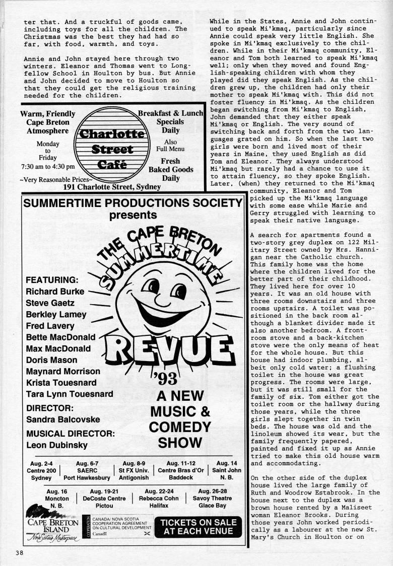 ter that. And a truckful of goods came, including toys for all the children. The Christmas was the best they had had so far, with food, warmth, and toys. Annie and John stayed here through two winters. Eleanor and Thomas went to Long? fellow School in Houlton by bus. Eut Annie and John decided to move to Houlton so that they could get the religious training needed for the children. Warm, Friendly Cape Breton Atmosphere Monday to Friday 7:30 am to 4:30 pm -Very Reasonable Prices- Breakfast & Lunch Specials Daily 191 Charlotte Street, Sydney Fresh Baked Goods Daily SUMMERTIME PRODUCTIONS SOCIETY presents FEATURING: Richard Burke Steve Gaetz Berkley Lamey Fred Lavery Bette MacDonald Max MacDonald Doris Mason Maynard Morrison Krista Touesnard Tara Lynn Touesnard DIRECTOR: Sandra Balcovske MUSICAL DIRECTOR: Leon Dubinsky '93' ANEW MUSIC & COMEDY SHOW Aug. 2-4 Aug. 6-7 Aug. 8-9 Aug. 11-12 Centre 200 | SAERC | St FX Univ. Centre Bras d'Or Sydney Port Hawkesbury Antigonish Baddeck Aug. 16 IVIoncton N.B. Aug. 19-21 DeCoste Centre Pictou Aug. 22-24 Rebecca Cohn Halifax Cape Breton Island I CANADA/ NOVA SCOTIA I COOPERATION AGREEMENT ON CULTURAL DEVELOPMENT TICKETS ON SALE AT EACH VENUE While in the States. Annie and John contin? ued to speak Mi'kmaq, particularly since Annie could speak very little English. She spoke in Mi'kmaq exclusively to the chil? dren. While in their Mi'kmaq community, El? eanor and Tom both learned to speak Mi'kmaq well; only when they moved and found Eng? lish-speaking children with whom they played did they speak English. As the chil? dren grew up, the children had only their mother to speak Mi'kmaq with. This did not foster fluency in Mi'kmaq. As the children began switching from Mi'kmaq to English, John demanded that they either speak Mi'kmaq or English. The very sound of switching back and forth from the two lan? guages grated on him. So when the last two girls were born and lived most of their years in Maine, they used English as did Tom and Eleanor. They always understood Mi'kmaq but rarely had a chance to use it to attain fluency, so they spoke English. Later, (when) they returned to the Mi'kmaq community, Eleanor and Tom picked up the Mi'kmaq language with some ease while Marie and Gerry struggled with learning to speak their native language. A search for apartments found a two-story grey duplex on 122 Mil? itary Street owned by Mrs. Hanni- gan near the Catholic church. This family home was the home where the children lived for the better part of their childhood. They lived here for over 10 years. It was an old house with three rooms downstairs and three rooms upstairs. A toilet was po? sitioned in the back room al? though a blanket divider made it also another bedroom. A front- room stove and a back-kitchen stove were the only means of heat for the whole house. Eut this house had indoor plumbing, al? beit only cold water; a flushing toilet in the house was great progress. The rooms were large, but it was still small for the family of six. Tom either got the toilet room or the hallway during those years, while the three girls slept together in twin beds. The house was old and the linoleum showed its wear, but the family frequently papered, painted and fixed it up as Annie tried to make this old house warm and accommodating. On the other side of the duplex house lived the large family of Ruth and Woodrow Estabrook. In the house next to the duplex was a brown house rented by a Maliseet woman Eleanor Erooks. During those years John worked periodi? cally as a labourer at the new St. Mary's Church in Houlton or on Aug. 14 Saint John N.B. Aug. 26-28 Savoy Theatre Glace Bay