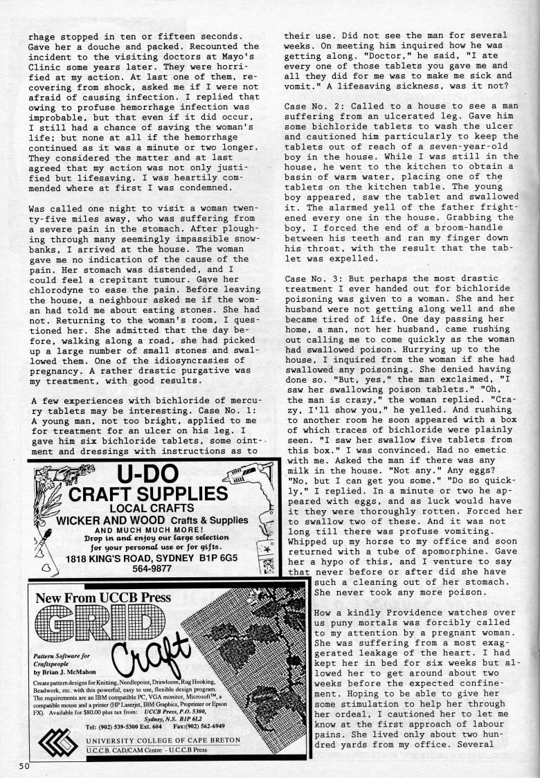 rhage stopped in ten or fifteen seconds. Gave her a douche and packed. Recounted the incident to the visiting doctors at Mayo's Clinic some years later. They were horri? fied at my action. At last one of them, re? covering from shock, asked me if I were not afraid of causing infection. I replied that owing to profuse hemorrhage infection was improbable, but that even if it did occur, I still had a chance of saving the woman's life; but none at all if the hemorrhage continued as it was a minute or two longer. They considered the matter and at last agreed that my action was not only justi? fied but lifesaving. I was heartily com? mended where at first I was condemned. Was called one night to visit a woman twen? ty-five miles away, who was suffering from a severe pain in the stomach. After plough? ing through many seemingly impassible snow? banks, I arrived at the house. The woman gave me no indication of the cause of the pain. Her stomach was distended, and I could feel a crepitant tumour. Gave her chlorodyne to ease the pain. Before leaving the house, a neighbour asked me if the wom? an had told me about eating stones. She had not. Returning to the woman's room, I ques? tioned her. She admitted that the day be? fore, walking along a road, she had picked up a large number of small stones and swal? lowed them. One of the idiosyncrasies of pregnancy. A rather drastic purgative was my treatment, with good results. A few experiences with bichloride of mercu? ry tablets may be interesting. Case No. 1: A young man, not too bright, applied to me for treatment for an ulcer on his leg. I gave him six bichloride tablets, some oint? ment and dressings with instructions as to U-DO CRAFT SUPPUES LOCAL CRAFTS 'WICKER AND WOOD Crafts & Supplies AND MUCH MUCH MORE! Drop in and enjoy our Ui-rge selection jor your personal use or jor giJts. 1818 KING'S ROAD, SYDNEY B1P6G5 ' 564-9877 their use. Did not see the man for several weeks. On meeting him inquired how he was getting along. "Doctor," he said, "I ate every one of those tablets you gave me and all they did for me was to make me sick and vomit." A lifesaving sickness, was it not? Case No. 2: Called to a house to see a man suffering from an ulcerated leg. Gave him some bichloride tablets to wash the ulcer and cautioned him particularly to keep the tablets out of reach of a seven-year-old boy in the house. While I was still in the house, he went to the kitchen to obtain a basin of warm water, placing one of the tablets on the kitchen table. The young boy appeared, saw the tablet and swallowed it. The alarmed yell of the father fright? ened every one in the house. Grabbing the boy, I forced the end of a broom-handle between his teeth and ran my finger down his throat, with the result that the tab? let was expelled. Case No. 3: But perhaps the most drastic treatment I ever handed out for bichloride poisoning was given to a woman. She and her husband were not getting along well and she became tired of life. One day passing her home, a man, not her husband, came rushing out calling me to come quickly as the woman had swallowed poison. Hurrying up to the house, I inquired from the woman if she had swallowed any poisoning. She denied having done so. "But, yes," the man exclaimed, "I saw her swallowing poison tablets." "Oh, the man is crazy," the woman replied. "Cra? zy, I'll show you," he yelled. And rushing to another room he soon appeared with a box of which traces of bichloride were plainly seen. "I saw her swallow five tablets from this box." I was convinced. Had no emetic with me. Asked the man if there was any milk in the house. "Not any." Any eggs? "No, but I can get you some." "Do so quick? ly," I replied. In a minute or two he ap? peared with eggs, and as luck would have it they were thoroughly rotten. Forced her to swallow two of these. And it was not long till there was profuse vomiting. Whipped up my horse to my office and soon returned with a tube of apomorphine. Gave her a hypo of this, and I venture to say that never before or after did she have such a cleaning out of her stomach. She never took any more poison. How a kindly Providence watches over us puny mortals was forcibly called to my attention by a pregnant woman. She was suffering from a most exag? gerated leakage of the heart. I had kept her in bed for six weeks but al? lowed her to get around about two weeks before the expected confine? ment . Hoping to be able to give her some stimulation to help her through her ordeal. I cautioned her to let me know at the first approach of labour pains. She lived only about two hun? dred yards from my office. Several