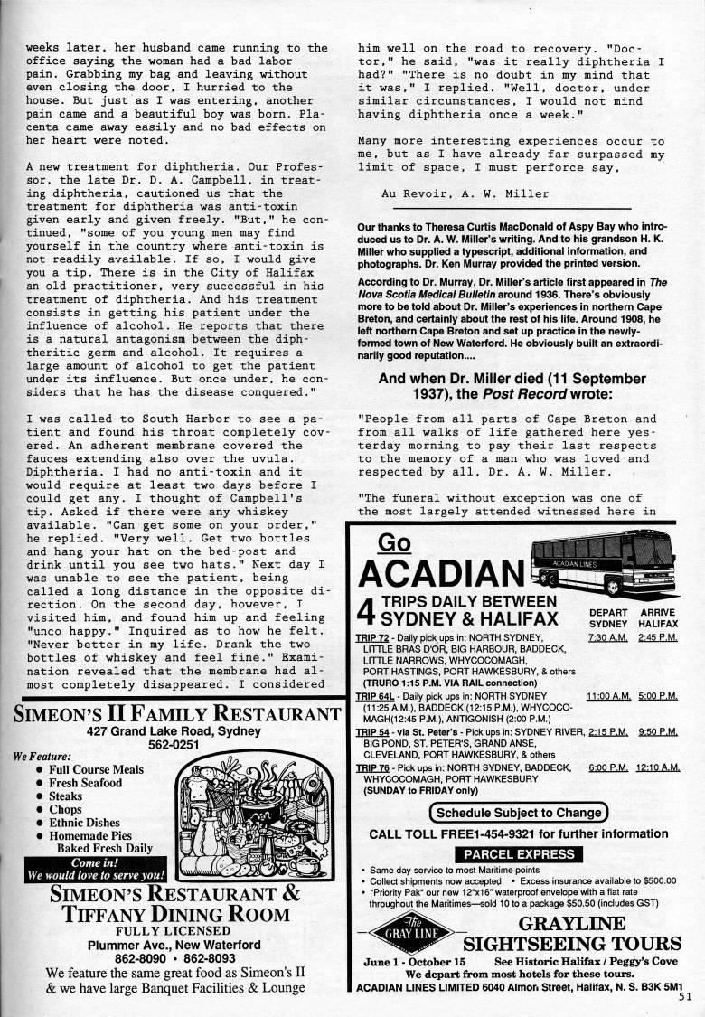 weeks later, her husband came running to the office saying the woman had a bad labor pain. Grabbing my bag and leaving without even closing the door, I hurried to the house. But just as I was entering, another pain came and a beautiful boy was born. Pla? centa came away easily and no bad effects on her heart were noted. A new treatment for diphtheria. Our Profes? sor, the late Dr. D. A. Campbell, in treat? ing diphtheria, cautioned us that the treatment for diphtheria was anti-toxin given early and given freely. "But," he con? tinued, "some of you young men may find yourself in the country where anti-toxin is not readily available. If so. I would give you a tip. There is in the City of Halifax an old practitioner, very successful in his treatment of diphtheria. And his treatment consists in getting his patient under the influence of alcohol. He reports that there is a natural antagonism between the diph? theritic germ and alcohol. It requires a large amount of alcohol to get the patient under its influence. But once under, he con? siders that he has the disease conquered." I was called to South Harbor to see a pa? tient and found his throat completely cov? ered. An adherent membrane covered the fauces extending also over the uvula. Diphtheria. I had no anti-toxin and it would require at least two days before I could get any. I thought of Campbell's tip. Asked if there were any whiskey available. "Can get some on your order," he replied. "Very well. Get two bottles and hang your hat on the bed-post and drink until you see two hats." Next day I was unable to see the patient, being called a long distance in the opposite di? rection. On the second day, however, I visited him, and found him up and feeling "unco happy." Inquired as to how he felt. "Never better in my life. Drank the two bottles of whiskey and feel fine." Exami? nation revealed that the membrane had al? most completely disappeared. I considered SIMEON'S II Family Restaurant 427 Grand Lake Road, Sydney 562-0251 We Feature: • Full Course Meals • Fresh Seafood • Steaks • Chops • Ethnic Dishes • Homemade Pies Baked Fresh Daily Come in! We would love to serve you! SIMEON'S Restaurant & Tiffany Dining Room FULLY LICENSED Plummer Ave., New Waterford 862-8090 • 862-8093 We feature the same great food as Simeon's II & we have large Banquet Facilities & Lounge him well on the road to recovery. "Doc? tor," he said, "was it really diphtheria I had?" "There is no doubt in my mind that it was," I replied. "Well, doctor, under similar circumstances, I would not mind having diphtheria once a week." Many more interesting experiences occur to me, but as I have already far surpassed my limit of space, I must perforce say, Au Revoir, A. W. Miller Our thanks to Theresa Curtis MacDonald of Aspy Bay who intro? duced us to Dr. A. W. lUliller's writing. And to his grandson H. K. Miller who supplied a typescript, additional information, and photographs. Dr. Ken Murray provided the printed version. According to Dr. Murray, Dr. Miller's article first appeared in The Nova Scotia Medical Bulletin around 1936. There's obviously more to be told about Dr. Miller's experiences in northern Cape Breton, and certainly about the rest of his life. Around 1908, he left northern Cape Breton and set up practice in the newly- formed town of New Waterford. He obviously built an extraordi? narily good reputation.... And when Dr. Miller died (11 September 1937), the Post Record wrote: "People from all parts of Cape Breton and from all walks of life gathered here yes? terday morning to pay their last respects to the memory of a man who was loved and respected by all. Dr. A. W. Miller. "The funeral without exception was one of the most largely attended witnessed here in DEPART ARRIVE SYDNEY HALIFAX 7:30 A.M. 2:45 P.M. Go ACADIAN 4 TRIPS DAILY BETWEEN SYDNEY & HALIFAX TRIP 72 - Daily pick ups in: NORTH SYDNEY. LITTLE BRAS D'OR. BIG HARBOUR, BADDECK, LITTLE NARROWS, WHYCOCOMAGH, PORT HASTINGS. PORT HAWKESBURY, & others (TRURO 1:15 P.M. VIA RAIL connection) IR1P.64L-Daily pick ups in: NORTH SYDNEY 11:00 A.M. 5:00 P.M. (11:25 AM.), BADDECK (12:15 P.M.), WHYCOCO- MAGH(12:45 P.M.), ANTIGONISH (2:00 P.M.) TRIP 54 - via St. Peter's - Pick ups in: SYDNEY RIVER, 2:15 P.M. 9:50 P.M. BIG POND, ST. PETER'S, GRAND ANSE, CLEVELAND, PORT HAWKESBURY, & others IBlELZe - Pick ups in: NORTH SYDNEY, BADDECK, 6:00 P.M. 12:10 A.M. WHYCOCOMAGH, PORT HAWKESBURY (SUNDAY to FRIDAY only) (schedule Subject to Change) CALL TOLL FREE1 -454-9321 for further information EiW=H4Hilil#l • Same day service to most Maritime points • Collect shipments now accepted • Excess insurance available to $500.00 • "Priority Pak" our new 12"x16" waterproof envelope with a flat rate throughout the Maritimes • sold 10 to a package $50.50 (includes GST) GRAYLINE SIGHTSEEING TOURS June 1 - October 15 See Historic Halifax / Peggy's Cove We depart from most hotels for these tours. ACADIAN LINES LIMITED 6040 Almon Street, Halifax, N. S. B3K 5M1 51