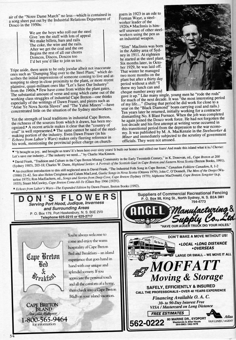 Published by Ronald Caplan on 1993/8/1 (157 reads)air of the "Notre Dame March" no less • which is contained in a song sheet put out by the Industrial Relations Department of Dosco in the 1950s: We are the boys who roll out the steel Give 'em the stuff with lots of appeal We make billets, bars and rails The coke, the wire and the rails. After we get the coal and the ore Begins the rest of aU our chores Domcos, Discos, Doscos too I'd bet you'd like to join us too. Tripe aside, there seem to be only jocular albeit not inaccurate ones such as "Dumping Slag over to the Steel Plant," which de? scribes the initial impressions of someone coming to live and at? tempting to sleep in close proximity to the plant, or more recent plaintive, quasi-militant ones like "Let's Save Our Industry" from the 1960s.' Few have come from within the plant gates. The substantial amount of verse and song which came out of the working class struggles of industrial Cape Breton • one thinks especially of the writings of Dawn Fraser, and pieces such as "Arise Ye Nova Scotia Slaves" and "The Yahie Miners" • 'have concentrated little on the situation of the Sydney steelworkers. Yet the strength of local traditions in industrial Cape Breton, the richness of the sources from which it draws, has been rec? ognized.* A recent article makes it clear that the "country of coal" is well represented.* The same cannot be said of the steel- making portion of the industry. Even Dawn Fraser (in his Echoes from Labor's Wars) makes only fleeting reference in his work, mentioning the provincial police charge on church? goers in 1923 in an ode to i Forman Waye, a steel? worker leader of the 1920s.* Maclnnis is him? self unaware of other steel? workers using the pen as an industrial weapon. "Slim" Maclnnis was bom in the Ashby area of Syd? ney in 1911. At eighteen he started at the steel plant. ' Six months later, in Octo? ber 1929, he was laid off. That winter he managed two more months on the plant but after a thirty day period without a shift "I threw my lunch can and cheque number away and gave it up." Like many single, young men he "rode the rods" for much of the next decade. It was "the most interesting period of my life...." (During that period he did work for close to a year on the "Black Diamond" boats carrying coal and rails.) Ten years later he retumed, initially working for a contractor dismantling No. 8 Blast Fumace. When the job was completed he again joined the Dosco work force. He had not forgotten the lost decade and his first attempt at writing verse occurred in this transitional period from the depression to the war econo? my. It was published by M. A. MacKenzie in the Steelworker & Miner and immediately subjected to the scrutiny of govemment officials. They were not amused. ' "It brought us joy, and brought us tears/ It's been here over sixty years/ It built our homes and stilled our fears/ And made this island what it is./ Chorus: Let's save our industry.../ The industry we need...." by Charhe MacKinnon. David Frank, "Tradition and Culture in die Cape Breton Mining Community in the Early Twentieth Century," in K. Donovan, ed.. Cape Breton at 200 (Sydney 1985), 203-18; Charles W. Dunn, Highland Settler: A Portrait of the Scottish Gael in Cape Breton and Eastern Nova Scotia (Breton Books, 1991). An excellent introduction to this still neglected area is David Frank, "The Industrial Folk Song in Cape Breton," Canadian Folklore Canadien, 8,1-2 (1986) 21-42. See also Helen Creighton and Calum MacLeod, Gaelic Songs in Nova Scotia (Ottawa 1979); John C. O'Donnell, The Men of the Deeps (Wa? terloo 1975); Ron MacEachern, ed., Songs and Stories from Deep Cove, Cape Breton (Sydney 1979); Alphonse MacDonald, Cape Breton Songster (n.p. 1935); Stuart McCawley, Cape Breton Come-All-Ye (Glace Bay 1966 [1929]). Echoes from Labor's Wars • The Expanded Edition by Dawn Fraser, Breton Books (1992). DON'S FLOWERS Serving Port Hood, Judique, Inverness and Surrounding Areas p. O. Box 179, Port Hawkesbury, N. S. BOE 2V0 Telephone 625-2215 or 625-2717 (Eap' irrton Cape Breton Island You're always welctnne to come and enjoy the vvami hospitality' of Cape Breton Bed and Breakfasts - an island experience that goes hand in hand with our unique aiid splendid scenery. If you appreciate the perstmal touch and all the comforts of a home, then check into a Cape Breton B&B; tm your island vacatitm. 1-800-565-9464 for inttirmatitm. Suppliers of Commercial Recreational Fencing p. 0. Box 98, King St., North Sydney, N. S. B2A 3M1 794-4773 "HAVE OUR AUGER TRUCK DIG YOUR HOLES." DON'T MAKE A MOVE WITHOUT US! • LOCAL • LONG DISTANCE • OVERSEAS LARGE OR SMALL - WE MOVE IT ALL 'MOFFATT Moving & Storage SAFELY, EFFICIENTLY & INSURED CALL THE PROFESSIONALS • OVER 40 YEARS EXPERIENCE Financing Available O. A. C. 30- to 90-Day Interest Free VISA I Mastercard on Long Distance FREE ESTIMATES 562-0222 80 MARINE DR., SYDPORT '' AUos Weekends & Atter Hours VAN LINES / AGENT 564-0963/562-1978 "