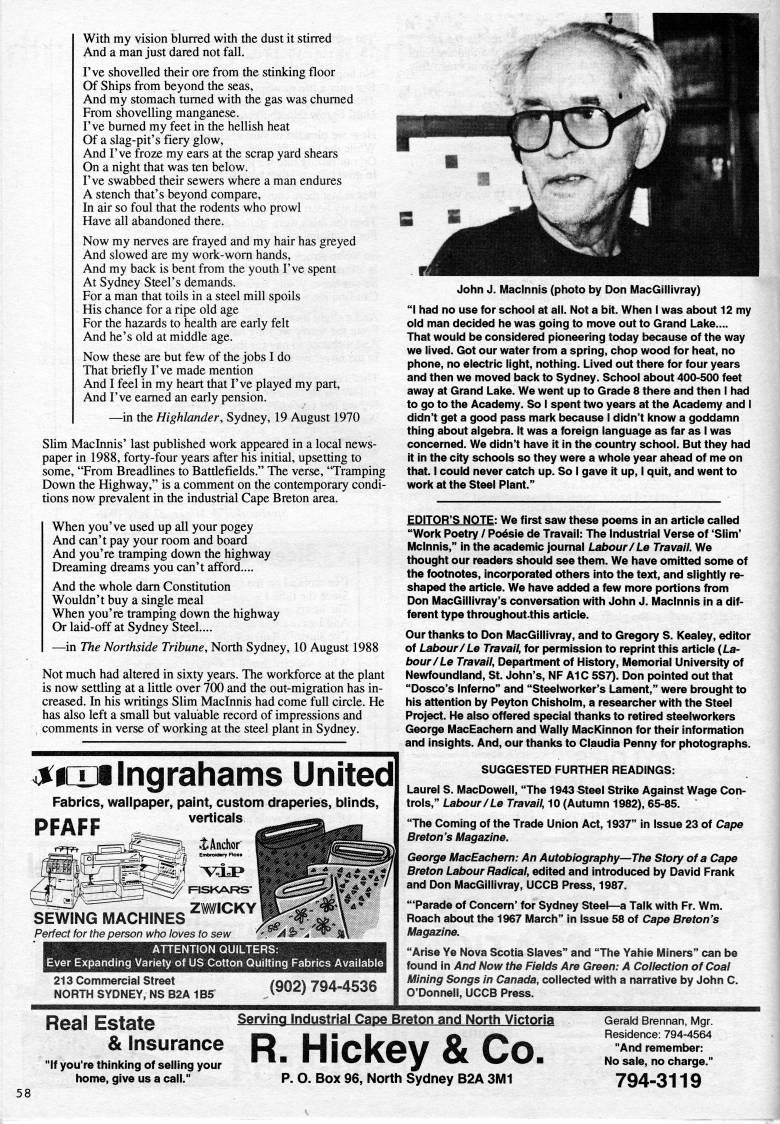 With my vision blurred with the dust it stirred And a man just dared not fall. I've shovelled their ore from the stinking floor Of Ships from beyond the seas, And my stomach tumed with the gas was chumed From shovelling manganese. I've bumed my feet in the hellish heat Of a slag-pit's fiery glow. And I've froze my ears at the scrap yard shears On a night that was ten below. I've swabbed their sewers where a man endures A stench that's beyond compare. In air so foul that the rodents who prowl Have all abandoned there. Now my nerves are frayed and my hair has greyed And slowed are my work-wom hands, And my back is bent from the youth I've spent At Sydney Steel's demands. For a man that toils in a steel mill spoils His chance for a ripe old age For the hazards to health are early felt And he's old at middle age. Now these are but few of the jobs I do That briefly I've made mention And I feel in my heart that I've played my part. And I've eamed an early pension. • in the Highlander, Sydney, 19 August 1970 Slim Maclnnis' last published work appeared in a local news? paper in 1988, forty-four years after his initial, upsetting to some, "From Breadlines to Battlefields." The verse, "Tramping Down the Highway," is a comment on the contemporary condi? tions now prevalent in the industrial Cape Breton area. When you've used up all your pogey And can't pay your room and board And you're tramping down the highway Dreaming dreams you can't afford.... And the whole dam Constitution Wouldn't buy a single meal When you're tramping down the highway Or laid-off at Sydney Steel.... • in The Northside Tribune, North Sydney, 10 August 1988 Not much had altered in sixty years. The workforce at the plant is now settling at a little over 700 and the out-migration has in? creased. In his writings Slim Maclnnis had come full circle. He has also left a small but valuable record of impressions and , comments in verse of working at the steel plant in Sydney. j'iixilngrahanris United Fabrics, wallpaper, paint, custom draperies, blinds, PFAFF verticals J Anchor SEWING MACHINES Perfect for the person wtio loves to sew ATTENTION QUILTERS; mding Variety of US Cotton Quiltii 213 Commercial Street NORTH SYDNEY, NS B2A 1B5 (902) 794-4536 John J. Maclnnis (photo by Don MacGillivray) "i had no use for school at all. Not a bit. When I was about 12 my old man decided he was going to move out to Grand Lake.... That would be considered pioneering today because of the way we lived. Got our water from a spring, chop wood for heat, no phone, no electric light, nothing. Lived out there for four years and then we moved back to Sydney. School about 400-500 feet away at Grand Lake. We went up to Grade 8 there and then I had to go to the Academy. So I spent two years at the Academy and I didn't get a good pass mark because I didn't know a goddamn thing about algebra. It was a foreign language as far as I was concerned. We didn't have it in the country school. But they had it in the city schools so they were a whole year ahead of me on that. I could never catch up. So I gave it up, I quit, and went to work at the Steel Plant." EDITOR'S NOTE: We first saw these poems in an article called "Work Poetry / Poesie de Travail: The Industrial Verse of 'Slim' Mclnnis," in the academic journal Labour/Le Travail We thought our readers should see them. We have omitted some of the footnotes, incorporated others into the text, and slightly re? shaped the article. We have added a few more portions from Don MacGillivray's conversation with John J. Maclnnis in a dif? ferent type throughout.this article. Our thanks to Don MacGillivray, and to Gregory S. Kealey, editor of Labour/Le Travail, for permission to reprint this article {La? bour/Le Travail, Department of History, Memorial University of Newfoundland, St. John's, NF Al 0 5S'. Don pointed out that "Dosco's Inferno" and "Steelworker's Lament," were brought to his attention by Peyton Chisholm, a researcher with the Steel Project. He also offered special thanks to retired steelworkers George MacEachern and Wally MacKinnon for their information and insights. And, our thanks to Claudia Penny for photographs. SUGGESTED FURTHER READINGS: Laurel S. MacDoweli, "The 1943 Steel Strike Against Wage Con? trols," Labour/Le Travail, 10 (Autumn 1982), 65-85. "The Coming of the Trade Union Act, 1937" in Issue 23 of Cape Breton's Magazine. George MacEachern: An Autobiography • The Story ofa Cape Breton Labour Radical, edited and introduced by David Frank and Don MacGillivray, UCCB Press, 1987. "'Parade of Concern' for Sydney Steel • a Talk with Fr. Wm. Roach about the 1967 March" in Issue 58 of Cape Breton's Magazine. "Arise Ye Nova Scotia Slaves" and "The Yahie Miners" can be found in And Now the Fields Are Green: A Collection of Coal Mining Songs in Canada, collected with a narrative by John C. O'Donnell, UCCB Press. Real Estate serving Industrial Cape Breton and North Victoria & Insurance "If you're thinking of selling your home, give us a call." R. Hickey & Co. p. O. Box 96, North Sydney B2A 3M1 Gerald Brennan, Mgr. Residence: 794-4564 "And remember: No sale, no charge." 794-3119
