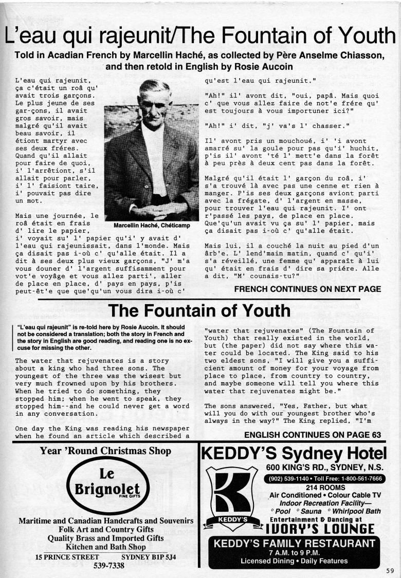 L'eau qui rajeumVThe Fountain of Youth Told in Acadian French by Marcellin Hache, as collected by Pere Anselme Chiasson, and then retold in English by Rosie Aucoin L'eau qui raj eunit, Qa c''tait un rot qu' avait trois gargons. Le plus jeune de ses gar-Qons, il avait gros savoir, mais malgr' qu'il avait beau savoir, il 'tiont martyr avec ses deux fr'res. Quand qu'il allait pour faire de quoi, i' l'arr??tiont, s'il allait pour parler, i' 1' faisiont taire, i' pouvait pas dire un mot. Mais une journ'e, le ro?? 4tait en frais d' lire le papier, i' voyait su' 1' papier qu'i' y avait d' l'eau qui rajeunissait, dans 1'monde. Mais ga disait pas i-oii c' qu'alle 6tait. II a dit k ses deux plus vieux gargons, "J' m'a vous douner d' 1'argent suffisamment pour vot'e voyage et vous allez parti', aller de place en place, d' pays en pays, p'is peut-??t'e que que'qu'un vous dira i-oii c' Marcellin Hach', Cheticamp qu'est l'eau qui rajeunit." "Ah!" il' avont dit, "oui, papt. Mais quoi c' que vous allez faire de not'e fr're qu' est toujours k vous importuner ici?" "Ah!" i' dit, "j' va's 1' chasser." II' avont pris un mouchou', i' 'i avont amarr' su' la goule pour pas qu'i' huchit, p'is il' avont 't' 1' mett'e dans la foret k peu pr's h deux cent pas dans la foret. Malgr6 qu'il 6tait 1' gargon du rot, i' s'a trouv' 1' avec pas une cenne et rien k manger. P'is ses deux gargons aviont parti avec la frigate, d' 1'argent en masse, pour trouver l'eau qui rajeunit. I' ont r'pass6 les pays, de place en place. Que'qu'un avait vu ga su' 1' papier, mais ga disait pas i-oCi c' qu'alle 4tait. Mais lui, il a couch6 la nuit au pied d'un irb'e. L' lend'main matin, quand c' qu'i' s'a r'veilld, une femme qu' apparait k lui qu' 6tait en frais d' dire sa pri're. Alle a dit, "M' counais-tu?" FRENCH CONTINUES ON NEXT PAGE The Fountain of Youth "L'eau qui rajeunit" is re-told here by Rosie Aucoin. It should not be considered a translation; both the story in French and the story in English are good reading, and reading one is no ex? cuse for missing the other. The water that rejuvenates is a story about a king who had three sons. The youngest of the three was the wisest but very much frowned upon by his brothers. When he tried to do something, they stopped him; when he went to speak, they stopped him--and he could never get a word in any conversation. One day the King was reading his newspaper when he found an article which described a "water that rejuvenates" (The Fountain of Youth) that really existed in the world, but (the paper) did not say where this wa? ter could be located. The King said to his two eldest sons, "I will give you a suffi? cient amount of money for your voyage from place to place, from country to country, and maybe someone will tell you where this water that rejuvenates might be." The sons answered, "Yes, Father, but what will you do with our youngest brother who's always in the way?" The King replied, "I'm ENGLISH CONTINUES ON PAGE 63 Year 'Round Christmas Shop Le /Brignolet L 4' FINE GIFTS j Maritime and Canadian Handcrafts and Souvenirs Folk Art and Country Gifts Quality Brass and Imported Gifts Kitchen and Bath Shop 15 PRINCeTsTREET SYDNEY B1P5J4 539-7338 KEDDY'S Sydney Hotel 600 KING'S RD., SYDNEY, N.S. (902) 539-1140* 214 ROOMS Air Conditioned • Colour Cable TV Indoor Recreation Facility • ? Pool ? Sauna ? Whirlpool Bath Entertainment & Dancing at 'lUORV'S LOUNGE KEDDY'S FAMILY RESTAURANT 7 A.IVI. to 9 P.IVI. Licensed Dining • Daily Features