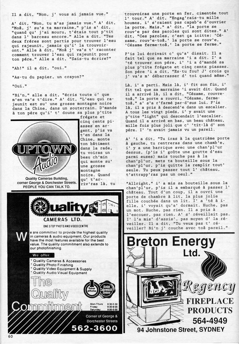 II a dit, "Non, j' vous ai jamais vue." A' dit, "Non, tu m'as jamais vue." A' dit, "Mot, j' su's ta marraine," p'is a' dit. "quand qu' j'ai mouru, t'6tais tout p'tit dans 1' barceau encore." Alle a dit, "Tes deux fr'res sont partis pour trouver l'eau qui rajeunit, jamais qu'i' la trouvoir- ont." Alle k dit, "Mo& j' va's t' raconter comment trouver l'eau qui rajeunit pour ton p6re." Alle a dit, "Sais-tu 6crire?" "Ah!" il a dit. "oui." "As-tu du papier, un crayon?" "Oui." "Bi'n," alle a dit. "6cris toute c' que m'en va's t'dire." A' dit. "L'eau qui ra? jeunit est su' une grosse montagne noire dans la Chine, dans un souterrain. D'mande k ton p're qu'i' t' doune sa plus p'tite Quality Cameras Building, corner George & Dorchester Streets. PEOPLE YOU CAN TALK TO. frigate et cinq cents pi asses en ar? gent . p'is va t'en dans la Chine, monte ton batiment dans la rade, tu voiras un beau ch'min qui monte su' une grosse montagne noire. Quand qu' t'ar- riv'ras 1', tu trouvoiras une porte en fer, ciment'e tout 1' tour." A' dit, "Engag'rais-tu mille houmes, i' s'raient pas capab'e d'ouvrier la porte. Mais," a' dit, "la porte se rouv'e par des paroles qui sont dites." A' dit, "Ces paroles, c'est qa icitte: 'C6- zame, rouv'e-toS.' la porte se rouv'e. 'C'zame ferme-to??.' la porte se ferme." P'is lui 6crivait c' qu'a' disait. II a fait tel que sa marraine 'i a dit. I' a 't6 trouver son p're. i' 'i a d'mande sa plus p'tite frigate et cinq cents piasses. Son p6re 'i a dit. "Es-tu fou? J' crois qu j' va's m' d'barrasser d' toi quand meme." L'. i' a parti. Mais 1', i' fit son fin, i' fit tel que sa marraine 'i avait dit. Quand il a arriv6 1', il a dit, "C'zame, rouvre- to??," la porte a rouvri. "C'zame. ferme- toa," a' s'a r'farm' par-d'sus lui. P'is 1', il a pris k descend'e dans un escalier. A tous les vingt pieds, i' y avait une p'tite "light" qui descendait 1'escalier. Quand il a arriv6 en bas, un beau chateau, mille fois plus joli que c' 'tit-l& d' son p're. I' 'n avait jamais vu un pareil. A' 'i a dit, "Tu iras k la quatri'me porte k gauche, tu rentreras dans une chamb'e, i' y a une barrique avec une chan'pl'ur dessus, (p'is i' gotite une goutte d' eau parmi euses) mais touche pas k la chan'pl'ur, mets ta bouteille sous la chan'pl'ur, p'is quitte la remplir tout' seule. Tu peux passer tout 1' chateau, t'attrapp'ras pas un oeul." "Allright." i' a mis sa bouteille sous la chan'pl'ur. p'is il a embarqu6 k passer 1' chateau. Tout d'un coup, il a ouvri une porte de chambre k lit. la plus jolie fille couch'e dans un lit. I' a 't6 4 i- elle, i' voyait qu'a' dormait. Huche. pas un mot. Huche, pas rien. II a pris k I'escouer, pas rien. A' s' r'veillait pas. I' I'a mis' d'assis', pas moyen d' la r'- veiller. Il a dit, "Tu veux pas t' re- veiller? Bi'n j' couche avec toa pareil." Breton Energy Ltd. FIREPLACE PRODUCTS 564-4949 94 Johnstone Street, SYDNEY