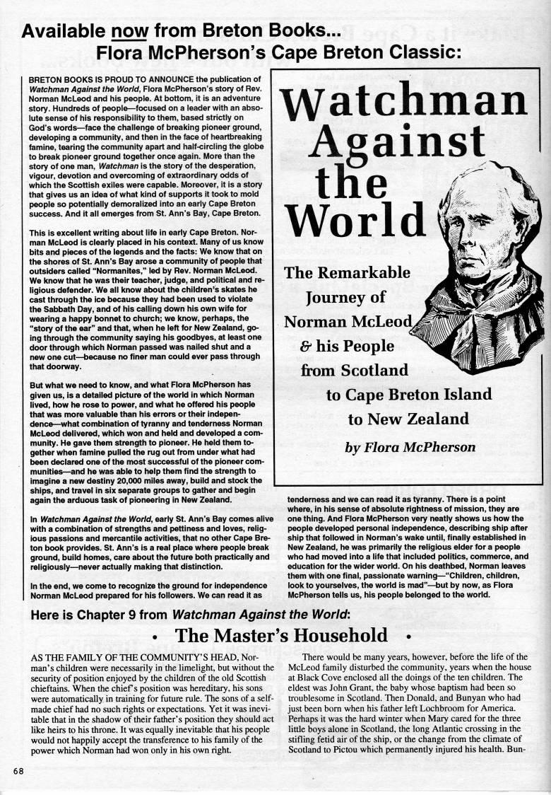 Page 68 - Availible now from Breton Books" Flora McPherson's Cape Breton Classic: Watchman Against the World The Remarkable Journey of Norman MacLeod & His People From Scotland to Cape Breton Island to New Zealand