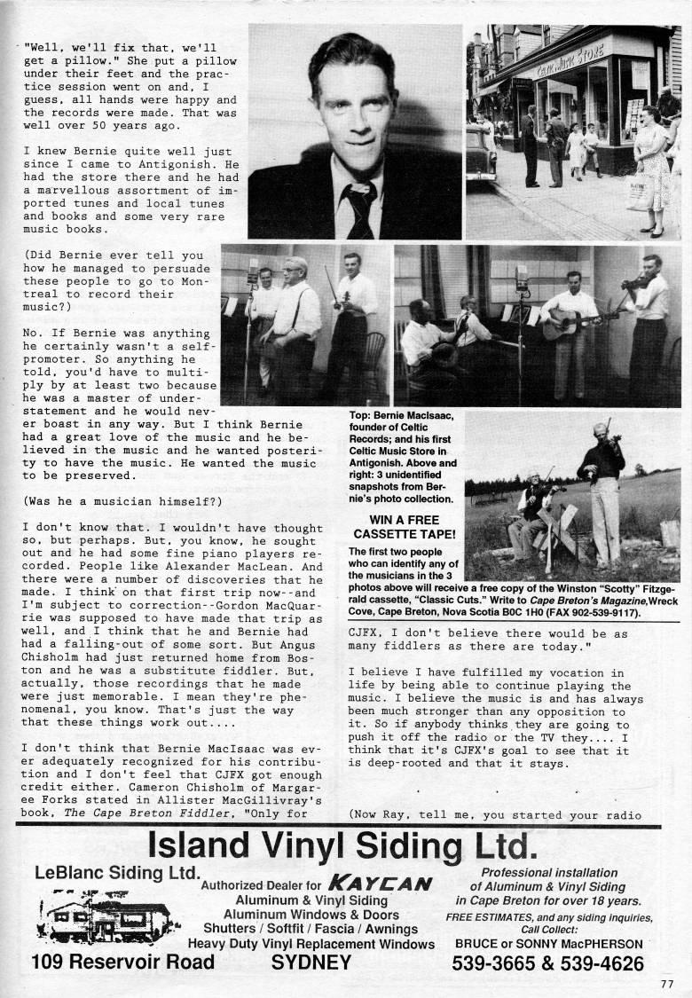 ' "Well, we'll fix that, we'll get a pillow." She put a pillow under their feet and the prac? tice session went on and, I guess, all hands were happy and the records were made. That was well over 50 years ago. I knew Bernie quite well just since I came to Antigonish. He had the store there and he had a marvellous assortment of im? ported tunes and local tunes and books and some very rare music books. (Did Bernie ever tell you how he managed to persuade these people to go to Mon? treal to record their music?) No. If Bernie was anything he certainly wasn't a self- promoter. So anything he told, you'd have to multi? ply by at least two because he was a master of under? statement and he would nev? er boast in any way. But I think Bernie had a great love of the music and he be? lieved in the music and he wanted posteri? ty to have the music. He wanted the music to be preserved. (Was he a musician himself?) I don't know that. I wouldn't have thought so, but perhaps. But, you know, he sought out and he had some fine piano players re? corded. People like Alexander MacLean. And there were a number of discoveries that he made. I think" on that first trip now--and I'm subject to correction--Gordon MacQuar? rie was supposed to have made that trip as well, and I think that he and Bernie had had a falling-out of some sort. But Angus Chisholm had just returned home from Bos? ton and he was a substitute fiddler. But, actually, those recordings that he made were just memorable. I mean they're phe? nomenal, you know. That's just the way that these things work out.... I don't think that Bernie Maclsaac was ev? er adequately recognized for his contribu? tion and I don't feel that CJFX got enough credit either. Cameron Chisholm of Margar? ee Forks stated in Allister MacGillivray's book. The Cape Breton Fiddler, "Only for Top: Bernie Maclsaac, founder of Celtic Records; and his first Celtic Music Store in Antigonish. Above and right: 3 unidentified snapshots from Ber- nie's photo collection. WIN A FREE CASSETTE TAPE! The first two people who can identify any of I the musicians in the 3 photos above will receive a free copy of the Winston "Scotty" Fitzge? rald cassette, "Classic Cuts." Write to Cape Breton's Afa'raz/zie,Wreck Cove, Cape Breton, Nova Scotia BOC 1H0 (FAX 902-539-9117). CJFX. I don't believe there would be as many fiddlers as there are today." I believe I have fulfilled my vocation in life by being able to continue playing the music. I believe the music is and has always been much stronger than any opposition to it. So if anybody thinks they are going to push it off the radio or the TV they.... I think that it's CJFX's goal to see that it is deep-rooted and that it stays. (Now Ray, tell me, you started your radio LeBlanc Siding Ltd. Island Vinyl Siding Ltd. >ir -rw Authorized Dealer for Afi4 YCAN Aluminum & Vinyl Siding Aluminum Windows & Doors Shutters/Softfit/ Fascia/ Awnings Heavy Duty Vinyl Replacement Windows 109 Reservoir Road SYDNEY Professional Installation of Aluminum & Vinyl Siding in Cape Breton for over 18 years. FREE ESTIMATES, and any siding inquiries, Call Collect: BRUCE or SONNY MacPHERSON 539-3665 & 539-4626