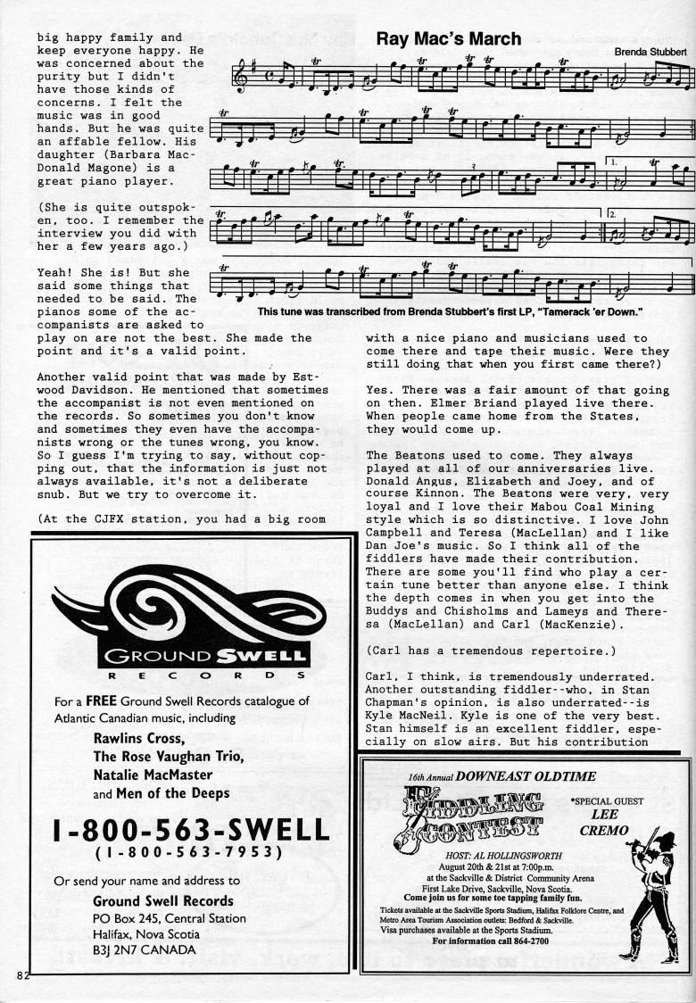 big happy family and keep everyone happy. He was concerned about the purity but I didn't have those kinds of concerns. I felt the music was in good hands. But he was quite an affable fellow. His daughter (Barbara Mac? Donald Magone) is a great piano player. (She is quite outspok? en, too. I remember the interview you did with her a few years ago.) Ray Mac's March Brenda Stubbert Yeah! She is! But she said some things that needed to be said. The pianos some of the ac? companists are asked to play on are not the best. She made the point and it's a valid point. Another valid point that was made by Est- wood Davidson. He mentioned that sometimes the accompanist is not even mentioned on the records. So sometimes you don't know and sometimes they even have the accompa? nists wrong or the tunes wrong, you know. So I guess I'm trying to say, without cop? ping out, that the information is just not always available, it's not a deliberate snub. But we try to overcome it. (At the CJFX station, you had a big room For a FREE Ground Swell Records catalogue of Atlantic Canadian music, including Rawlins Cross, The Rose Vaughan Trio, Natalie MacMaster and Men of the Deeps 1-800-563-SWELL ( I -800-563-7953) Or send your name and address to Ground Swell Records PO Box 245, Central Station Halifax, Nova Scotia B3J 2N7 CANADA This tune was transcribed from Brenda Stubbert's first LP, "Tamerack 'er Down. with a nice piano and musicians used to come there and tape their music. Were they still doing that when you first came there?) Yes. There was a fair amount of that going on then. Elmer Briand played live there. When people came home from the States, they would come up. The Beatons used to come. They always played at all of our anniversaries live. Donald Angus, Elizabeth and Joey, and of course Kinnon. The Beatons were very, very loyal and I love their Mabou Coal Mining style which is so distinctive. I love John Campbell and Teresa (MacLellan) and I like Dan Joe's music. So I think all of the fiddlers have made their contribution. There are some you'll find who play a cer? tain tune better than anyone else. I think the depth comes in when you get into the Buddys and Chisholms and Lameys and There? sa (MacLellan) and Carl (MacKenzie). (Carl has a tremendous repertoire.) Carl, I think, is tremendously underrated. Another outstanding fiddler--who, in Stan Chapman's opinion, is also underrated--is Kyle MacNeil. Kyle is one of the very best. Stan himself is an excellent fiddler, espe? cially on slow airs. But his contribution 16th Annual DOWNEAST OLDTIME SPECIAL GUEST LEE CREMO HOST: AL HOLLINGSWORTH August 20th & 21st at 7:00p.m. at the Sackville & District Community Arena First Lake Drive, Sackville, Nova Scotia. Come join us for some toe tapping famUy fun. Tickets available at the Sackville Sports Stadium, Hali&x; Folklore Centre, and Metro Area Tourism Association outlets: Bedford & Sackville. Visa purchases available at the Sports Stadium. For information call 864-2700 'J J