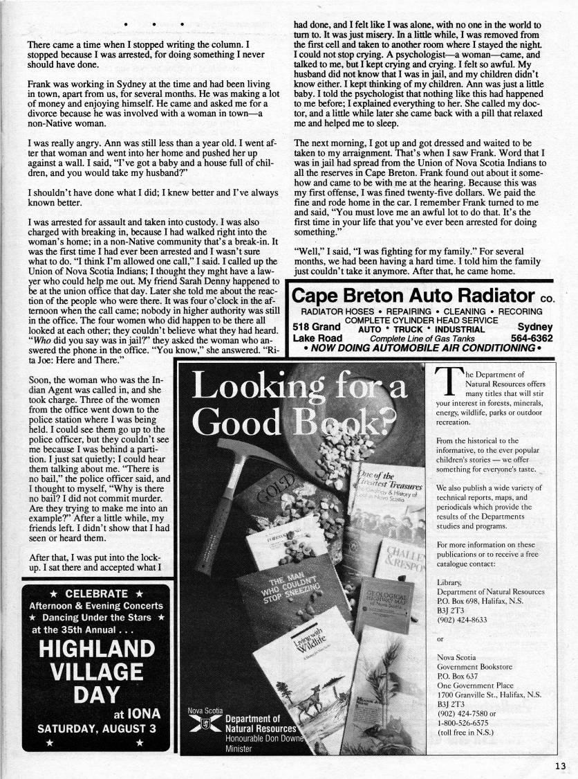 There came a time when I stopped writing the column. I stopped because I was arrested, for doing something I never should have done. Frank was working in Sydney at the time and had been living in town, apart from us, for several months. He was making a lot of money and enjoying himself. He came and asked me for a divorce because he was involved with a woman in town • a non-Native woman. I was really angry. Ann was still less than a year old. I went af? ter that woman and went into her home and pushed her up against a wall. I said, "I've got a baby and a house full of chil? dren, and you would take my husband?" I shouldn't have done what I did; I knew better and I've always known better. I was arrested for assault and taken into custody. I was also charged with breaking in, because I had walked right into the woman's home; in a non-Native community that's a break-in. It was the first time I had ever been arrested and I wasn't sure what to do. "I think I'm allowed one call," I said. I called up the Union of Nova Scotia Indians; I thought they mght have a law? yer who could help me out. My friend Sarah Denny happened to be at the union office that day. Later she told me about the reac? tion of the people who were there. It was four o'clock in the af? ternoon when the call came; nobody in higher authority was still in the office. The four women who did happen to be there all looked at each other; they couldn't believe what they had heard. ''Who did you say was in jailT' they asked the woman who an? swered the phone in the office. "You know," she answered. "Ri? ta Joe: Here and There." Soon, the woman who was the In? dian Agent was called in, and she took charge. Three of the women from the office went down to the police station where I was being held. I could see them go up to the poUce officer, but they couldn't see me because I was behind a parti? tion. I just sat quietly; I could hear them talking about me. "There is no bail," the police officer said, and I thought to myself, "Why is there no bail? I did not commit murder. Are they trying to make me into an example?" After a Uttle while, my friends left. I didn't show that I had seen or heard them. had done, and I felt like I was alone, with no one in the world to turn to. It was just misery. In a little while, I was removed from the first cell and taken to another room where I stayed the night I could not stop crying. A psychologist • a woman • came, and talked to me, but I kept crying and crying. I felt so awful. My husband did not know that I was in jail, and my children didn't know either. I kept thinking of my children. Ann was just a little baby. I told the psychologist that nothing like this had happened to me before; I explained everything to her. She called my doc? tor, and a little wWle later she came back with a pill that relaxed me and helped me to sleep. The next morning, I got up and got dressed and waited to be taken to my arraignment. That's when I saw Frank. Word that I was in jail had spread from the Union of Nova Scotia Indians to all the reserves in Cape Breton. Frank found out about it some? how and came to be with me at the hearing. Because this was my first offense, I was fined twenty-five dollars. We paid the fine and rode home in the car. I remember Frank turned to me and said, "You must love me an awful lot to do that. It's the first time in your Ufe that you've ever been arrested for doing something." "Well," I said, "I was fighting for my family." For several months, we had been having a hard time. I told him the family just couldn't take it anymore. After that, he came home. Cape Breton Auto Radiator co RADIATOR HOSES • REPAIRING • CLEANING • RECORING T'o/- . COMPLETE CYLINDER HEAD SERVICE _' 518 Grand auto * truck * industrial Sydney Lake Road Complete Line of Gas Tanks 564-6362 • NOW DOING AUTOMOBILE AIR CONDITIONING • The Department of Natural Resources offers many titles that will stir your interest in forests, minerals, energy, wildlife, parks or outdoor recreation. From the historical to the informative, to the ever popular children's stories • we offer something for everyone's taste. We also publish a wide variety of technical reports, maps, and periodicals which provide the results of the Departments studies and programs. For more information on these publications or to receive a free catalogue contact: Library, Department of Natural Resources RO. Box 698, Halifax, N.S. B3J 2T3 (902) 424-8633 or Nova Scotia Government Bookstore RO. Box 637 One Government Place 1700 Granville St., Halifax, N.S. B3J 2T3 (902) 424-7580 or 1-800-526-6575 (toll free in N.S.) 13