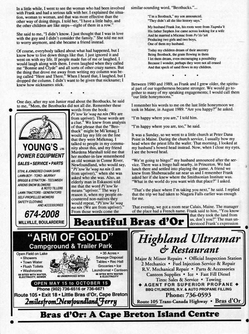 In a little while, I went to see the woman who had been involved with Frank and had a serious talk with her. I explained the situa? tion, woman to woman, and that was more effective than the other way of doing things. I told her, "I have a little baby, and the other children are like steps • eight of them in a row." She said to me, "I didn't know. I just thought that I was in love with the guy and I didn't consider the family." She told me not to worry anymore, and she became a friend instead. Of course, everybody talked about what had happened, but I know how to live down things like that I just ignored it and went on with my Ufe. If people made fun of me or laughed, I would laugh along with them. I even laughed when they called me "Bonnie and Clyde" and all sorts of other crazy names. But the thing that drove me away from writing my column was be? ing called "Here and There." When I heard that, I laughed, but I dropped the column. I didn't want to be given that nickname; I knew how nicknames stick. One day, after my son Junior to me, "Mom, the Beothucks YOUNG'S... POWER EQUIPMENT SALES • SERVICE'PARTS STIHL & JONSERED CHAIN SAWS LAWN-BOY - TORO - MURRA Y BRIGGS & STRAUON - TECUMSEH ARIENS SNOW BLOWERS & ROTO TILLERS LAWN TRACTORS - GENERATORS SELF-PROPELLED MOWERS SAFETY CLOTHING AND ACCESSORIES 674-2008 MILLVILLE, BOULARDERIE read about the Beothucks, he said did not all die. Remember these words from the book: Pi 'tow 'ke 'waq na nin (We are from upriver). Those words are a clue." We knew from analysis of that phrase that the "Beo- thuck" might be Mi'kmaq; I would lay my life on the line that they were Miekmaq. I talked to people in my commu? nity about this, and my friend Murdena Marshall told me that her mother-in-law remembered an old woman in Conne River, Newfoundland, who would say, "Pi'tow'ke'waq na nin (I am from upriver)," when she was asked who she was. Also, an elderly man in Eskasoni told me that the word Pi'tow'ke means "upriver." The way I reason it, when my people en? countered non-natives they would repeat, "Pi'tow'ke'waq na nin (We are from upriver)." From those words come the similar-sounding word, "Beothucks."... "I'm a Beothuck," my son announced. 'They didn't all die like history says." My husband Frank Joe, his roots were from Taqmku'k His father Stephen Joe came across looking for a wife And he married a Micmac from Po 'tlo 'tek Producing two girls and two boys. One of them my husband. Today my children dream of their ancestry Being Beothuck, the grain flowing in them I let them dream, even encouraging a possibility Because I wonder, perhaps they were not all erased And that speck of sand flows in my children. Between 1980 and 1989, as Frank and I grew older, the spiritu? al part of our togetherness became stronger. We would go to? gether to many of my speaking engagements; I would call them "our little honeymoons." I remember his words to me on the last little honeymoon we took in Maine, in August 1989. "Are you happy?" he asked. "I'm happy where you are," I told him. "I'm happy where you are, too," he said. It was a Sunday, so we went to a little church at Peter Dana Point in Maine. During the church service, I usually bow my head when the priest lifts the wafer. That morning, I looked at my husband's bowed head instead. Now, when I close my eyes, I see the bowed head. "We're going to bingo!" my husband announced after the ser? vice. There was a bingo hall nearby, in Princeton. We had lunch there and settled into playing the game. A friend we knew from Shubenacadie sat near us and I remember Frank asked her if she knew where the Smithsonian Institute was. "What in the world do you want with that place?" I asked. "That's the place where I'm taking you next," he said. I replied that the trip we had taken to Niagara Falls earlier was enough for me. That evening, we got a room near Calais, Maine. The manager of the place had a French name. Frank said to him, "You know that they took the land from us, don't you?" The man un? derstood Frank's expression Beautiful Bras d'Orl "ARM OF GOLD" Campground & Trailer Park Open Field on Lake • Showers • Town Water • Flush Toilets • Washrooms 46 UNSERVICED SITES • 35 Acres • Sewage Disposal Tables • Rec Hall Groceries • Ice Laundromat • Canteenl OPEN MAY 15 to OCTOBER 15 Phone (902) 736-6516 or 736-6671 Route 105 • Exit 18 • Little Bras d'Or, Cape Breton| 2miUsfr(ml2Jewf(mnJland'crrjf Highland Ultramar & Restaurant Major & Minor Repairs • Official Inspection Station 2 Mechanics • Fuel Injection Service & Repair RV. Mechanical Repair • Parts & Accessories Canteen Supplies • Ice • Fast Fill Diesel Tires: Sales & Service • Towing AGENT FOR SUPERIOR PROPANE BBQ CYLINDERS, R.V. & AUTO PROPANE FILLING Phone: 736-0593 Route 105 Trans-Canada Highway • Bras d'Or J Bras d'Or: A Cape Breton Island Centre