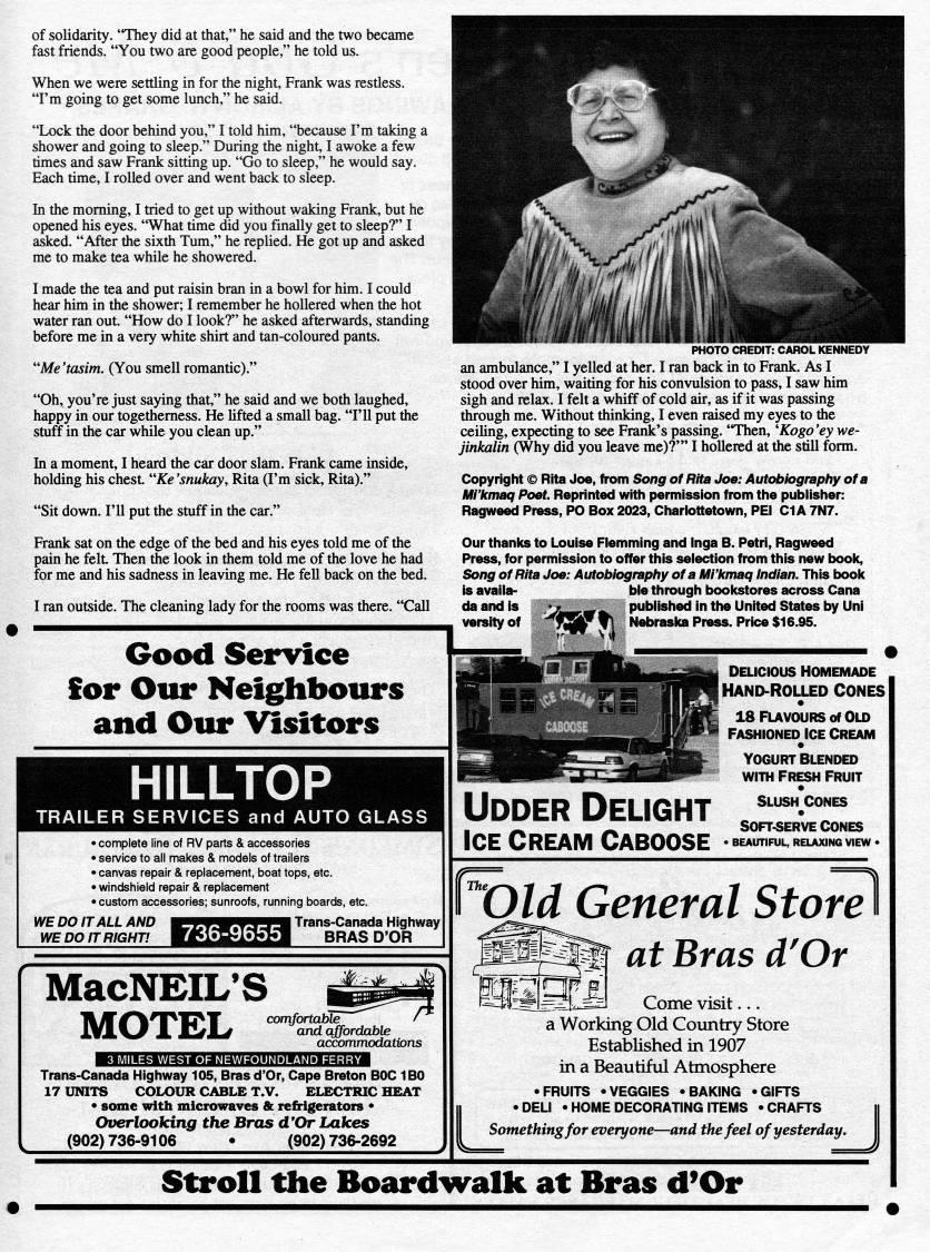 of solidarity. "They did at that," he said and the two became fast friends. "You two are good people," he told us. When we were settling in for the night, Frank was restless. "I'm going to get some lunch," he said. "Lock the door behind you," I told him, "because I'm taking a shower and going to sleep." During the night, I awoke a few times and saw Frank sitting up. "Go to sleep," he would say. Each time, I rolled over and went back to sleep. In the morning, I tried to get up without waking Frank, but he opened his eyes. "What time did you finally get to sleep?" I asked. "After the sixth Tum," he replied. He got up and asked me to make tea while he showered. I made the tea and put raisin bran in a bowl for him. I could hear him in the shower; I remember he hollered when the hot water ran out "How do I look?" he asked afterwards, standing before me in a very white shirt and tan-coloured pants. ''Me'tasim. (You smell romantic)." "Oh, you're just saying that," he said and we both laughed, happy in our togetherness. He lifted a small bag. "I'll put the stuff in the car while you clean up." In a moment, I heard the car door slam. Frank came inside, holding his chest "Ke'snukay, Rita (I'm sick, Rita)." "Sit down. I'll put the stuff in the car." Frank sat on the edge of the bed and his eyes told me of the pain he felt Then the look in them told me of the love he had for me and his sadness in leaving me. He fell back on the bed. I ran outside. The cleaning lady for the rooms was there. "Call Good Service Sor Our Neighbours and Our Visitors HILLTOP TRAILER SERVICES and AUTO GLASS • complete line of RV parts & accessories • service to all makes & models of trailers • canvas repair & replacement, boat tops, etc. • windshield repair & replacement • custom accessories; sunroofs, running boards, etc. WE DO IT ALL AND 'tS??WJSfSM Trans-Canada Highway WE DO IT RIGHT! W'UUiliWm BRAS D'OR PHOTO CREDIT: CAROL KENNEDY an ambulance," I yelled at her. I ran back in to Frank. As I stood over him, waiting for his convulsion to pass, I saw him sigh and relax. I felt a whiff of cold air, as if it was passing through me. Without thinking, I even raised my eyes to the ceiling, expecting to see Fraiik's passing. "Then, 'Kogo'ey we- jinkalin (Why did you leave me)?'" I hollered at the still form. Copyright ?? Rita Joe, from Song of Rita Joe: Autobiography of a Mi'kmaq Poet. Reprinted with permission from the publisher: Ragweed Press, PO Box 2023, Charlottetown, PEI CIA 7N7. Our thanks to Louise Flemming and Inga B. Petri, Ragweed Press, for permission to offer this selection from this new book, Song of Rita Joe: Autobiography of a Mi'kmaq Indian. This book is avalla- ble through bookstores across Cana da and is *-if i_, published in the United States by Uni versity of ''jSff f Nebraska Press. Prk:e $16.95. MacNEILS MOTEL comSoTtaiAe and affordable accommodations ??fMI35iVi=L'I,1J3IJJi:f??1llgUH.1il.lJJ=l=i? Trans-Canada Highway 105, Bras d'Or, Cape Breton BOC 1B0 17 UNITS COLOUR CABLE T.V. ELECTRIC HEAT • some with microwaves & refrigerators • Overlooking the Bras d'Or Lakes (902) 736-9106 • (902) 736-2692 "Wfi DELiCiOUS HOMEMADE HAND-ROLLED CONES Udder Delight Ice Cream Caboose 18 FLAVOURS of Old Fashioned ice cream • YOGURT BLENDED WITH FRESH FRUIT • Slush Cones • SOFT-SERVE CONES > BEAUTIFUL, RELAXING VIEW • lOld General Storel at Bras d'Or Come visit... a Working Old Country Store Established in 1907 in a Beautiful Atmosphere • FRUITS • VEGGIES • BAKING • GIFTS DELI • HOME DECORATING ITEMS • CRAFTS Something for everyone • and the feel of yesterday. I Sonn 'lJ Stroll the Board'walk at Bras d'Or