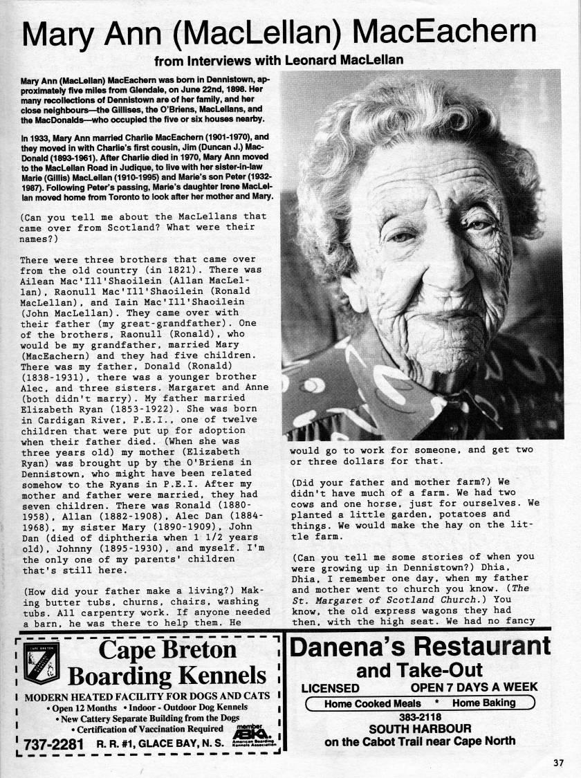 Published by Ronald Caplan on 1996/6/1 (336 reads)Maiy Ann (MacLellan) MacEachern from Interviews with Leonard MacLellan Mary Ann (MacLellan) MacEachern was born in Dennistown, ap? proximately five miles from Glendale, on June 22nd, 1898. Her many recollections of Dennistown are of her family, and her close neighbours • the Gillises, the O'Briens, MacLellans, and the MacDonalds • who occupied the five or six houses nearby. In 1933, Mary Ann married Charlie MacEachern (1901-1970), and they moved in with Charlie's first cousin, Jim (Duncan J.) Mac- Donald (1893-1961). After Charlie died in 1970, Mary Ann moved to the MacLellan Road in Judique, to live with her sister-in-law Marie (Gillis) MacLellan (1910-1995) and Marie's son Peter (1932- 1987). Following Peter's passing, Marie's daughter Irene MacLel? lan moved home from Toronto to look after her mother and Mary. (Can you tell me about the MacLellans that came over from Scotland? What were their names?) There were three brothers that came over from the old country (in 1821) . There was Ailean Mac'111'Shaoilein (Allan MacLel? lan), Raonull Mac'111'Shaoilein (Ronald MacLellan), and Iain Mac'111'Shaoilein (John MacLellan). They came over with their father (my great-grandfather). One of the brothers, Raonull (Ronald), who would be my grandfather, married Mary (MacEachern) and they had five children. There was my father, Donald (Ronald) (1838-1931), there was a younger brother Alec, and three sisters. Margaret and Anne (both didn't marry). My father married Elizabeth Ryan (1853-1922). She was born in Cardigan River, P.E.I., one of twelve children that were put up for adoption when their father died. (When she was three years old) my mother (Elizabeth Ryan) was brought up by the O'Briens in Dennistown, who might have been related somehow to the Ryans in P.E.I. After my mother and father were married, they had seven children. There was Ronald (1880- 1958). Allan (1882-1908), Alec Dan (1884- 1968), my sister Mary (1890-1909), John Dan (died of diphtheria when 1 1/2 years old), Johnny (1895-1930), and myself. I'm the only one of my parents' children that's st-ill here. (How did your father make a living?) Mak? ing butter tubs, churns, chairs, washing tubs. All carpentry work. If anyone needed a 'Kor'-n T-i cj t.tq o -t-Tnava -t-r Vi q 1 rv i-Vicatn TTra tubs. All carpentry work. If anyone ne a barn, he was there to help them. He nM ?r mm would go to work for someone, and get two or three dollars for that. (Did your father and mother farm?) We didn't have much of a farm. We had two cows and one horse, just for ourselves. We planted a little garden, potatoes and things. We would make the hay on the lit? tle farm. (Can you tell me some stories of when you were growing up in Dennistown?) Dhia, Dhia, I remember one day, when my father and mother went to church you know. (The St. Margaret of Scotland Church.) You know, the old express wagons they had then, with the high seat. We had no fancy Cape Breton Boarding Kennels MODERN HEATED FACILITY FOR DOGS AND CATS • Open 12 Months • Indoor - Outdoor Dog Kennels • New Cattery Separate Building from the Dogs • Certification of Vaccination Required SputS' 737-2281 R. R- #i, glace bay, n. s. KT';isd3- Danena's Restaurant and Take-Out LICENSED OPEN 7 DAYS A WEEK ( Home Cooked Meals * Home Baking ' 383-2118 SOUTH HARBOUR on the Cabot Trail near Cape North 37