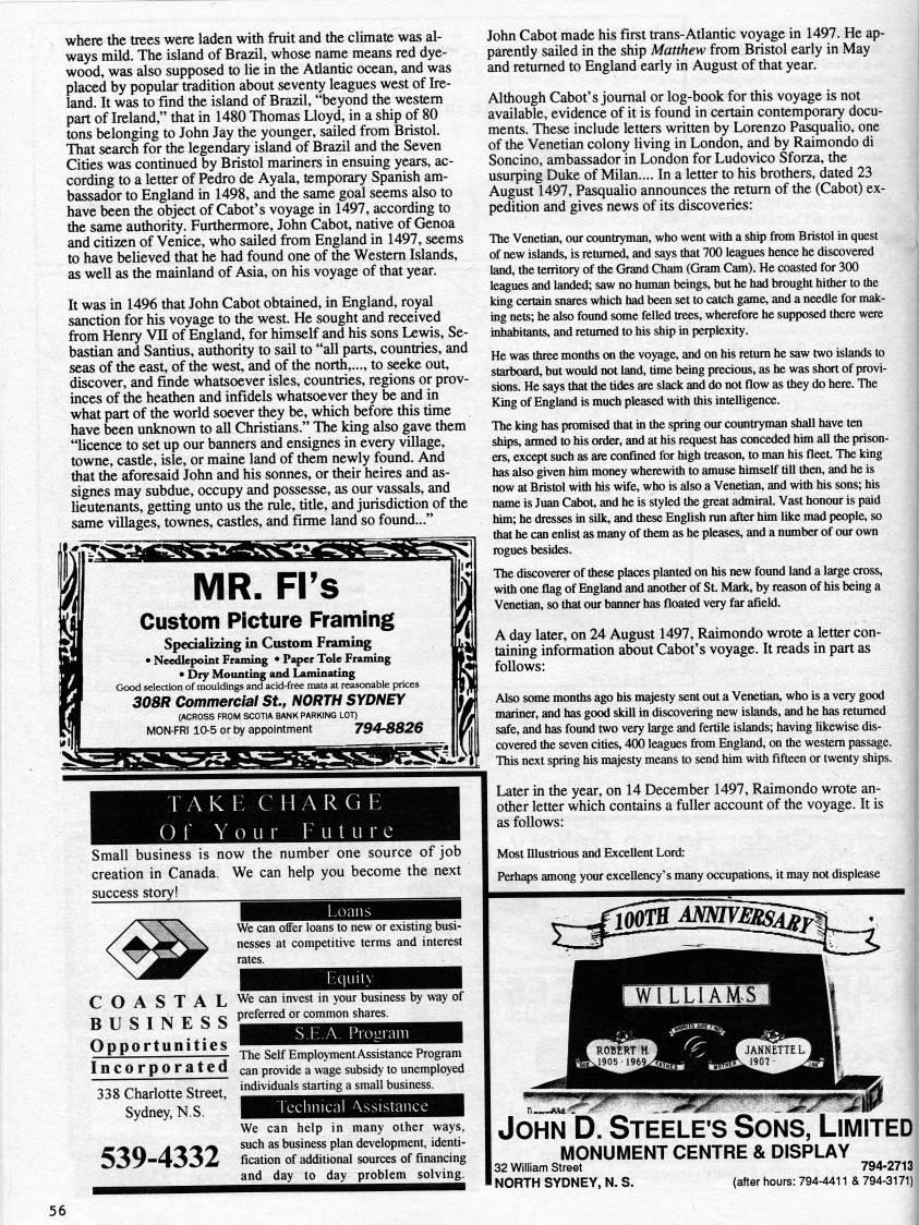 where the trees were laden with fruit and the climate was al? ways mild. The island of Brazil, whose name means red dye- wood, was also supposed to lie in the Atlantic ocean, and was placed by popular tradition about seventy leagues west of Ire? land. It was to find the island of Brazil, "beyond the western part of Ireland," that in 1480 Thomas Lloyd, in a ship of 80 tons belonging to John Jay the younger, sailed from Bristol. That search for the legendary island of Brazil and the Seven Cities was continued by Bristol mariners in ensuing years, ac? cording to a letter of Pedro de Ayala, temporary Spanish am? bassador to England in 1498, and the same goal seems also to have been the object of Cabot's voyage in 1497, according to the same authority. Furthermore, John Cabot, native of Genoa and citizen of Venice, who sailed from England in 1497, seems to have believed that he had found one of Sie Western Islands, as well as the mainland of Asia, on his voyage of that year. It was in 1496 that John Cabot obtained, in England, royal sanction for his voyage to the west. He sought and received from Henry VII of England, for himself and his sons Lewis, Se? bastian and Santius, authority to sail to "all parts, countries, and seas of the east, of the west, and of the north,..., to seeke out, discover, and finde whatsoever isles, countries, regions or prov? inces of the heathen and infidels whatsoever they be and in what part of the world soever they be, which before this time have been unknown to all Christians." The king also gave them "licence to set up our banners and ensignes in every village, towne, castle, isle, or maine land of them newly found. And that the aforesaid John and his sonnes, or their heires and as- signes may subdue, occupy and possesse, as our vassals, and lieutenants, getting unto us the rule, title, and jurisdiction of the same villages, townes, castles, and firme land so found..." MR. Fl's Custom Picture Framing specializing in Custom Framing • Needlepoint Framii' • Paper Tole Framing * Dry Mounting and Laminating Good selection of mouldings and acid-free mats at reasonable prices 308R Commercial St., NORTH SYDNEY (ACROSS FROM SCOTIA BANK PARKING LOT) MON-FRI10-5 or by appointment 794-8826 TAKE C Of YoLii ARGE Small business is now the number one source of job creation in Canada. We can help you become the next success story! We can offer loans to new or existing busi? nesses at competitive terms and interest rates. COASTAL BUSINESS Opportunities Incorporated 338 Charlotte Street, Sydney, N.S. 539-4332 We can invest in your business by way of preferred or common shares. The Self Employment Assistance Program can provide a wage subsidy to unemployed individuals starting a small business. We can help in many other ways, such as business plan development, identi? fication of additional soiuces of financing and day to day problem solving. John Cabot made his first trans-Atlantic voyage in 1497. He ap? parently sailed in the ship Matthew from Bristol early in May and returned to England early in August of that year. Although Cabot's journal or log-book for this voyage is not available, evidence of it is found in certain contemporary docu? ments. These include letters written by Lorenzo Pasqualio, one of the Venetian colony living in London, and by Raimondo di Soncino, ambassador in London for Ludovico Sforza, the usurping Duke of Milan.... In a letter to his brothers, dated 23 August 1497, Pasqualio announces the return of the (Cabot) ex? pedition and gives news of its discoveries: The Venetian, our countryman, who went with a ship from Bristol in quest of new islands, is returned, and says that 700 leagues hence he discovered land, the territory of the Grand Cham (Gram Cam). He coasted for 300 leagues and landed; saw no human beings, but he had brought hither to the king certain snares which had been set to catch game, and a needle for mak? ing nets; he also found some felled trees, wherefore he supposed there were inhabitants, and returned to his ship in perplexity. He was three months on the voyage, and on his return he saw two islands to starboard, but would not land, time being precious, as he was short of provi? sions. He says that the tides are slack and do not flow as they do here. The King of England is much pleased with this intelligence. The king has promised that in the spring our countryman shall have ten ships, armed to his order, and at his request has conceded him all the prison? ers, except such as are confined for high treason, to man his fleet. The king has also given him money wherewith to amuse himself till then, and he is now at Bristol with his wife, who is also a Venetian, and with his sons; his name is Juan Cabot, and he is styled the great admiral. Vast honour is paid him; he dresses in silk, and these English run after him like mad people, so that he can enUst as many of them as he pleases, and a number of our own rogues besides. The discoverer of these places planted on his new found land a large cross, with one flag of England and another of St. Mark, by reason of his being a Venetian, so that our banner has floated very far afield. A day later, on 24 August 1497, Raimondo wrote a letter con? taining information about Cabot's voyage. It reads in part as follows: Also some months ago his majesty sent out a Venetian, who is a very good mariner, and has good skill in discovering new islands, and he has returned safe, and has found two very large and fertile islands; having likewise dis? covered the seven cities, 400 leagues from England, on the western passage. This next spring his majesty means to send him with fifteen or twenty ships. Later in the year, on 14 December 1497, Raimondo wrote an? other letter which contains a fuller account of the voyage. It is as follows: Most Dlustrious and Excellent Lord: Perhaps among your excellency's many occupations, it may not displease lOOlBJJWm''pl John D. Steele's Sons' Limited MONUMENT CENTRE & DISPLAY 32