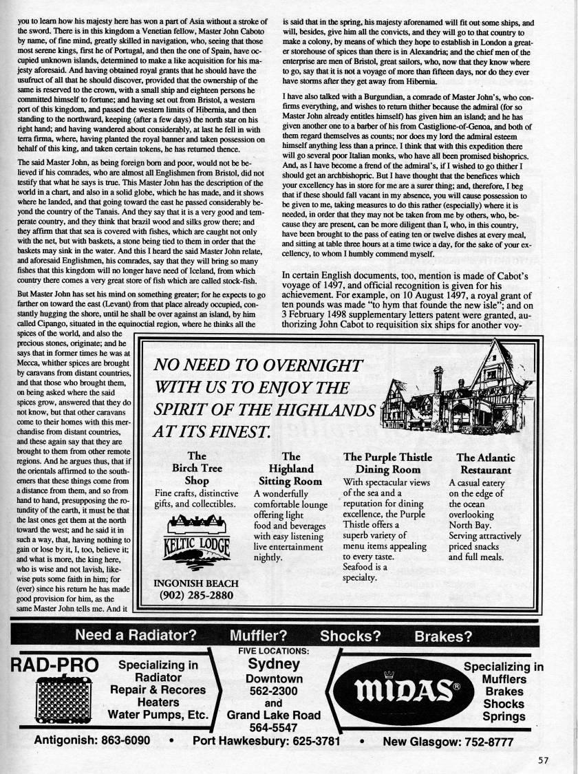 you to leam how his majesty here has won a part of Asia without a stroke of the sword. There is in this kingdom a Venetian fellow. Master John Caboto by name, of fme mind, greatly skilled in navigation, who, seeing that those most serene kings, first he of Portugal, and then the one of Spain, have oc? cupied unknown islands, determined to make a like acquisition for his ma? jesty aforesaid. And having obtained royal grants that he should have the usufruct of all that he should discover, provided that the ownership of the same is reserved to the crown, with a small ship and eighteen persons he committed himself to fortune; and having set out from Bristol, a western port of this kingdom, and passed the western limits of Hibemia, and then standing to the northward, keeping (after a few days) the north star on his right hand; and having wandered about considerably, at last he fell in with terra firma, where, having planted the royal baimer and taken possession on behalf of this king, and taken certain tokens, he has returned thence. The said Master John, as being foreign bom and poor, would not be be? lieved if his comrades, who are almost all Englishmen from Bristol, did not testify that what he says is trae. This Master John has the description of the world in a chart, and also in a solid globe, which he has made, and it shows where he landed, and that going toward the east he passed considerably be? yond the country of the Tanais. And they say that it is a very good and tem? perate country, and they think that brazil wood and silks grow there; and they affirm that that sea is covered with fishes, which are caught not only with the net, but with baskets, a stone being tied to them in order that the baskets may sink in the water. And this I heard the said Master John relate, and aforesaid Englishmen, his comrades, say that they will bring so many fishes that this kingdom will no longer have need of Iceland, from which country there comes a very great store of fish which are called stock-fish. But Master John has set his mind on something greater; for he expects to go farther on toward the east (Levant) from that place already occupied, con? stantly hugging the shore, until he shall be over against an island, by him called Cipango, situated in the equinoctial region, where he thinks all the spices of the world, and also the precious stones, originate; and he says that in former times he was at Mecca, whither spices are brought by caravans from distant countries, and that those who brought them, on being asked where the said spices grow, answered that they do not know, but that other caravans come to their homes with this mer? chandise from distant countries, and these again say that they are brought to them from other remote regions. And he argues thus, that if the orientals affirmed to the south? erners that these things come from a distance from them, and so from hand to hand, presupposing the ro? tundity of the earth, it must be that the last ones get them at the north toward the west; and he said it in such a way, that, having nothing to gain or lose by it, 1, too, beUeve it; and what is more, the king here, who is wise and not lavish, like? wise puts some faith in him; for (ever) since his retum he has made good provision for him, as the same Master John tells me. And it is said that in the siting, his majesty aforenamed will fit out some ships, and will, besides, give him all the convicts, and they wiU go to that country to make a colony, by means of which they hope to estabUsh in Lcmdon a great? er storehouse of spices than there is in Alexandria; and the chief men of the enterprise are men of Bristol, great sailors, who, now that they know where to go, say that it is not a voyage of more than fifteen days, nor do they ever have storms after they get away from Hibemia. I have also talked with a Burgundian, a comrade of Master John's, who con? firms everything, and wishes to retum thith' because the admiral (for so Master John already entitles himself) has given him an island; and he has given another one to a baitjer of his from Castiglione-of-Cienoa, and both of them regard themselves as counts; nor does my lOTd the admiral esteem himself anything less than a prince. I think that with this expedition there will go several poor Italian monks, who have all been promised bishoprics. And, as I have become a frend of the admiral's, if I wished to go thither I should get an archbishopric. But I have thought that the l)enefices which your excellency has in store for me are a surer thing; and, therefore, I beg that if these should fall vacant in my absence, you will cause possession to be given to me, taking measures to do this rather (especially) where it is needed, in order that they may not be taken frOTti me by others, who, be? cause they are present, can be more diligent than I, who, in this country, have been brought to the pass of eating ten or twelve dishes at every meal, and sitting at table three hours at a time twice a day, for the sake of your ex? cellency, to whom I humbly commend myself. In certain English documents, too, mention is made of Cabot's voyage of 1497, and official recognition is given for his achievement. For example, on 10 August 1497, a royal grant of ten pounds was made "to hym that founde the new isle"; and on 3 February 1498 supplementary letters patent were granted, au? thorizing John Cabot to requisition six ships for another voy- NO NEED TO OVERNIGHT WITH US TO ENJOY THE SPIRIT OF THE HIGHLANDS ATITSFINEST The Birch Tree Shop Fine crafts, distinctive gifts, and collectibles. KElTj'DGF The Highland Sitting Room A wonderftiUy comfortable lounge offering light food and beverages with easy listening live entertainment nighdy. INGONISH BEACH (902) 285-2880 The Purple Thistle Dining Room With spectacular views of the sea and a reputation for dining excellence, the Purple Thistle offers a superb variety of menu items appealing to every taste. Seafood is a specialt