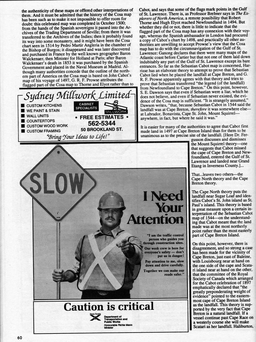 the authenticity of these maps or offered other interpretations of them. And it must be admitted that the history of the Cosa map has been such as to make it not impossible to offer room for doubt: this celebrated map was completed in October 1500; from the hands of the Spanish sovereigns it passed into the Ar? chives of the Trading Department of Seville; from there it was transferred to the Archives of the Indies; then it probably found its way into some monastery, and it might have been the Cosa chart seen in 1514 by Pedro Martir Angleria in the chamber of the Bishop of Burgos; it disappeared and was later discovered and purchased in France by the well known geographer Baron Walckenaer, then Minister for Holland at Paris; after Baron Walckenaer's death in 1853 it was purchased by the Spanish Government and placed in the Naval Museum at Madrid. Al? though many authorities concede that the outline of the north- em part of America on the Cosa map is based on John Cabot's map of his voyage of 1497, G. R. F. Prowse attributes the flagged part of the Cosa map to Thome and Elyot rather than to r Sydney MUC'WorkJ'imiudr I CUSTOM KITCHENS I WE PAINT & STAIN I WALL UNITS I COUNTERTOPS I CUSTOM WOOD WORK I CUSTOM FRAMING FREE ESTIIVIATES 562-5344 50 BROOKLAND ST. '''Brln?? 'your Idtas to Life!' Caution is critical ' Public Works Honourable RicNe Mann Cabot, and says that some of the flags mark points in the Gulf of St. Lawrence. There is, as Professor Brebner says in The Ex? plorers of North America, a remote possibility that Robert Thome and Hugh Elyot reached Newfoundland in 1494. But whether they did or not, there is little to indicate that the flagged part of the Cosa map has any coimexion with their voy? age, whereas the Spanish ambassador in London had procured a copy of Cabot's chart by 1498, and practically all other au? thorities are unwilling to accept Prowse's view that the Cosa map has to do with the circumnavigation of the Gulf of St. Lawrence: Ganong declares that there were many maps of the Atlantic coast before Cartier but that not one of them laid down indubitably any part of the Gulf of St. Lawrence except its bare entrances. So far as the Sebastian Cabot map is concerned, Har- risse has an elaborate theory to attempt to prove that Sebastian Cabot lied when he placed the landfall at Cape Breton, and G. R. F. Prowse apparently agrees with that theory and tries to prove that Sebastian ti-ansferred "the legend (of the landfall) from Newfoundland to Cape Breton." On this point, however, S. E. Dawson says that even if Sebastian were a liar, which he does not believe, and even if Sebastian never existed, the evi? dence of the Cosa map is sufficient. "It is strangely assumed," Dawson writes, "that, because Sebastian Cabot in 1544 said the landfall was at Cape Breton, therefore it was somewhere else • at Labrador, Bonavista, Cape St. John, Mount Squirrel • anywhere, in fact, but where he said it was." It is easier for many of the authorities to agree that Cabot first made land in 1497 at Cape Breton Island 'an for them to be unanimous as to the precise site of the landfall. [Here Dr. Fer? gusson discusses and dismisses tiie Mount Squirrel theory • one that suggests that Cabot missed the cape of Cape Breton and New? foundland, entered the Gulf of St. Lawrence and landed near Grand Etang in Invemess County.]... That...leaves two others • 'the Cape North theory and the Cape Breton theory. The Cape North theory puts the landfall near Sugar Loaf and iden? tifies Cabot's St. John island as St. Paul's island. This theory is based in great measure upon a certain in? terpretation of the Sebastian Cabot map of 1544 • on the understand? ing that Cabot meant that the land made was at the most northerly point rather than the most easterly part of Cape Breton Island. On this point, however, there is disagreement, and so strong a case has been made for the vicinity of Cape Breton, just east of Baleine, with Louisbourg near at hand on the one side of the cape and Scata? ri island near at hand on the other, that the committee of the Royal Society of Canada which arranged for the Cabot celebration of 1897 emphatically declared that "the greatly preponderating weight of evidence" pointed to Sie eastem- most cape of Cape Breton Island as the landfall. This theory is sup? ported by the very fact that Cape Breton is a natural landfall. If a vessel continue past Cape Race on a westerly course she will make Scatari as her landfall. Haliburton, IlSfeed Mjur AttoiticMi 0??r we'??Jk ?i?ew J$ Jtece for ev?ig??iB?'?? ??fe' • <4??a*t put *?? ifl