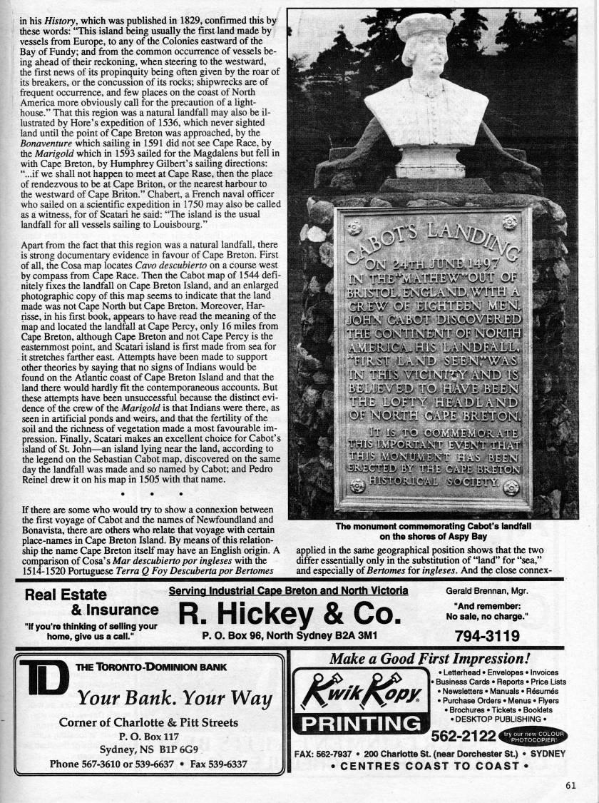 in his History, which was published in 1829, confirmed this by these words: "This island being usually the first land made by vessels from Europe, to any of the Colonies eastward of the Bay of Fundy; and from the common occurrence of vessels be? ing ahead of their reckoning, when steering to the westward, the first news of its propinquity being often given by the roar of its breakers, or the concussion of its rocks; shipwrecks are of frequent occurrence, and few places on the coast of North America more obviously call for the precaution of a light? house." That this region was a natural landfall may also be il? lustrated by Hore's expedition of 1536, which never sighted land until the point of Cape Breton was approached, by the Bonaventure which sailing in 1591 did not see Cape Race, by the Marigold which in 1593 sailed for the Magdalens but fell in with Cape Breton, by Humphrey Gilbert's sailing directions: "...if we shall not happen to meet at Cape Rase, then the place of rendezvous to be at Cape Briton, or the nearest harbour to the westward of Cape Briton." Chabert, a French naval officer who sailed on a scientific expedition in 1750 may also be called as a witness, for of Scatari he said: "The island is the usual landfall for all vessels sailing to Louisbourg," Apart from the fact that this region was a natural landfaU, there is strong documentary evidence in favour of Cape Breton. First of all, the Cosa map locates Cavo descubierto on a course west by compass from Cape Race. Then the Cabot map of 1544 defi? nitely fixes the landfall on Cape Breton Island, and an enlarged photographic copy of this map seems to indicate that the land made was not Cape North but Cape Breton. Moreover, Har- risse, in his first book, appears to have read the meaning of the map and located the landfall at Cape Percy, only 16 miles from Cape Breton, although Cape Breton and not Cape Percy is the eastemmost point, and Scatari island is first made from sea for it stretches farther east. Attempts have been made to support other theories by saying that no signs of Indians would be found on the Atlantic coast of Cape Breton Island and that the land there would hardly fit the contemporaneous accounts. But these attempts have been unsuccessful because the distinct evi? dence of the crew of the Marigold is that Indians were there, as seen in artificial ponds and weirs, and that the fertility of the soil and the richness of vegetation made a most favourable im? pression. Finally, Scatari makes an excellent choice for Cabot's island of St. John • an island lying near the land, according to the legend on the Sebastian Cabot map, discovered on the same day the landfall was made and so named by Cabot; and Pedro Reinel drew it on his map in 1505 with that name. If there are some who would try to show a connexion between the first voyage of Cabot and the names of Newfoundland and Bonavista, there are others who relate that voyage with certain place-names in Cape Breton Island. By means of this relation? ship the name Cape Breton itself may have an English origin. A comparison of Cosa's Mar descubierto por ingleses with 3ie 1514-1520 Portuguese Terra Q Foy Descuberta por Bertomes H''''''''''''''i The monument commemorating Cabot's landfall on the shores of Aspy Bay applied in the saihe geographical position shows that the two differ essentially only in the substitution of "land" for "sea," and especially of Bertomes for ingleses. And the close connex- Real Estate & Insurance "If you're thinidng of selling your home, give us a call." Serving Industrial Cape Breton and North Victoria R. Hickey & Co. p. O. Box 96, North Sydney B2A 3M1 Gerald Brennan, Mgr. "And remember: No sale, no charge." 794-3119 1D THE IbROINTTO-DOMINION BANK Your Bank. Your Way Corner of Charlotte & Pitt Streets P. O. Box 117 Sydney, NS B1P6G9 Phone 567-3610 or 539-6637 • Fax 539-6337 Make a Good First Impression! opy. PRINTING • Letterhead • Envelopes • Invoices Business Cards • Reports • Price Lists • Newsletters • Manuals • Resumes • Purcliase Orders • Menus • Flyers • Brocliures • Tickets • Booklets • DESKTOP PUBLISHING • '562-2122' FAX: 562-7937 • 200 Charlotte St. (near Dorchester St.) • SYDNEY • CENTRES COAST TO COAST • 61