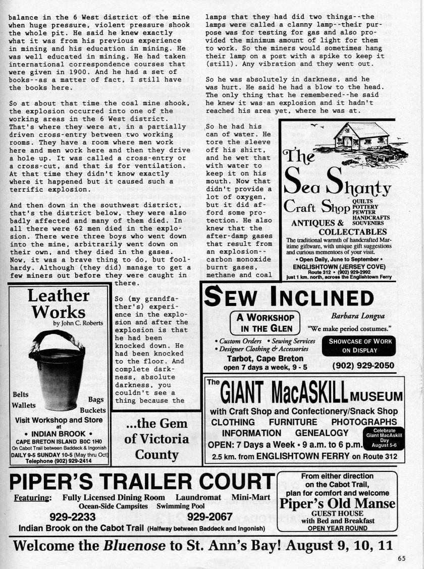 Published by Ronald Caplan on 1996/6/1 (224 reads)balance in the 6 West district of the mine when huge pressure, violent pressure shook the whole pit. He said he knew exactly what it was from his previous experience in mining and his education in mining. He was well educated in mining. He had taken international correspondence courses that were given in 1900. And he had a set of books--as a matter of fact, I still have the books here. So at about that time the coal mine shook, the explosion occurred into one of the working areas in the 6 West district. That's where they were at, in a partially driven cross-entry between two working rooms. They have a room where men work here and men work here and then they drive a hole up. It was called a cross-entry or a cross-cut, and that is for ventilation. At that time they didn't know exactly where it happened but it caused such a terrific explosion. And then down in the southwest district, that's the district below, they were also badly affected and many of them died. In all there were 62 men died in the explo? sion. There were three boys who went down into the mine, arbitrarily went down on their own, and they died in the gases. Now, it was a brave thing to do, but fool? hardy. Although (they did) manage to get a few miners out before they were caught in there. So (my grandfa? ther's) experi? ence in the explo? sion and after the explosion is that he had been knocked down. He had been knocked to the floor. And complete dark? ness, absolute darkness, you couldn't see a thing because the Leather Works by John C. Roberts Bags Buckets Visit Workshop and Store at • INDIAN BROOK • CAPE BRETON ISLAND BOC 1 HO On Cabot Trail between Baddeck & Ingonish DAILY 9-5 SUNDAY 10-5 (l'ay thru Oct Telephone (902) 929-2414 ...the Gem of Victoria County lamps that they had did two things--the lamps were called a clanny lamp--their pur? pose was for testing for gas and also pro? vided the minimum amount of light for them to work. So the miners would sometimes hang their lamp on a post with a spike to keep it (still). Any vibration and they went out. So he was absolutely in darkness, and he was hurt. He said he had a blow to the head. The only thing that he remembered--he said he knew it was an explosion and it hadn't reached his area yet, where he was at. So he had his can of water. He tore the sleeve off his shirt, and he wet that with water to keep it on his mouth. Now that didn't provide a lot of oxygen, but it did af? ford some pro? tection. He also knew that the after-damp gases that result from an explosion-- carbon monoxide burnt gases, methane and coal CO QUILTS raft blLop!?'?;' . • • HANDCRAFTS ANTIQUES & SOUVENIRS COLLECTABLES The traditional warmth of handcrafted Mar? itime giftware, with unique gift suggestions and curious mementoes of your visit • Open Dally, June to September • ENGLISHTOWN (JERSEY COVE) Route 312 • (902) 929-2992 just 1 km. north, across the Englishtown Ferry Sew Inclined r A Workshop 1 [ IN THE Glen J Barbara Longva "We make period costiunes." • Custom Orders • Sewing Services • Designer Clothing & Accessories Tarbot, Cape Breton open 7 days a week, 9 - 5 Showcase of work on display (902) 929-2050 'GIANT MacASKILLMusBUMi with Craft Shop and Confectionery/Snack Shop CLOTHING FURNITURE PHOTOGRAPHS INFORMATION GENEALOGY OPEN: 7 Days a Week • 9 a.m. to 6 p.m.l 2.5 km. from ENGLISHTOWN FERRY on Route 312 PIPER'S TRAILER COURT Featuring: Fully Licensed Dining Room Laundromat Mini-Mart Ocean-Side Campsites Swimming Pool 929-2233 929-2067 Indian Brook on the Cabot Trail (Halfway between Baddeck and Ingonish) From either direction on the Cabot Trail, plan for comfort and welcome Piper's Old Manse GUESTHOUSE with Bed and Breakfast , OPEN YEAR ROUND ' Welcome the Bluenose to St. Ann's Bay! August 9,10, 11 65