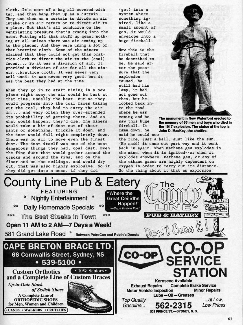 Published by Ronald Caplan on 1996/6/1 (183 reads)cloth. It's sort of a bag all covered with tar, and they hang them up as a curtain. They use them as a curtain to divide an air intake or an air return or to direct air to a place. But that's all conducive on the ventilating pressure that's coming into the area. Putting all that stuff up meant noth? ing at all unless there was air coming up to the places. And they were using a lot of that brattice cloth. Some of the miners claimed that they could not get this brat? tice cloth to direct the air to the (coal) faces.... So it was a division of air. It provided a division of air for all the min? ers. . .brattice cloth. It was never very well used, it was never very good, but it was the best they had at the time. When they go in to start mining in a new place right away the air would be best at that time, usually the best. But as they would progress into the coal faces taking out the coal, they had to carry the air in..., and very often they over-extended its probability of getting there. And so what would happen, they'd die. The miners would take a bit of dust out of their pants or something, trickle it down, and the dust would fall right completely down. There was no air to move even the finest dust. The dust itself was one of the most dangerous things they had, coal dust. Even the fine dust that would gather around the cracks and around the rims, and on the floor and on the ceilings, and would dry out. That was also highly explosive. So if they did get into a mess, if they did (get) into a system where something ig? nited, like a small amount of gas, it would envelope into a huge fireball. Now this is the fireball that he described to me. He said af? ter the pres? sure that the explosion caused, he still had his lamp, it had not gone out then, but he looked back in? to the road where he was coming and he saw this huge fireball. It came down, he said he could see the fire, just a ball. Just like the sun. (He said) it came out part way and it went back in again. When methane gas explodes in the mine, when it is ignited--or when it explodes anywhere--methane gas, or any of the ethane gases are highly dependent on oxygen in order to carry out its distance. So the thing about it that an explosion The monument in New Waterford erected to the memory of 65 men and boys who died in the 1917 explosion. The statue at the top is John D. MacKay, the shotfire. County Line Pub & Eatery FEATURING "" Nightly Entertainment * ** Daily Homemade Specials Open 11 AM to 2 AlVI • 7 Days a Week! 581 Grand Lake Road * "Where the Great Ceilidhs I Happen!" | Between PetroCan and Robin's Donuts CAPE BRETON BRACE LTD. 66 Cornwallis Street, Sydney, NS • 539-5100 • CO-OP' Custom Orthotics VUIKSB and a Complete Line of Custom Braces Up-to-Date Stock of Stylish Shoes A Complete Line of ORTHOPEDIC SHOES for Men, Women and Children (??CANES 'WALKERS ?? CRUTCHES) CO-OP SERVICE STATION Kerosene Available Exhaust Repairs Complete Brake Service Motor Vehicle Inspection Minor Repairs Lube • Oil • Greases Top Quality ...at Low, Gasoline... 562-2315 'ow Prices 503 PRINCE ST. • SYDNEY, N. S. 67