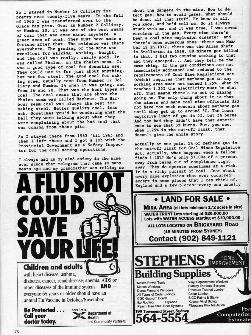 Published by Ronald Caplan on 1996/6/1 (234 reads)So I stayed in Number 18 Colliery for pretty near twenty-five years. In the fall of 1963 I was transferred over to the Glace Bay pits. Over in Number 2 Colliery, or Number 20, it was one of the best seams of coal that was ever mined anywhere. A great seam of coal. They must have made a fortune after that. The evidence was there everywhere. The grading of the mine was excellent for walking, working, height, and the coal was really, really good. It was called Phalen, on the Phalen seam. It was a good type of coal for domestic use. They could use it for just about anything, but not for steel. The good coal for mak? ing steel usually came from Number 12 Col? liery and Number 14 when it was going, and from 26 and 20. That was the best types of coal. The coal seams that are above the Phalen seam was called Harbour. The Har? bour seam coal was always the best for making steel. Better quality coal, less ash. Sometimes you'd be wondering what the hell they were talking about when they were complaining about the bad coal that was coming from those pits. So I stayed there from 1963 'til 1965 and then I left there and I got a job with the Provincial Government as a Safety Inspec? tor for the coal mining operations. I always had in my mind safety in the mine ever since that telegram that came so many years ago and my grandfather was telling me A Fill SHOT Children and adults with heart disease, asthma, diabetes, cancer, renal disease, anemia, AIDS or other diseases of the immune system • AND • everyone 65 years or older should have an annual Flu Vaccine in October/November. Be Proteited. Call your doctor today. Nova Scotia "'fisl' Department of ''W Health and Community Partners about the dangers in the mine. How to de? tect gas, how to avoid gases, what should be done, all that stuff. He knew it all, you know, and he'd tell me. So it always stuck with me, and it was true, I was never careless in the gas. Every time there's been a coal mine explosion disaster--and there's been numerous ones--there was Num? ber 12 in 1917, there was the Allan Shaft in Stellarton in 1918, 88 miners got killed in that. I had two cousins working to that and they escaped.... And they tell me the same thing. If the gas conditions are not immediately addressed and reduced to the requirements of Coal Mine Regulations Act (which) requires that methane gas in any working area must not exceed 1.25%. When it reaches 1.25% the electricity must be shut off. That means there's no act of mining going on. The only thing about it is that the miners and many coal mine officials did not have too much concern about methane gas until they get up to around 3%. The lower explosive limit of gas is 5%. but 3% burns. And too bad they didn't have that experi? ence to see that 3% burns. But, you see, when 1.25% is the cut-off limit, that doesn't give the whole story. Actually at one point 5% of methane gas is the cut-off limit for Coal Mines Regulation Act. Actually, what happens when a fellow finds 1.20%? He's only 5/lOOs of a percent away from being out of compliance right away. They do operate sometimes at a risk. It is a risky pursuit of coal. Just about every mine explosion that ever occurred-- except in some places that I can think of, England and a few places--every one usually • LAND FOR SALE • Mira Area (all lots minimum 1/2 acres in size) WATER FRONT Lots starting at $20,000.00 Lots with WATER ACCESS starting at $10,000.00 ALL LOTS LOCATED ON BRICKYARD ROAD (15 IVIINUTES FROIVI SYDNEY) Contact (902) 849-1121 Building Supplies '' Makita Power Tools Mason Windows Donat Flamand Windows All Types ot Cedar Sidings CGC Gypsum Board Iko Roofing Plywood Peach Tree Steel Door Systems Vinyl Replacement Windows Stanley Entrance Systems Pressure Treated Lumtier Cedar Lumtjer SICO Paints & Stains Kaycan Vinyl Siding Fibreglass Pink Insulation 199 Townsend Street, Sydbney 564-5554 70