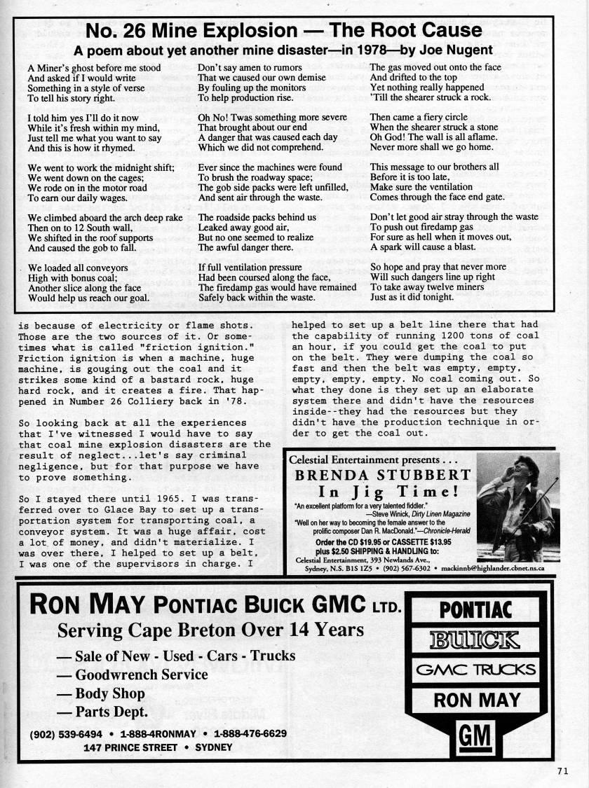 Published by Ronald Caplan on 1996/6/1 (378 reads)No. 26 Mine Explosion • The Root Cause A poem about yet another mine disaster • in 1978 • by Joe Nugent A Miner's ghost before me stood And asked if I would write Something in a style of verse To tell his story right. I told him yes I'll do it now While it's fresh within my mind. Just tell me what you want to say And this is how it rhymed. We went to work the midnight shift; We went down on the cages; We rode on in the motor road To eam our daily wages. We climbed aboard the arch deep rake Then on to 12 South wall. We shifted in the roof supports And caused the gob to fall. We loaded all conveyors High with bonus coal; Another slice along the face Would help us reach our goal. Don't say amen to rumors That we caused our own demise By fouling up the monitors To help production rise. Oh No! Twas something more severe That brought about our end A danger that was caused each day Which we did not comprehend. Ever since the machines were found To brush the roadway space; The gob side packs were left unfilled. And sent air through the waste. The roadside packs behind us Leaked away good air. But no one seemed to realize The awful danger there. If full ventilation pressure Had been coursed along the face. The firedamp gas would have remained Safely back within the waste. The gas moved out onto the face And drifted to the top Yet nothing really happened 'Till the shearer struck a rock. Then came a fiery circle When the shearer struck a stone Oh God! The wall is all aflame. Never more shall we go home. This message to our brothers all Before it is too late. Make sure the ventilation Comes through the face end gate. Don't let good air stray through the waste To push out firedamp gas For sure as hell when it moves out, A spark will cause a blast. So hope and pray that never more Will such dangers line up right To take away twelve miners Just as it did tonight. is because of electricity or flame shots. Those are the two sources of it. Or some? times what is called "friction ignition." Friction ignition is when a machine, huge machine, is gouging out the coal and it strikes some kind of a bastard rock, huge hard rock, and it creates a fire. That hap? pened in Number 26 Colliery back in '78. So looking back at all the experiences that I've witnessed I would have to say that coal mine explosion disasters are the result of neglect... let's say criminal negligence, but for that purpose we have to prove something. So I stayed there until 1965. I was trans? ferred over to Glace Bay to set up a trans? portation system for transporting coal, a conveyor system. It was a huge affair, cost a lot of money, and didn't materialize. I was over there, I helped to set up a belt, I was one of the supervisors in charge. I helped to set up a belt line there that had the capability of running 1200 tons of coal an hour, if you could get the coal to put on the belt. They were dumping the coal so fast and then the belt was empty, empty, empty, empty, empty. No coal coming out. So what they done is they set up an elaborate system there and didn't have the resources inside--they had the resources but they didn't have the production technique in or? der to get the coal out. Celestial Entertainment presents . . . BRENDA STUBBERT In Jig Time! "An excellent platform for a very talented fiddler." • Steve Winick, Dirty Linen Magazine "Well on her way to becoming tfie female answer to the prolific composer Dan R. MacDonald." • C/jron/c/e-HeraW Order the CD $19.95 or CASSEHE $13.95 plus $2.50 SHIPPING & HANDUNG to: Celestial Entertainment, 393 Newlands Ave., Sydney, N.S. BIS 1Z5 • (902) 567-6302 • mackinnb@liighlander.cbnet.ns.ca Ron May pontiac buick gmc ltd. Serving Cape Breton Over 14 Years • Sale of New - Used - Cars - Trucks • Goodwrench Service • Body Shop • Parts Dept. (902)539-6494 • 1-888-4R0NIVIAY • 1-888476-6629 147 PRINCE STREET • SYDNEY PONTIAC MffllQE GAACTTRUCKS RON MAY 71