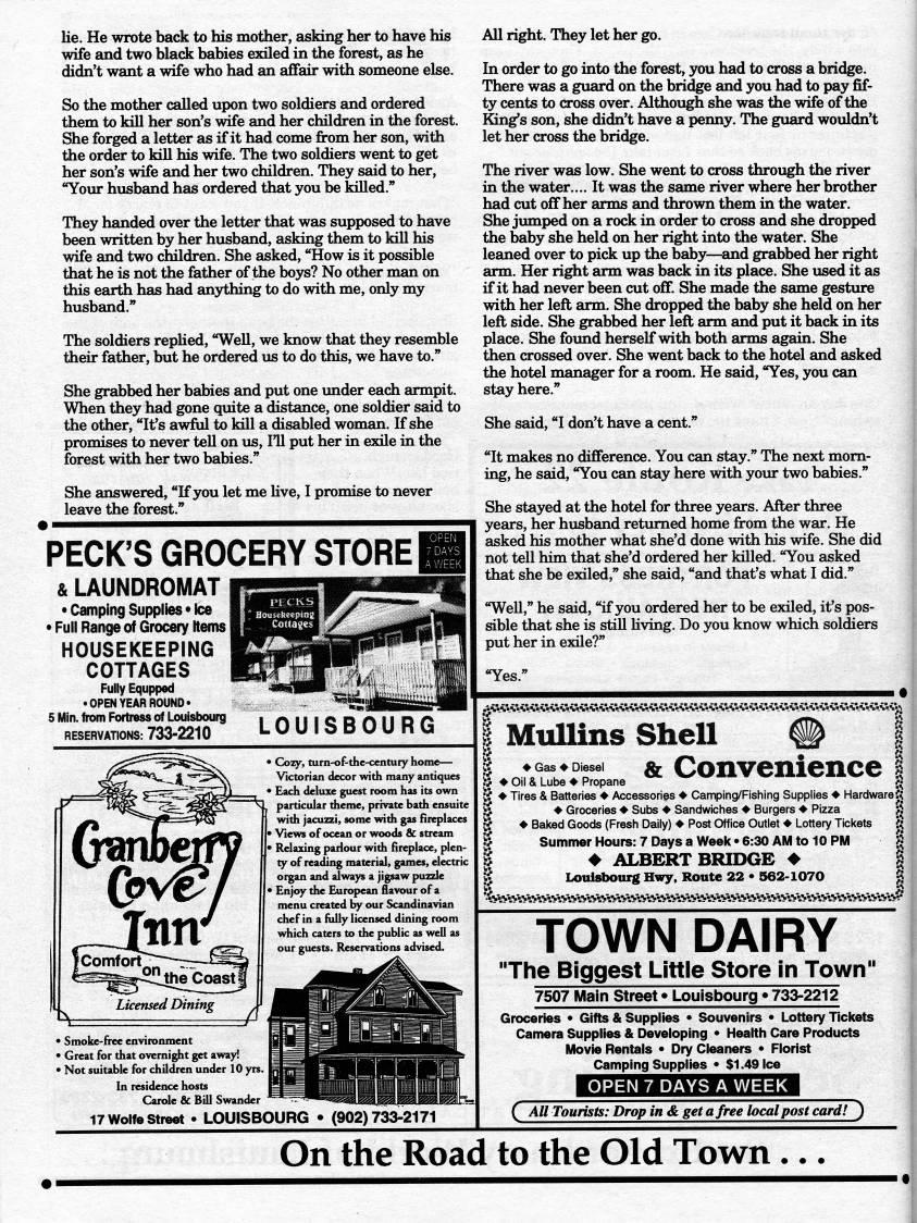 Ue. He wrote back to his mother, asking her to have his wife and two black babies exiled in the forest, as he didn't want a wife who had an affair with someone else. So the mother called upon two soldiers and ordered them to kill her son's wife and her children in the forest. She forged a letter as tf it had come from her son, with the order to kill his wife. The two soldiers went to get her son's wife and her two children. They said to her, "Your husband has ordered that you be killed." They handed over the letter that was supposed to have been written by her husband, asking them to kill his wffe and two children. She asked, "How is it possible that he is not the father of the boys? No other man on this earth has had anything to do with me, only my husband." The soldiers repHed, "Well, we know that they resemble their father, but he ordered us to do this, we have to." She grabbed her babies and put one imder each armpit. When they had gone qiaite a distance, one soldier said to the other, "It's awfiil to kill a disabled woman. If she promises to never tell on us, 111 put her in exile in the forest with her two babies." She answered, "If you let me Hve, I promise to never leave the forest." PECK'S GROCERY STORE & LAUNDROMAT • Camping Supplies • Ice • Full Range of Grocery Items HOUSEKEEPING COTTAGES Fully Equpped • OPEN YEAR ROUND* 5 Min. from Fortress of Louisbourg RESERVATIONS: 733-2210 LOUISBOURG • CjoTf, turn-of-thc-centuiy home • Victorian decor with many antiques • Each deluxe guest room has its own particular theme, private bath ensuite with Jacuzzi, some with gas fireplaces ! • Views of ocean or woods & stream • Relaxing parlour with fireplace, plen? ty of reading material, games, electric oi';an and always a jigsaw puzzle Enjoy the European flavour of a menu created, by our Scandinavian chef in a fully licensed dining room which caters to the public as well as our guests. Reservations advised. • Smoke-fi-ee environment • Great for that overnight gpt away! • Not suitable for children under 10 yrs. In residence hosts Carole & Bill Swander ' 17 Wolfe Street • LOUISBOURG • (902)733-2171 All right. They let her go. In order to go into the forest, you had to cross a bridge. There was a guard on the bridge and you had to pay fif? ty cents to cross over. Although she was the wife of the King's son, she didn't have a penny. The guard wouldn't let her cross the bridge. The river was low. She went to cross through the river in the water.... It was the same river where her brother had cut off her arms and thrown them in the water. She jumped on a rock in order to cross and she dropped the baby she held on her right into the water. She leaned over to pick up the baby • 'and grabbed her right arm. Her right arm was back in its place. She used it as if it had never been cut off. She made the same gesture with her left arm. She dropped the baby she held on her left side. She grabbed her left arm and put it back in its place. She foimd herself with both arms again. She then crossed over. She went back to the hotel and asked the hotel manager for a room. He said, "Yes, you can stay here." She said, "I don't have a cent." "It makes no difference. You can stay." The next morn? ing, he said, "You can stay here with your two babies." She stayed at the hotel for three years. After three years, her husband returned home from the war. He asked his mother what she'd done with his wife. She did not tell him that she'd ordered her killed. "You asked that she be exiled," she said, "and that's what I did." "Well," he said, "if you ordered her to be exiled, it's pos? sible that she is still Uving. Do you know which soldiers put her in exile?" "Yes." A?A"A"sVtt's?"'?'s?%VvVV??%i"A"AVsVsVW b?S-S-S-A-%"A?A??A"'-%?S?S-S?%"1i"%"%i : MuUins Shell Lo;a:!rXa.e & convenience | [ Tires & Batteries Accessories Camping/Fishing Supplies Hardware ft I Groceries Subs Sandwiches Burgers Pizza % : Baked Goods (Fresh Daily) Post Office Outlet Lottery Tickets % Summer Hours: 7 Days a Week • 6:30 AM to 10 PM ALBERT BRIDGE % LouistiouTg Hwy, Route 22 • 562-1070 % TOWN DAIRY "The Biggest Little Store in Town" 7507 Main Street • Louisbourg • 733-2212 Groceries • Gifts & Supplies • Souvenirs • Lottery Ticlcets Camera Supplies & Developing • Health Care Products Movie Rentals • Dry Cleaners • Florist Camping Supplies • $1.49 Ice OPEN 7 DAYS A WEEK ( All Tourists: Drop in & get a free local post card! ) On the Road to the Old Town .