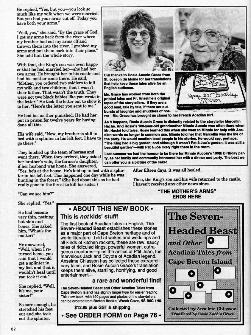 He replied, "Yes, but you • 'you look so much like my wife when we were married. But you had your arms cut off. Today you have both your arms." "Well, yes," she said. "By the grace of God, I got my arms back from the river where my brother had cut my arms off and thrown them into the river. I grabbed my arms and put them back into their place." She told him the whole story. With that, the King's son was even happi? er that he had married her • she had her two arms. He brought her to his castle and had his mother come there. He said, "Mother, you ordered two soldiers to kill my wife and two children, that I wasn't their father. That wasn't the truth. They were not two black babies like you wrote in the letter." He took the letter out to show it to her. "Here's the letter you sent to me." He had his mother punished. He had her put in prison for twelve years for having done all this. His wife said, "Now, my brother is still in bed with a splinter in his left foot. I have to go there." If 'm'-my' They hitched up the team of horses and went there. When they arrived, they asked her brother's wife, the farmer's daughter, if her husband was home. She answered, "Yes, he's at the house. He's laid up in bed with a splin? ter in his left foot. This happened one day while he was hunting in the forest." (She lied about this as he had really gone in the forest to kill his sister.) "Can we see him?" Our thanks to Rosie Aucoin Grace from St. Joseph du lUloine for her translations that help keep these tales alive for an English audience. Ms. Grace has worked from both the printed tales and Fr. Anselme's original tapes of the storytellers. If they are a good read, tale by tale, if there are out? bursts of laughter and shudders of hor- ror--Ms. Grace has brought us closer to her French Acadian turf. As it happens, Rosie Aucoin Grace is distantly related to the storyteller Marcellin Hach'. And Rosie's 100-year-old grandmother Minnie Aucoin was often there when Mr. Hach' told tales. Rosie learned this when she went to Minnie for help with Aca? dian words no longer in common use. Minnie toM her that Marcellin was the life of the party. He would mentton kx??l people in his stories. He woukl say, perhaps, "The King had a big garden; and although It wasn't Pat it Joe's garden, it was still a beautiful garden" • with Pat k Joe likely right there in the room. Last summer we had the honour to be there for Minnie Aucoin's 100th birthday par? ty, as her family and community honoured her with a dinner and party. The best we can offer you is a picture of the cake! After fifteen days, it was all healed. Then, the King's son and his wife returned to the castle. I haven't received any other news since. "THE MOTHER'S ARMS" ENDS HERE She replied, "Yes." He had become very thin, nothing but skin and bones. She asked him, "What's the matter?" He answered, "Well, when I re? turned home, you said that I would get a splinter in my foot and that it wouldn't heal until you took it out." She replied, "Well, it's me, your sister!" So sure enough, he stretched his foot out and she took out the sphnter. • ABOUT THIS NEW BOOK • This is nof kids' stuff! The first book of Acadian tales in English, The Seven-Headed Beast establishes these stories as a major part of Cape Breton heritage and of world literature. Told at wakes and weddings and all kinds of kitchen rackets, these are raw, saucy tales of ridiculed kings, powerful women, outra? geous creatures • plus the antics of P'tit Jean, the marvelous Jack and Coyote of Acadian legend. Anselme Chiasson has collected these extraordi? nary tales, and Rosie Aucoin Grace's translation keeps them alive, startling, horrifying, and good entertainment • a rare and wonderful find! The Seven-Headed Beast and Other Acadian Tales from Cape Breton Island has slightly larger type for easier reading. This new book, with 190 pages and photos of the storytellers, can be ordered from Breton Books, Wreck Cove, NS BOC IHO. $12.95 plus GST & shipping • See ORDER FORM on Page 76 • The Seven- Headed Beast andOther Acadian Tales from Cape Breton Island Tr'??lifcteilby Bo?iie Asoeoitt Gx't'fe 82