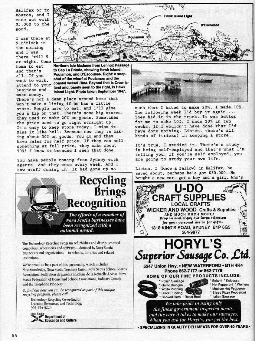 Halifax or to Boston, and I came out with $5,000 to the good. I was there at 9 o'clock in the morning and I was there 'till 9 at night. Come home to eat and that's all. If you want to work, attend to your business and make money. There's not a damn place around here that won't make a living if he has a little store. People have to eat. And I'll give you a tip on that. There's some big stores, they used to make 20% on goods. Sometimes the price used to go right straight up. It's easy to keep store today. I miss it. Miss it like hell. Because now they're mak? ing about 30% on goods. You go and they have sales for half price. If they can sell something at full price, they make about 50%! I know it because I seen that done. You have people coming from Sydney with agents. And they come every week. And I saw stuff coming in. It had gone up so Hawk Island Light Northern Isle Madame from Lennox Passage to Cap La Ronde, showing Hawk island, Poulamon, and D'Escousse. Right: a snap? shot of the wharf at Poulamon and the coastal vessel Ulna. Beyond that is Crow is? land and, barely seen to the right, is Hawk Island Light. Photo taken September 1947. Recycling Brings Recognition IIP The efforts of a number of p' Nova Scotia businesses have '* been recognized with a national award. The Technology Req'cling Program refurbishes and distributes used computers, accessories and software • donated by Nova Scotia businesses and organizations • to schools, Ubraries and related institutions. We're proud to be a part of this partnership which includes NovaKnowledge, Nova Scotia Teachers Union, Nova Scotia School Boards Association, Federation de parents acadiens de la NouveUe-Ecosse, Nova Scotia Federation of Home and School Associations, Industry Canada and the Telephone Pioneers. To find out how you can be recognized as part of this unique recycling program, please call: Technology Recycling Co-ordinator Learning Resources and Technology 902-424-5229 Department of Education and Culture much that I hated to make 20%. I made 10%. The following week I'd buy it again.... They had it in the truck. It was better for me to make 10%. I made 20% in two weeks. If I wouldn't have done that I'd have done nothing. Listen, there's all kinds of (tricks) in keeping a store. It's true, I studied it. There's a study in being self-employed and that's what I'm telling you. If you're self-employed, you are going to study your own life. Listen, I (know a fellow) in Halifax, he saved about, perhaps he's got $30,000. He bought a new car, got a boy and a girl. Who's U-DO CRAFT SUPPLIES LOCAL CRAFTS WICKER AND WOOD Crafts & Supplies AND MUCH MUCH MORE! Drop in and, enjoy our targe selection for your personal use or Jor gijts. 1818 KING'S ROAD, SYDNEY B1P6G5 C 564-9877 HORYL'S Superior Sausage Co. jCtd. 5247 Union Hwy. • NEW WATERFORD • B1H 4K4 Phone 862-7177 or 862-7178 SOME OF OUR FINE PRODUCTS INCLUDE: jggijk' * Polish Sausage • jgB3P'' * Salami * Kolbassa ''''2|fe * '''??''c Bologna (OJ'P' * Hot Pepperoni * Weiners ''BH0' * White Pudding ij''''k * Medium Hot Pepperoni '''''Vm* Black Pudding ' • 'j'j'P * Sliced Pizza Pepperoni ''BiP * Cooked Ham * Roast Beef * Italian Sausage We take pride in using only the finest government inspected meats, and the care it takes to make our sausages. When you ask for Hoiyl's, you get the best. • SPECIALIZING IN QUALITY DELI MEATS FOR OVER 60 YEARS • 84