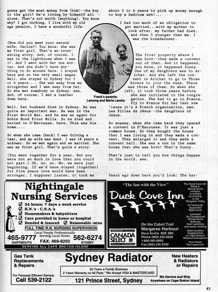 gonna get the most money from (him)--the boy or the girl? He's living by himself all alone. That's not worth (anything). You know why? I got nothing, I live with my old age pension, I have a wonderful life. (How did you meet your second wife, Cecile?) You know, she was my first girl. That's an inter? esting story. And, of course, I was in the lighthouse when I was 17. And I went with her one win? ter. And she didn't have any? thing to do around here. I stayed here and on the very small wages. Well, she stayed in Sydney for 5 or 6 years.... She was away from me altogether and I was away from her. So she met somebody in Sydney, see. And, of course, I met a teacher down here. Frank's Lamong and Well, her husband died in Sydney. He was quite an important man. He was in the First World War, and he was an agent for Robin Hood Flour Mills. So he died and buried in D'Escousse, here.. This was his home.... So when she came (back) I was driving a taxi, and my wife was dead. I was 18 years a widower. So we met again and we married. She was my first girl. That's quite a story. (You went together for a year. But you were not so much in love that you could not part.) Oh, no, no. No, we were just beginning. If we'd have stayed (together) for five years love would have been stronger, I suppose! Listen, it took me Nightingale Nursing Services {21 24 hours; 7 days a week service {2 R.N.'s - C.N.A.'s {21 Homemakers & babysitters x{2l Care provided in home or hospital {21 Bonded & insured {21 Reasonable rates Full time r.n. nursing supervision Local People Professionally 465-9777 'jr*,':':''"'! 562-6274 DARTMOUTH r/KAZ 469-9250 SYDNEY about 5 or 6 years to pick up money enough to buy a bedroom set!... I had too much of an obligation to get married...with my mother to look after, my father had died, and then 5 younger than me. I was the breadwinner. The first property where I was born--they made a convent out of that. And it happened, you know, it happened funny. One of my daughters was to Ar? ichat. And she left the con? vent in Arichat to go to Three Rivers to join the nuns. There was three of them. So when she left, it took three years before ??.??.??*?? she was initiated to the congre- parents: . ?, , , _ Marie Landry gation. She had to go to France, fly to France for her last vow • cause it's a French organization, see. Les Filles de J6sus--the daughters of Jesus. So anyway, when she came back they opened a convent in D'Escousse. It was just a common house. So they bought the house that I was living in and they made a con? vent. They enlarged it and they made a convent hall. She was a nun in the same house that she was born! That's funny. That's just to tell you how things happen in the world, see. Years ago down here you'd look: The har- "The Inn with the View" " "Duck Cove Inrt SERVING ALL CAPE BRETON BLAND CANADA SELEQ B Licensed Air Conditioned Dining Room featuring On the Cabot Trail fresn seafoods _ _ ... and home cookmg Margaree Harbour • ea, vacation Nova Scotia BOE 2B0 headqi Phone (902) 235-2658 PeZed'atmospher. 1-800-565-9993 Your Hosts, Fax (902) 235-2592 The Laurences Gas Tank Replacements & Repairs For Personal Efficient Service: Call 539-2122 Sydney Radiator New Heaters & Radiators or Repairs We Service and Ship 121 Prince Street, Sydney Anywhere on cape Breton Island 20 Years a Family Business 2 Years Warranty on All Parts * We Accept VISA & MASTERCARD 85