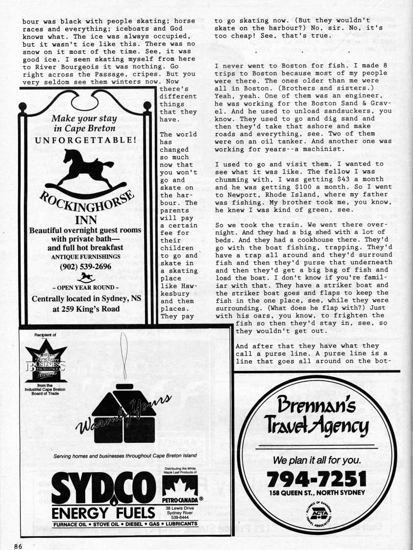 bour was black with people skating: horse races and everything; iceboats and God knows what. The ice was always occupied, but it wasn't ice like this. There was no snow on it most of the time. See, it was good ice. I seen skating myself from here to River Bourgeois it was nothing. Go right across the Passage, cripes. But you very seldom see them winters now. Now {there's different things that they have. Make your stay in Cape Breton UNFORGETTABLE! *OcxSSh09-' INN Beautiful overnight guest rooms with private bath • and full hot breakfast ANTIQUE FURNISHINGS (902) 539-2696 ~ OPEN YEAR ROUND ~ Centrally located in Sydney, NS at 259 King's Road The world has changed so much now that you won't go and skate on the har? bour. The parents will pay a certain fee for their children to go and skate in a skating place like Haw? kesbury and them places. They pay Industrial Cape Breton Board ot Trade Serving homes and businesses througtiout Cape Breton Island ,'''MiBB ' • • i''' .''M j'''' Maple Leaf Products of SYDCO' 38 Lewis Drive Sydney River 539-6444 FURNACE OIL • STOVE OIL • DIESEL • GAS • LUBRICANTS ENERGY FUELS to go skating now. (But they wouldn't skate on the harbour?) No, sir. No, it's too cheap! See, that's true. I never went to Boston for fish. I made 8 trips to Boston because most of my people were there. The ones older than me were all in Boston. (Brothers and sisters.) Yeah, yeah. One of them was an engineer, he was working for the Boston Sand & Grav? el. And he used to unload sandsuckers, you know. They used to go and dig sand and then they'd take that ashore and make roads and everything, see. Two of them were on an oil tanker. And another one was working for years--a machinist. I used to go and visit them. I wanted to see what it was like. The fellow I was chumming with, I was getting $43 a month and he was getting $100 a month. So I went to Newport, Rhode Island, where my father was fishing. My brother took me, you know, he knew I was kind of green, see. So we took the train. We went there over? night. And they had a big shed with a lot of beds. And they had a cookhouse there. They'd go with the boat fishing, trapping. They'd have a trap all around and they'd surround fish and then they'd purse that underneath and then they'd get a big bag of fish and load the boat. I don't know if you're famil- iar with that. They have a striker boat and the striker boat goes and flaps to keep the fish in the one place, see, while they were surrounding. (What does he flap with?) Just with his oars, you know, to frighten the J fish so then they'd stay in, see, so I they wouldn't get out. And after that they have what they call a purse line. A purse line is a line that goes all around on the bot- IrjbijAAqmcii We plan it all for you. 794-7251 158 QUEEN ST., NORTH SYDNEY 86