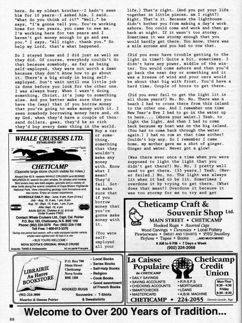 here. So my oldest brother--! hadn't seen him for 10 years--! asked him, ! said, "V/hat do you think of it?" "Well," he says, "!'m gonna tell you. You're working home for two years, you came to see me. !'m working here for ten years and ! haven't got money enough to go and see you." ! says, "All right, thank you." So help my Lord, that's what happened. So ! stayed home and ! did just as well as they did. Of course, everybody couldn't do that because somebody, as far as being self-employed, they were not worth a damn because they don't know how to go about it. There's a big study in being self- employed. Don't wait until one little job is done before you look for the other one. ! was always busy. When ! wasn't doing something, Christ, it's jump to something else. And you better make sure that you have the (way) that if you borrow money that you're going to make money with it. ! seen somebody borrowing money here and, oh my God, when they'd have a couple of thou? sand dollars, geez, they'd be so rich they'd buy every damn thing in the world. Buy a car or some? thing, something that they wouldn't make any money with. Know what ! mean? They'd fail. Got? ta make sure that if you borrow money that you're gonna make money with it. (You were self- employed all your WHALE CRUISERS LTD. ESTABLISHED 1981 CHETICAMP (Opposite large stone church visible for miles.) Aboard the 42 ft. vessels WHALE CRUISER and BONNIE MAUREEN III, search for pilot whales, fin whales and minkes. Bird lovers may see bald eagles, gannets and a variety of other birds along the scenic coastline of Cape Breton Highlands National Park. View interesting geology rock formations and sea caves. Enjoy an ocean experience. SCHEDULE DAILY: May - June, 9 am. 6 pm (3 hrs.) July - Aug. 15, 9 am, 1 pm, 6 pm '''' Aug. 16 - Sept 15, 9 am, 1 pm, 5 pm [ w'l After Sept 15, 4 pm ''' Adults $25.00, Children 6-12, $10.00 Under 6 years FREE Contact: Whale Cruisers Ltd., Capt. Cai. Poirier P.O. Box 183, Cheticamp, N.S. BOE IHO Phone: (902) 224-3376 Fax: (902) 224-1166 Toll Free: 1-800-813-3376 During one period last seasor), witti a radio-equipped spotter vehicle, whales were sighted over 40 trips in a row. • BUS TOURS WELCOME • NOVA SCOTIA'S ORIGINAL WHALE CRUISE Awards: TIANS & Ambassador lei on-parie Frangais life.) That's right. (And you put your life together in little pieces, am ! right?) Right. That's it. Because the lighthouse didn't bother you from making a day's work ashore. You could come and work and then go back at night. !f it wasn't too stormy. Sometimes it was stormy enough that you would hardly get there. You know, there was a mile across and you had to row that. (Did you ever have trouble getting to the light in time?) Quite a bit, sometimes. ! didn't have any power, middle of the win? ter. You would come ashore and then you'd go back the next day or something and it was a breeze of wind and your oars would be about that big with frost. You'd have a hard time. Couple of hours to get there. (Did you ever fail to get the light lit in all those years?) No. No. No. There was a beach ! had to cross there from this island to the other one. And ! remember one time New Year's Eve ! had to go in the water up to here.... (Above your waist.) Yeah, to light the light. And then ! had to come back because my boat was on the big island. (You had to come back through the water again.) ! had no rum at that time either! Couldn't buy any. So I remember ! came home, my mother gave me a shot of ginger. Ginger and water. Never got a glow! (Was there ever once a time when you were supposed to light the light that you didn't get there?) No. No, I pretty well used to get there. (33 years.) Yeah. (Nev? er failed.) No, no. The light was always lit when it had to be lit. Sometimes ! overdone it by trying to get there. (What does that mean?) Overdone it because it was too stormy for me to try and get Cheticamp Craft & Souvenir Shop '*' MAIN STREET • CHETICAMP Hooked Rugs • J'sortedCaps Wood Carvings • Ceramics • Local Pottery Pewterware • SWEAT-AND T-SHIRTS • 'SW. Jeweikry (Btrfutm • Tapes • Books ...and much more! 9 AM to 9 PM • 7 Days a Week (902) 224-2068 (902) 224-3800 Maurice & Simone Poirier ~ Local Books ~ Series Books ~ Self-Help Books ~ Religion ~ Cook Books ~ Good assortment HOOKED RUGS of French Books Souvenirs - T-Shirts & Sweatshirts I |La Caisse Populaire de CHETICAMP • DAILY SAVINGS • SAVING ACCOUNTS • CHECKING ACCOUNTS • SMARTCHECKS • MASTERCARD CHETICAMP • Cheticamp Credit Union • R.R.S.P.S • MORTGAGES • LOANS • A.B.M. MACHINE 224-2055 Dennis Larade, Mgr. Mon-Thur 9:30 - 4:30 Friday 9:30 - 8:30 J Welcome to Over 200 Years of Tradition..