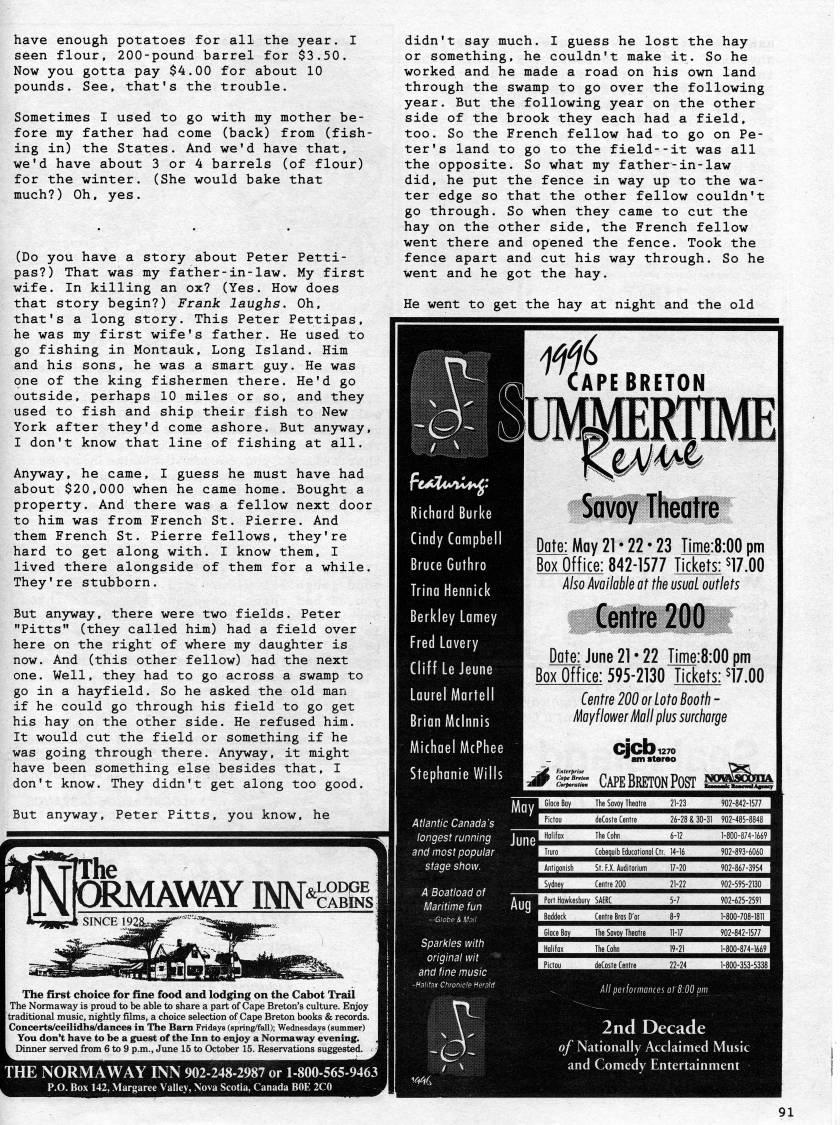 have enough potatoes for all the year. I seen flour, 200-pound barrel for $3.50. Now you gotta pay $4.00 for about 10 pounds. See, that's the trouble. Sometimes I used to go with my mother be? fore my father had come (back) from (fish? ing in) the States. And we'd have that, we'd have about 3 or 4 barrels (of flour) for the winter. (She would bake that much?) Oh, yes. (Do you have a story about Peter Petti- pas?) That was my father-in-law. My first wife. In killing an ox? (Yes. How does that story begin?) Frank laughs. Oh, that's a long story. This Peter Pettipas, he was my first wife's father. He used to go fishing in Montauk, Long Island. Him and his sons, he was a smart guy. He was one of the king fishermen there. He'd go outside, perhaps 10 miles or so, and they used to fish and ship their fish to New York after they'd come ashore. But anyway, I don't know that line of fishing at all. Anyway, he came, I guess he must have had about $20,000 when he came home. Bought a property. And there was a fellow next door to him was from French St. Pierre. And them French St. Pierre fellows, they're hard to get along with. I know them, I lived there alongside of them for a while. They're stubborn. But anyway, there were two fields. Peter "Pitts" (they called him) had a field over here on the right of where my daughter is now. And (this other fellow) had the next one. Well, they had to go across a swamp to go in a hayfield. So he asked the old man if he could go through his field to go get his hay on the other side. He refused him. It would cut the field or something if he was going through there. Anjrway, it might have been something else besides that, I don't know. They didn't get along too good. But anyway, Peter Pitts, you know, he didn't say much. I guess he lost the hay or something, he couldn't make it. So he worked and he made a road on his own land through the swamp to go over the following year. But the following year on the other side of the brook they each had a field, too. So the French fellow had to go on Pe? ter's land to go to the field--it was all the opposite. So what my father-in-law did, he put the fence in way up to the wa? ter edge so that the other fellow couldn't go through. So when they came to cut the hay on the other side, the French fellow went there and opened the fence. Took the fence apart and cut his way through. So he went and he got the hay. He went to get the hay at night and the old Richard Burke Cindy Campbell Bruce Guthro Trina Hennick Berkley Lamey Fred Lavery Cliff Le Jeune Brian Mclnnis Michael McPhee CAPE BRETON Savoy Theatre Date: May 21 • 22 • 23 Time:8:00 pm Box Office: 842-1577 Tickets: '7.00 Also Available at the usrnL outlets Centre 200 Date: June 21 • 22 Iime:8:00 pm Box Office: 595-2130 Tickets: '7.00 Centre 200 or Loto Booth- May flower Mall plus surcharge CJCbl270 * am stereo '' Cape Breton Post 221' Glace Bay Pictou Halifax Truro Antigonisti Sydney The Savoy Theatre deCoste Centre The Cohn Cobequib Educational Ctr St. F.X. Auditorium Centre 200 Port Hawkesbury SAERC Boddeclc Gloc'o'' Halifax Pictou Centre Bras D'or The Savoy Theatre The Cohn deCoste Centre 21-23 26-28 & 30-31 6-12 14-16 17-20 21-22 5-7 8-9 11-17 19-21 22-24 902-842-1577 902-485-8848 1-800-874-1669 902-893-6060 902-867-3954 902-595-2130 902-625-2591 1-800-708-1811 902-842-1577 1-800-874-1669 1-800-353-5338 The first choice for fine food and lodging on the Cabot Trail The Normaway is proud to be able to share a part of Cape Breton's culture. Enjoy traditional music, nightly fQms, a choice selection of Cape Breton books & records. Concerts/ceilidhs/dances in The Bam Fridays (spring/fall); Wednesdays (summer) You don't have to be a guest of the Inn to enjoy a Normaway evening. Dinner served from 6 to 9 p.m., June 15 to October 15. Reservations suggested. THE NORMAWAY INN 902-248-2987 or 1-800-565-9463 I 2nd Decade of Nationally Acclaimed Music and Comedy Entertainment