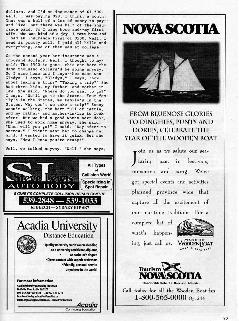 dollars. And I'd an insurance of $1,500. Well, I was paying $28, I think, a month. That was a hell of a lot of money to pay-- and live. But there was half of the insu? rance paid. So I came home and--my first wife, she was kind of a joy--I came home and I had an insurance first of $500. Well, I owed it pretty well. I paid all bills and everything, one of them was at college. So the second year her insurance was a thousand dollars. Well, I thought to my? self: The $500 is gone, this one here the damn thousand dollars'd be going anyway. So I came home and I says--her name was "Gladys," I says, "how trip?" "Taking a trip?" She my father- and mother-in- "Where do you want to go?" go to the States. Your fam? ily's in the States, my family's in the States. Why don't we take a trip?" Sonny wasn't walking, the barn full of cattle, and my father- and mother-in-law to look after. But we had a good woman next door, she used to work home anyway. She said, "When will you go?" I said, "Day after to? morrow." I didn't want her to change her mind. I wanted to have it quick. But she says, "Now I know you're crazy!" Well, we talked anyway. "Well," she says. Gladys--I says, about taking a had three kids, law. She said, I says, "We'll Ail Types of Collision Work! Specializing Spot Repaii 3 SYDNEY'S COMPLETE COLLISION REPAIR CENTRE 539-2848 • 539-1033 61 BEECH • SYDNEY BIP 6R7 Acadia University Distance Education • Quality university credit courses leading to a university certificate, diploma, * or bachelor's degree • Direct contact with superb professors • Friendly, personal service anywhere in the worid! For more information Acadia University Continuing Education WolMlle, Nova Scotia BOP 1X0 902 542-2201 ext 1434 Fax 902 542-3715 Emailcontinuing.education??aaidiau.ca WWWIittp://dMgonjicadiau.ca/~conted/conted.titml Acadia Continuing Education IfiCfVASCOnA FROM BWENOSE GEORIES TO DINGHIES, PUNTS AND DORIES, CEEEBRATE THE YEAR OF THE WOODEN BOAT Join us as we salute our sea- raring past in restivals, museums and song. We've got special events and activities planned province wide tnat capture all tne excitement or our maritime traditions. For a complete list of ./f'fc;'. wnat's nappen- 11 - . ;.YEAROFTHE mg, )ust call us. WGDDENBOAT Tbiirism''Ii Honourable Robert S. Harrison, Minister Call today tor all tlie 'OC'oaen Boat tin, 1-800-565-0000 Op. 244