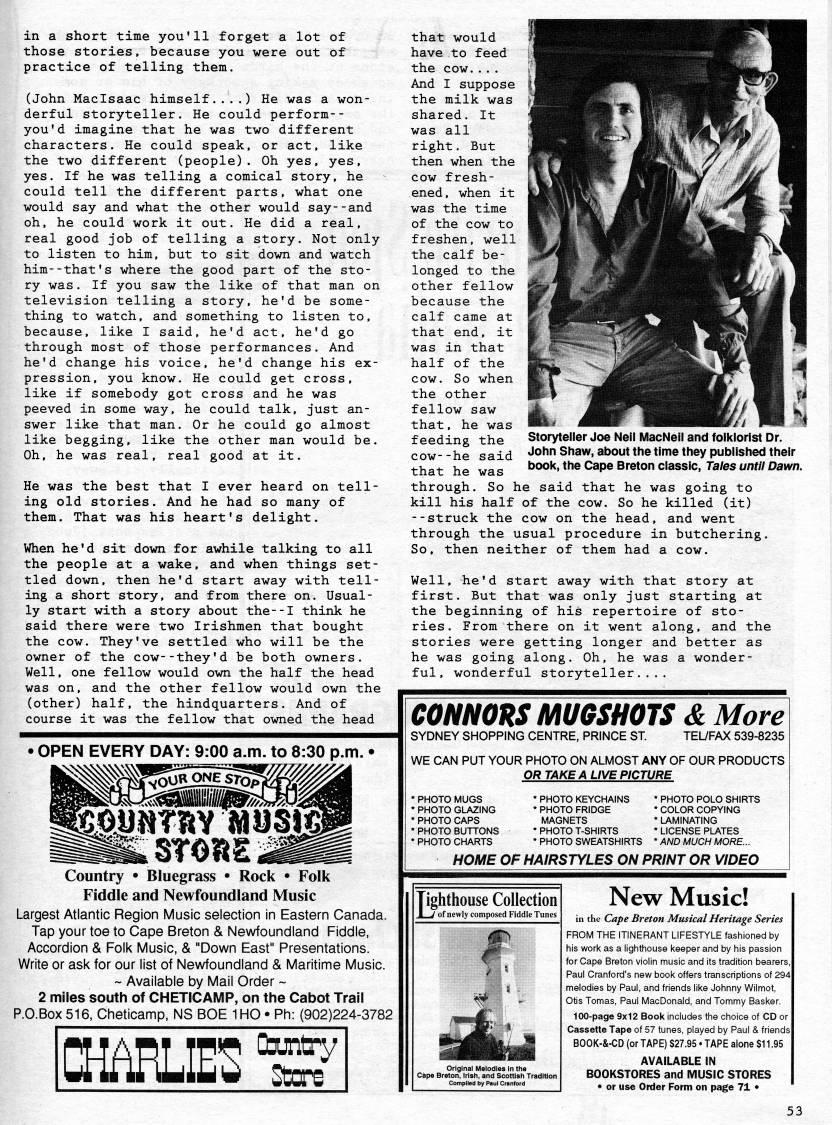Published by Ronald Caplan on 1996/12/1 (244 reads)in a short time you'll forget a lot of those stories, because you were out of practice of telling them. (John Maclsaac himself....) He was a won? derful storyteller. He could perform-- you'd imagine that he was two different characters. He could speak, or act, like the two different (people). Oh yes, yes, yes. If he was telling a comical story, he could tell the different parts, what one would say and what the other would say--and oh, he could work it out. He did a real, real good job of telling a story. Not only to listen to him, but to sit down and watch him--that's where the good part of the sto? ry was. If you saw the like of that man on television telling a story, he'd be some? thing to watch, and something to listen to, because, like I said, he'd act, he'd go through most of those performances. And he'd change his voice, he'd change his ex? pression, you know. He could get cross, like if somebody got cross and he was peeved in some way, he could talk, just an? swer like that man. Or he could go almost like begging, like the other man would be. Oh, he was real, real good at it. He was the best that I ever heard on tell? ing old stories. And he had so many of them. That was his heart's delight. When he'd sit down for awhile talking to all the people at a wake, and when things set? tled down, then he'd start away with tell? ing a short story, and from there on. Usual? ly start with a story about the--I think he said there were two Irishmen that bought the cow. They've settled who will be the owner of the cow--they'd be both owners. Well, one fellow would own the half the head was on, and the other fellow would own the (other) half, the hindquarters. And of course it was the fellow that owned the head • OPEN EVERY PAY: 9:00 a.m. to 8:30 p.m. Country • Bluegrass • Rock • Folk Fiddle and Newfoundland Music Largest Atlantic Region Music selection in Eastern Canada. Tap your toe to Cape Breton & Newfoundland Fiddle, Accordion & Folk Music, & "Down East" Presentations. Write or ask for our list of Newfoundland & Maritime Music. ~ Available by Mail Order ~ 2 miles south of CHETICAMP, on the Cabot Trail P.O.Box 516, Cheticamp, NS BOE 1H0 • Ph: (902)224-3782 that would have to feed the cow.... And I suppose the milk was shared. It was all right. But then when the cow fresh? ened, when it was the time of the cow to freshen, well the calf be? longed to the other fellow because the calf came at that end, it was in that half of the cow. So when the other fellow saw that, he was feeding the Storyteller Joe Nell MacNeil and foiklorist Dr. cow--he said Jolm Shaw, about the time they published their that he was book, the Cape Breton classic. Tales until Dawn. through. So he said that he was going to kill his half of the cow. So he killed (it) --struck the cow on the head, and went through the usual procedure in butchering. So, then neither of them had a cow. Well, -he'd start away with that story at first. But that was only just starting at the beginning of his repertoire of sto? ries. From there on it went along, and the stories were getting longer and better as he was going along. Oh, he was a wonder? ful, wonderful storyteller.... CONNOnS MUOSHOTS & More SYDNEY SHOPPING CENTRE, PRINCE ST. TEL/FAX 539-8235 WE CAN PUT YOUR PHOTO ON ALMOST ANY OF OUR PRODUCTS OR TAKE A LIVE PICTURE * PHOTO MUGS * PHOTO GLAZING * PHOTO CAPS * PHOTO BUTTONS * PHOTO CHARTS * PHOTO KEYCHAINS * PHOTO FRIDGE MAGNETS * PHOTO T-SHIRTS * PHOTO POLO SHIRTS * COLOR COPYING * LAMINATING * LICENSE PLATES * PHOTO SWEATSHIRTS ' AND MUCH MORE... HOME OF HAIRSTYLES ON PRINT OR VIDEO lighthouse Collection I V of newly composed Fiddle Tunes Original Melodies In the cape Breton, Irish, and Scottish Tradition Compiled by Paul Cranford New Music! in the Cape Breton Musical Heritage Series FROM THE ITINERANT LIFESTYLE fashioned by his work as a lighthouse keeper and by his passion for Cape Breton violin music and its tradition bearers, Paul Cranford's new book offers transcriptions of 294 melodies by Paul, and friends like Johnny Wilmot, Otis Tomas, Paul MacDonald, and Tommy Basker. 100-page 9x12 Book includes the choice of CD < Cassette Tape of 57 tunes, played by Paul & friends BOOK-&-CD (or TAPE) $27.95 • TAPE alone $11.95 AVAILABLE IN BOOKSTORES and MUSIC STORES • or use Order Form on page 71 • 53
