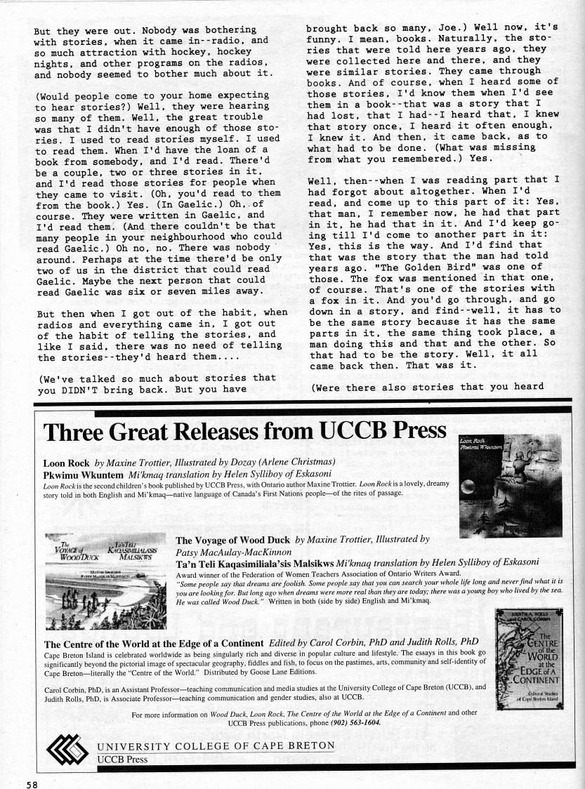 Published by Ronald Caplan on 1996/12/1 (194 reads)But they were out. Nobody was bothering with stories, when it came in--radio, and so much attraction with hockey, hockey nights, and other programs on the radios, and nobody seemed to bother much about it. (Would people come to your home expecting to hear stories?) Well, they were hearing so many of them. Well, the great trouble was that I didn't have enough of those sto? ries. I used to read stories myself. I used to read them. When I'd have the loan of a book from somebody, and I'd read. There'd be a couple, two or three stories in it, and I'd read those stories for people when they came to visit. (Oh, you'd read to them from the book.) Yes. (In Gaelic.) Oh,.of course. They were written in Gaelic, and I'd read them. (And there couldn't be that many people in your neighbourhood who could read Gaelic.) Oh no, no. There was nobody around. Perhaps at the time there'd be only two of us in the district that could read Gaelic. Maybe the next person that could read Gaelic was six or seven miles away. But then when I got out of the habit, when radios and everything came in, I got out of the habit of telling the stories, and like I said, there was no need of telling the stories--they'd heard them.... (We've talked so much about stories that you DIDN'T bring back. But you have brought back so many, Joe.) Well now, it's funny. I mean, books. Naturally, the sto? ries that were told here years ago, they were collected here and there, and they were similar stories. They came through books. And of course, when I heard some of those stories, I'd know them when I'd see them in a book--that was a story that I had lost, that I had--I heard that, I knew that story once, I heard it often enough, I knew it. And then, it came back, as to what had to be done. (What was missing from what you remembered.) Yes. Well, then--when I was reading part that I had forgot about altogether. When I'd read, and come up to this part of it: Yes, that man, I remember now, he had that part in it, he had that in it. And I'd keep go? ing till I'd come to another part in it; Yes, this is the way. And I'd find that that was the story that the man had told years ago. "The Golden Bird" was one of those. The fox was mentioned in that one, of course. That's one of the stories with a fox in it. And you'd go through, and go down in a story, and find--well, it has to be the same story because it has the same parts in it, the same thing took place, a man doing this and that and the other. So that had to be the story. Well, it all came back then. That was it. (Were there also stories that you heard Three Great Releases from UCCB Press Loon Rock by Maxine Trottier, Illustrated by Dozay (Arlene Christmas) Pkwimu Wkuntem Mi'kmaq translation by Helen Sylliboy of Eskasoni Loon Rock is the second children's book published by UCCB Press, with Ontario author Maxine Trottier. Loon Rock is a lovely, dreamy story told in both English and Mi'kmaq • native language of Canada's First Nations people • of the rites of passage. The Voyage of Wood Duck by Maxine Trottier, Illustrated by Patsy MacAulay-MacKinnon Ta'n Teli Kaqasimiliala'sis Malsikws Mi'kmaq translation by Helen Sylliboy of Eskasoni Award winner of the Federation of Women Teachers Association of Ontario Writers Award. "Some people say that dreams are foolish. Some people say that you can search your whole life long and never find what it is you are looking for. But long ago when dreams were more real than they are today; there was a young hoy who lived by th-e sea. He was called Wood Duck." Written in both (side by side) English and Mi'kmaq. 'iMifi The Centre of the World at the Edge of a Continent Edited by Carol Corbin, PhD and Judith Rolls, PhD Cape Breton Island is celebrated worldwide as being singularly rich and diverse in popular culture and lifestyle. The essays in this book go significantly beyond the pictorial image of spectacular geography, fiddles and fish, to focus on the pastimes, arts, community and self-identity of Cape Breton • literally the "Centre of the World." Distributed by Goose Lane Editions. Carol Corbin, PhD, is an Assistant Professor • teaching communication and media studies at the University College of Cape Breton (UCCB), and Judith Rolls, PhD, is Associate Professor • teaching communication and gender studies, also at UCCB. For more informadon on Wood Duck, Loon Rock, The Centre of the World at the Edge of a Continent and other UCCB Press publications, phone (902) 563-1604. UNIVERSITY COLLEGE OF CAPE BRETON UCCB Press 58