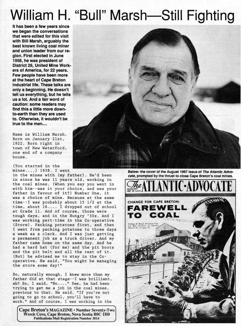 William H. "Bull" Marsh • Still Fighting It has been a few years since we began the conversations that were edited for this visit with Bill Marsh, arguably the best known living coal miner and union leader from our re? gion. First elected in June 1958, he was president of District 26, United Mine Work? ers of America, for 22 years. Few people have been more at the heart of Cape Breton industrial life. These talks are only a beginning. He doesn't tell us everything, but he tells us a lot. And a fair word of caution: some readers may find this a little more down- to-earth than they are used to. otherwise, it wouldn't be true to the man.... Name is William Marsh. Born on January 21st, 1922. Born right in town of New Waterford, one end of a company house. (You started in the mines....) 1938. I went in the mines with (my father). He'd been in since he was 11 years old, working in the coal mines. (When you say you went in with him--was it your choice, and was your father in favour of it?) Number One, it was a choice of mine. Because at the same time--I was probably about 15 1/2 at the time, about 16.... I dropped out of school at Grade 11. And of course, those were tough days, and in the Hungry '30s. And I was working part-time in the Co-operative (Store). Packing potatoes first, and then I went from packing potatoes to three days a week as a clerk. And I was just getting a permanent job as a truck driver. And my father came home on the same day. And he had a hard hat (for me) and the pit boots and the pit belt and all the rest of it. (But) he advised me to stay in the Co? operative. He said, "You might be managing the store some day!" So, naturally enough, I knew more than my father did at that stage--I was brilliant, eh? So, I said, "No...." See, he had been trying to get me a job in the coal mines, previous to that. He said, "If you're not going to go to school, you'll have to work." And of course, I was working in the Below: the cover of the August 1967 Issue of The Atlantic Advo? cate, prompted by the thrust to close Cape Breton's coal mines. g'ATUNTIC-ADVOCATE CHANGE FOR CAPE BRETON; Cape Breton's MAGAZINE • Number Seventy-Two Wreck Cove, Cape Breton, Nova Scotia BOC IHO Publications Mail Registration Number 3014