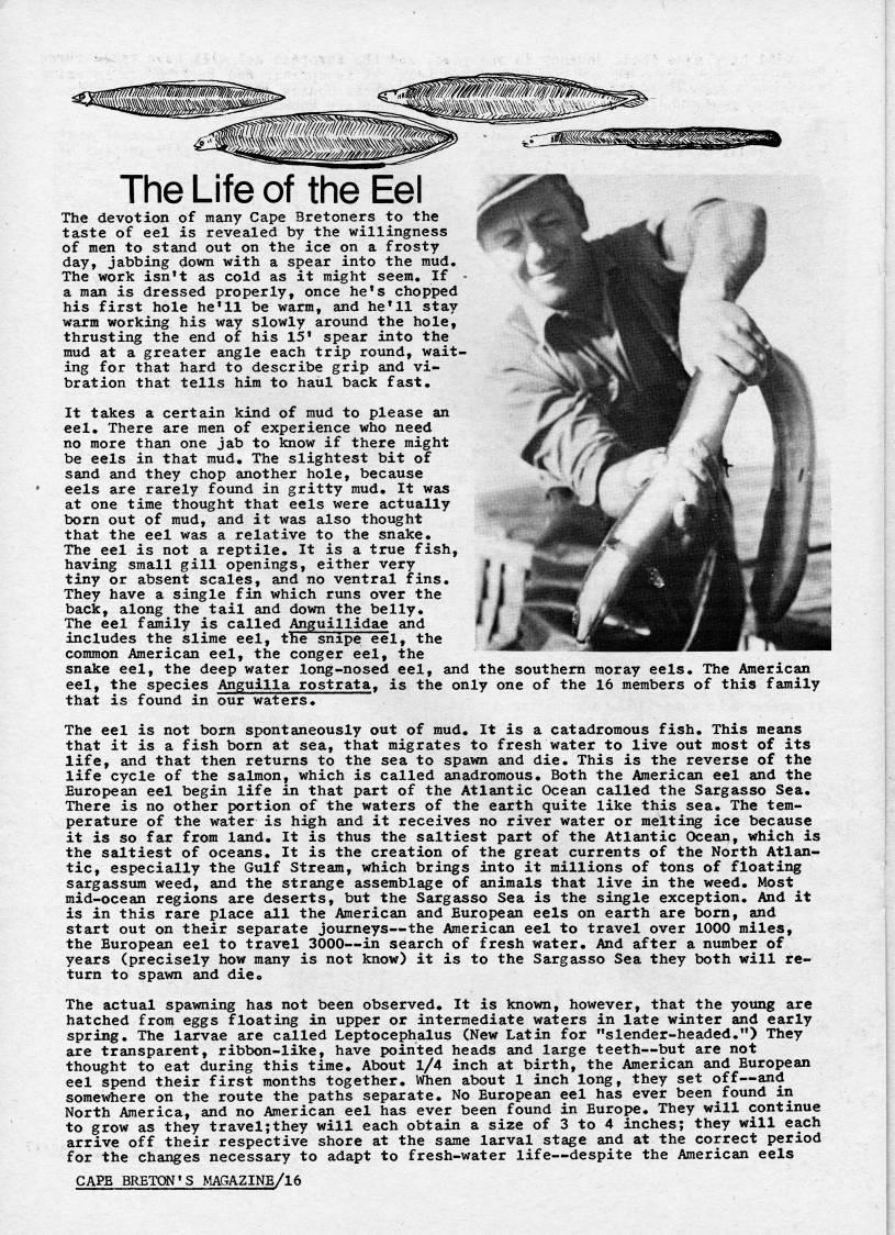 Published by Ronald Caplan on 1973/3/1 (4725 reads)The Life of the Eel The devotion of many Cape Bretoners to the taste of eel is revealed by the willingness of men to stand out on the ice on a frosty day, jabbing down with a spear into the mud. The work isn't as cold as it might seem. If - a man is dressed properly, once he's chopped his first hole he'll be warm, and he'll stay warm working his way slowly around the hole, thrusting the end of his 15' spear into the mud at a greater angle each trip round, wait? ing for that hard to describe grip and vi? bration that tells him to haul back fast. It takes a certain kind of mud to please an eel. There are men of experience who need no more than one jab to know if there might be eels in that mud. The slightest bit of sand and they chop another hole, because eels are rarely found in gritty mud. It was at one time thought that eels were actually born out of mud, and it was also thought that the eel was a relative to the snake. The eel is not a reptile. It is a true fish, having small gill openings, either very tiny or absent scales, and no ventral fins. They have a single fin which runs over the back, along the tail and down the belly. The eel family is called Anguillidae and includes the slime eel, the snipe eel, the common American eel, the conger eel, the snake eel, the deep water long-nosed eel, and the southern moray eels. The American eel, the species Anguilla rostrata, is the only one of the 16 members of this family that is found in our waters. The eel is not born spontaneously out of mud. It is a catadromous fish. This means that it is a fish born at sea, that migrates to fresh water to live out most of its life, and that then returns to the sea to spawn and die. This is the reverse of the life cycle of the salmon, which is called anadromous. Both the American eel and the European eel begin life in that part of the Atlantic Ocean called the Sargasso Sea. There is no other portion of the waters of the earth quite like this sea. The tem? perature of the water is high and it receives no river water or melting ice because it is so far from land. It is thus the saltiest part of the Atlantic Ocean, which is the saltiest of oceans. It is the creation of the great currents of the North Atlan? tic, especially the Gulf Stream, which brings into it millions of tons of floating sargassum weed, and the strange assemblage of animals that live in the weed. Most mid-ocean regions are deserts, but the Sargasso Sea is the single exception. And it is in this rare place all the American and European eels on earth are born, and start out on their separate journeys • the American eel to travel over 1000 miles, the European eel to travel 3000 • in search of fresh water. And after a number of years (precisely how many is not know) it is to the Sargasso Sea they both will re? turn to spawn and die. The actual spawning has not been observed. It is known, however, that the young are hatched from eggs floating in upper or intermediate waters in late winter and early spring. The larvae are called Leptocephalus (New Latin for "slender-headed,") They are transparent, ribbon-like, have pointed heads and large teeth • but are not thought to eat during this time. About l/4 inch at birth, the American and European eel spend their first months together. When about 1 inch long, they set off • and somewhere on the route the paths separate. No European eel has ever been found in North America, and no American eel has ever been found in Europe. They will continue to grow as they travel;they will each obtain a size of 3 to 4 inches; they will each arrive off their respective shore at the same larval stage and at the correct period for the changes necessary to adapt to fresh-water life • despite the American eels CAPE BRETON'S MAGAZINE/16